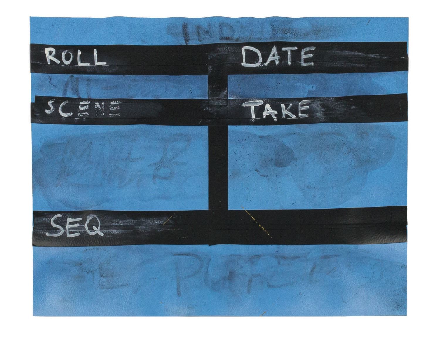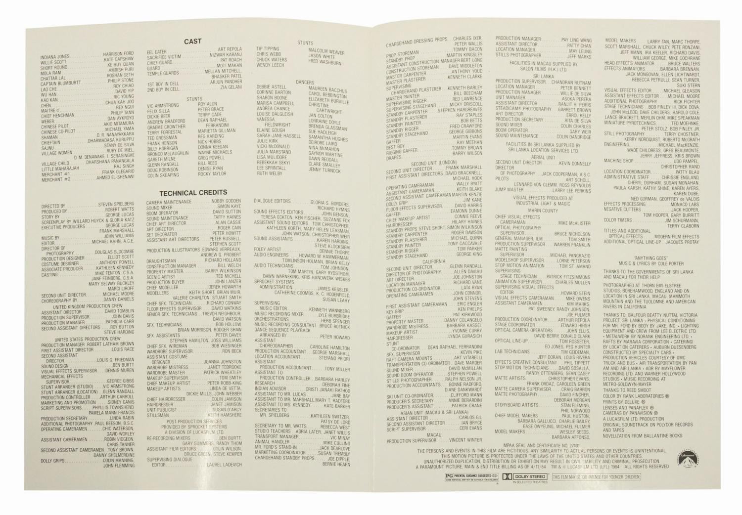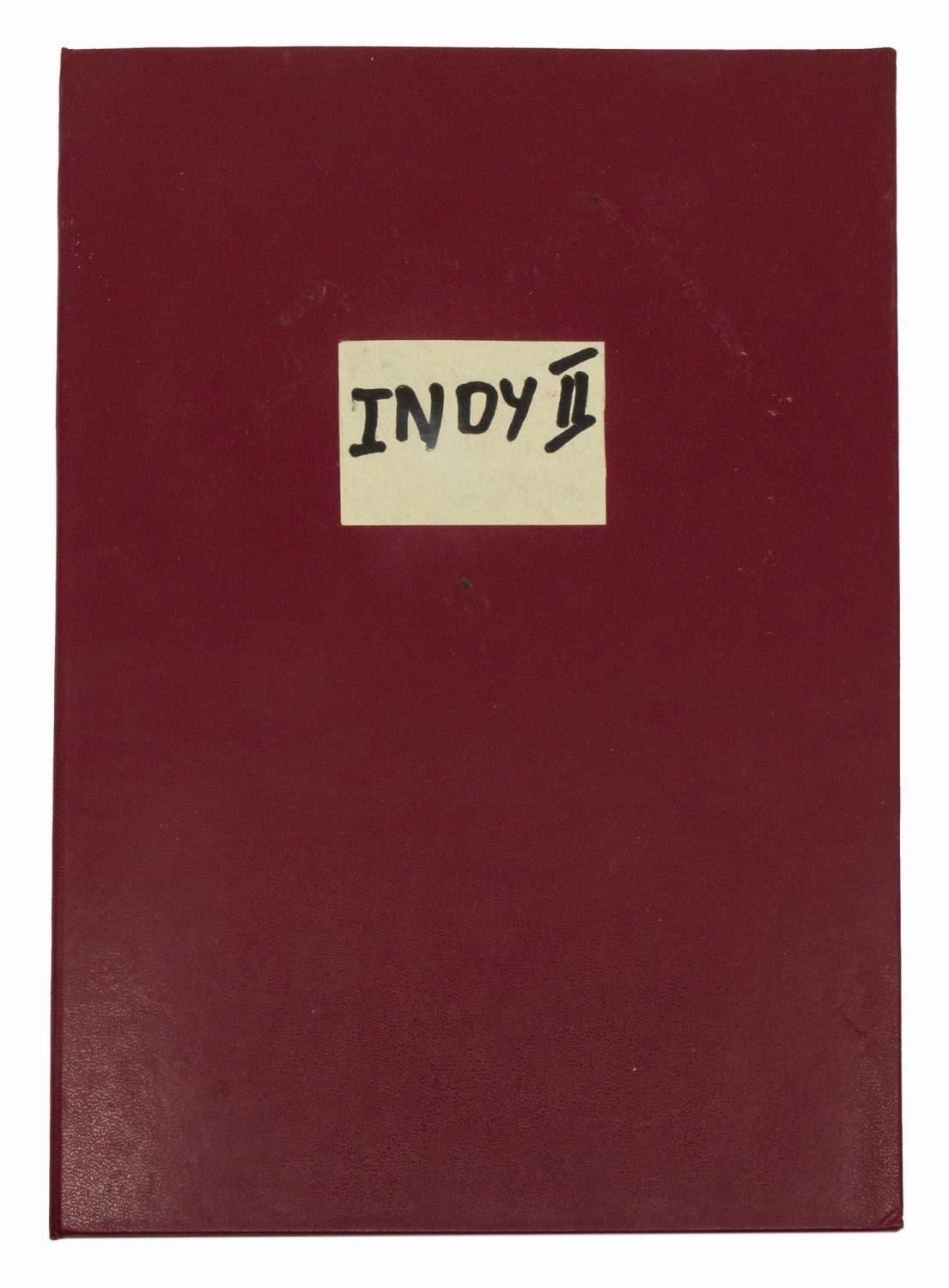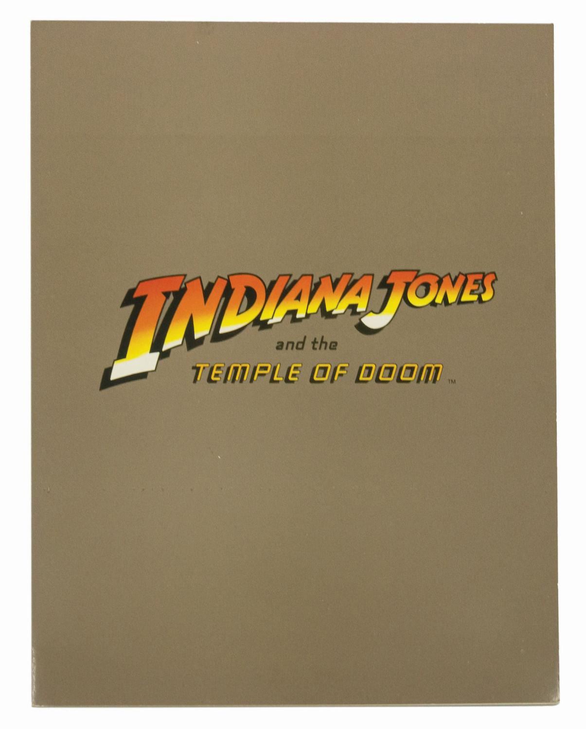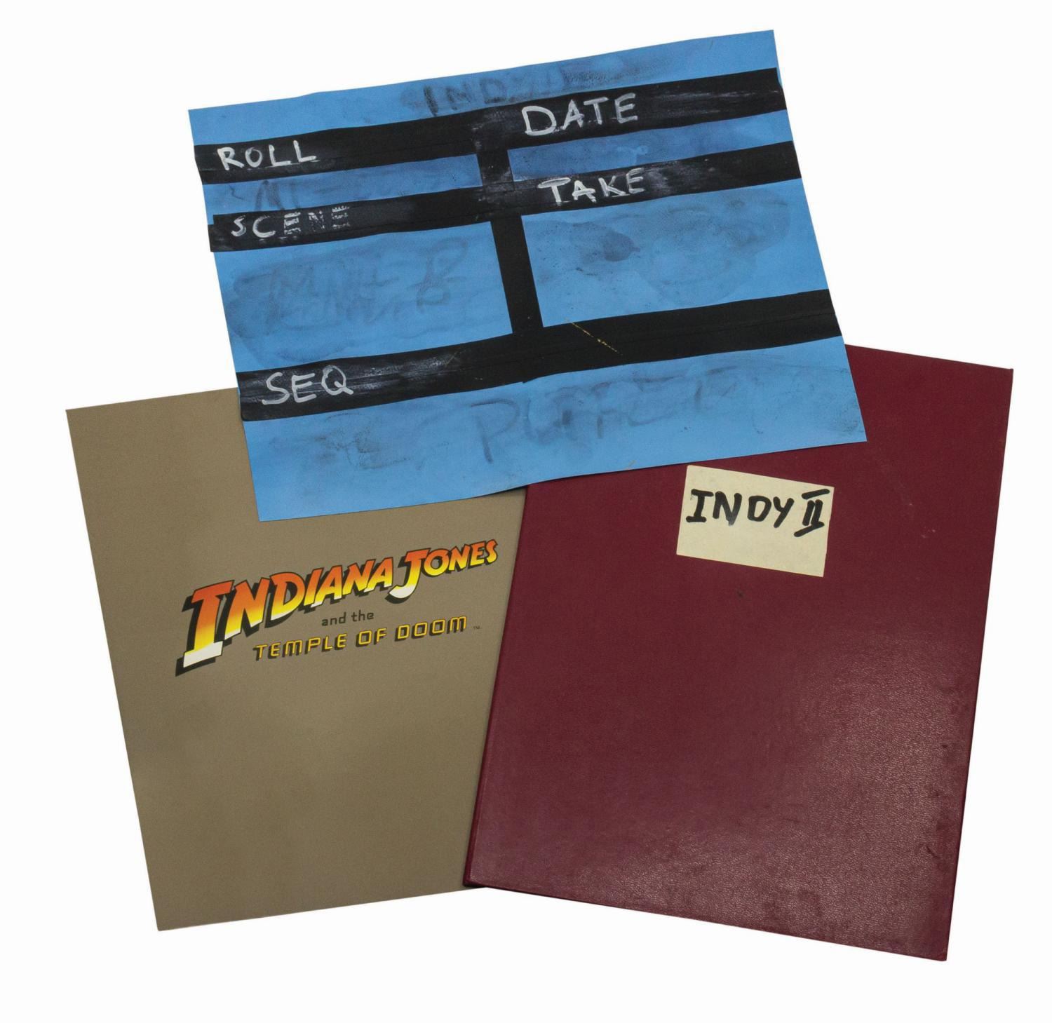 (Paramount, 1984) A production folder, a slate, and a program from Indiana Jones and the Temple of Doom, from the collection of a former studio employee. The burgundy leather folder has a window cut on the front cover with "Indy II" written in. The vinyl slate was used for ILM produced special effects shots. The bi-fold cardstock program lists the cast and crew of film. Ranging in size from 11"x8.5" to 12.25"x8.75", the pieces are in generally good condition with minor production handling.