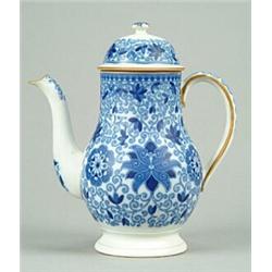 A Tendril pattern coffee pot, of inverted baluster shape with domed cover and button knop and with ochre lining to rim, spout and handle, printed in blue with the stylised design of flowerheads and tendrils, overall height 21.2cm, unmarked, circa 1805-20 (restoration to cover and tip of spout)