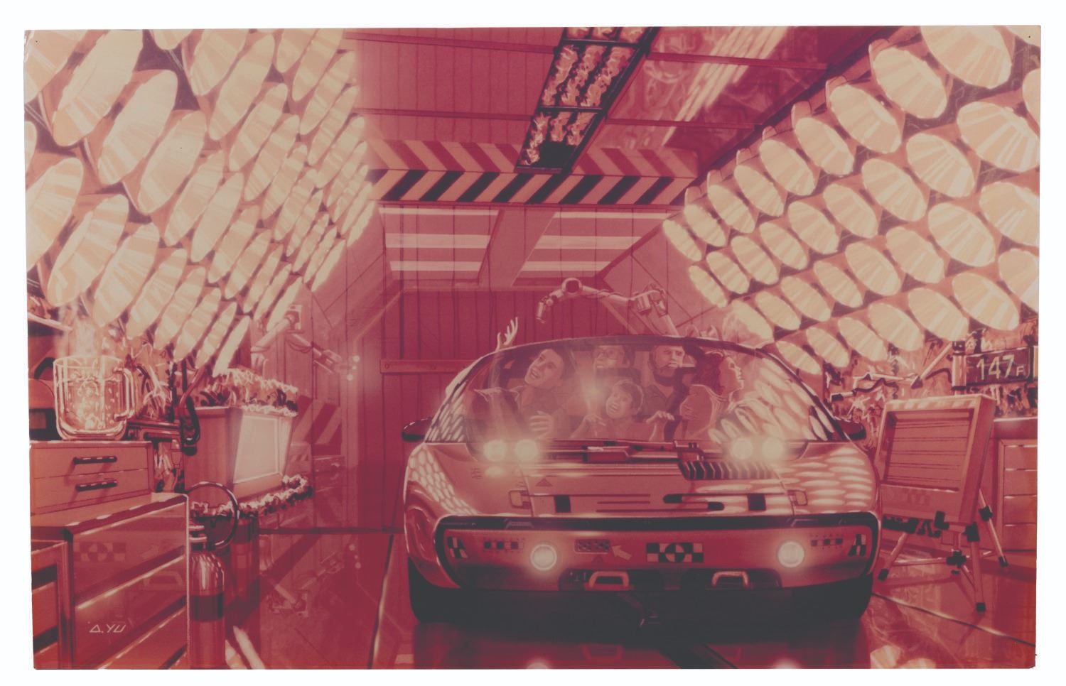 (Epcot, 1996-99) A print of concept art for the Test Track Environmental Chamber by Al Yu. The concept was displayed at the Test Track Preview Area in Epcot and depicts Guests in a Heat Chamber. Measuring 25.5" x 40" on foamcore, the concept displays in good condition with edge wear, creasing, discoloration from age, and pinholes from Park use.