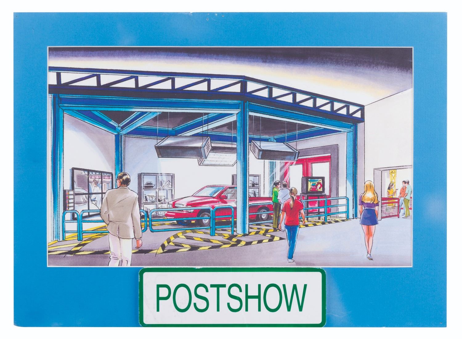 (Epcot, 1996) A print of concept art for the Test Track post show, displayed at the Test Track Preview Area in Epcot. The GM-sponsored attraction ended with interactive demonstrations and vehicle displays, further highlighting the company’s commitment to safety and quality, as well as multimedia presentations, and an opportunity to purchase automotive-themed merchandise. Measuring 9.75" x 16.75" matted and mounted to 14.25" x 19.25" foamcore, the pitch board displays in very good condition with light edge wear, creasing, and pinholes from use.