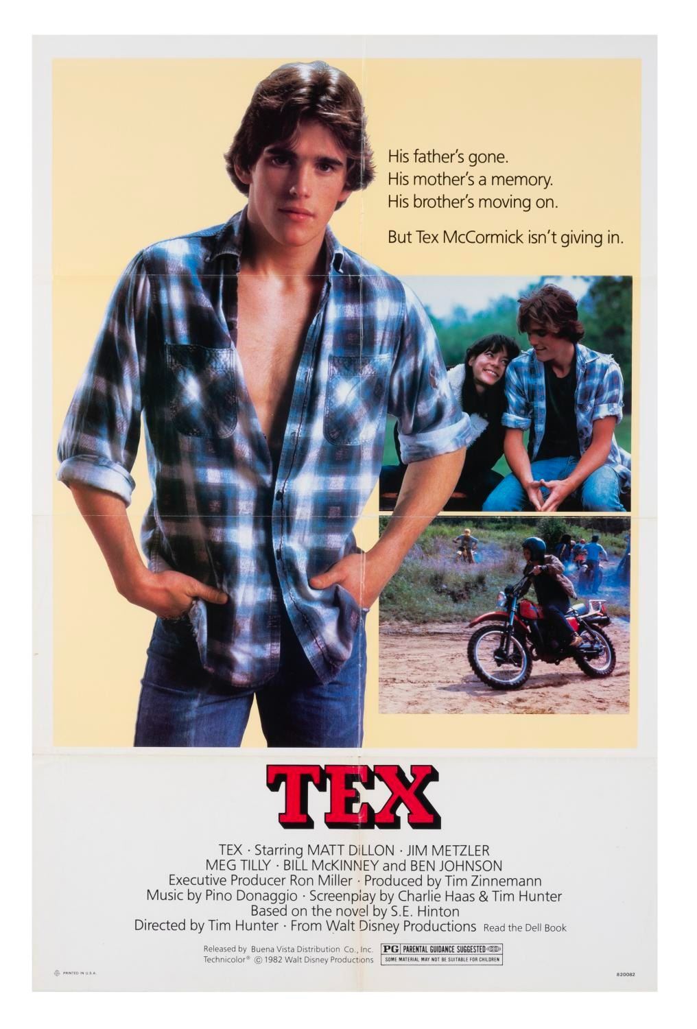 (Disney, 1982) A one-sheet poster for the original theatrical release of "Tex," starring Matt Dillon and Meg Tilly. Measuring 27" x 41", the poster is in very good condition with typical wear and creases along the original folds, slight separation at center fold points, and light handling wear and slight soiling overall.