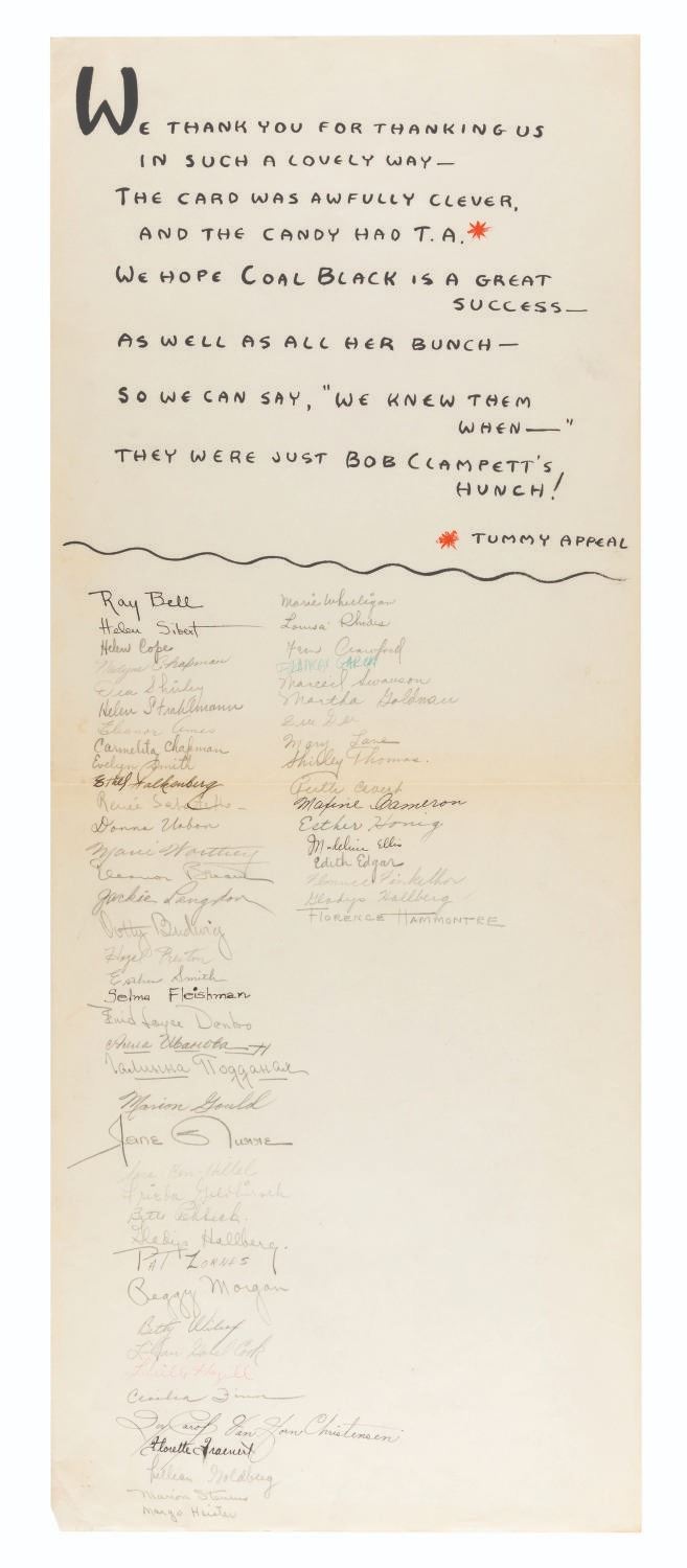 (Schlesinger, 1942-43) A thank you card from the Ink and Paint department to Bob Clampett. In verse, they thank him for a card and candy, and give hope that “Coal Black and de Sebben Dwarfs,” not yet released, would have great and lasting success. The short is the most notorious film on the “Censored Eleven” list of cartoons removed from general release by Warner Brothers. The card is signed in ink or pencil by 56 staff members, many exhibiting exquisite penmanship. Measuring 9.5” x 24”, the card is in very good condition with light handling wear, a crease to the bottom left corner, and light wear from age.