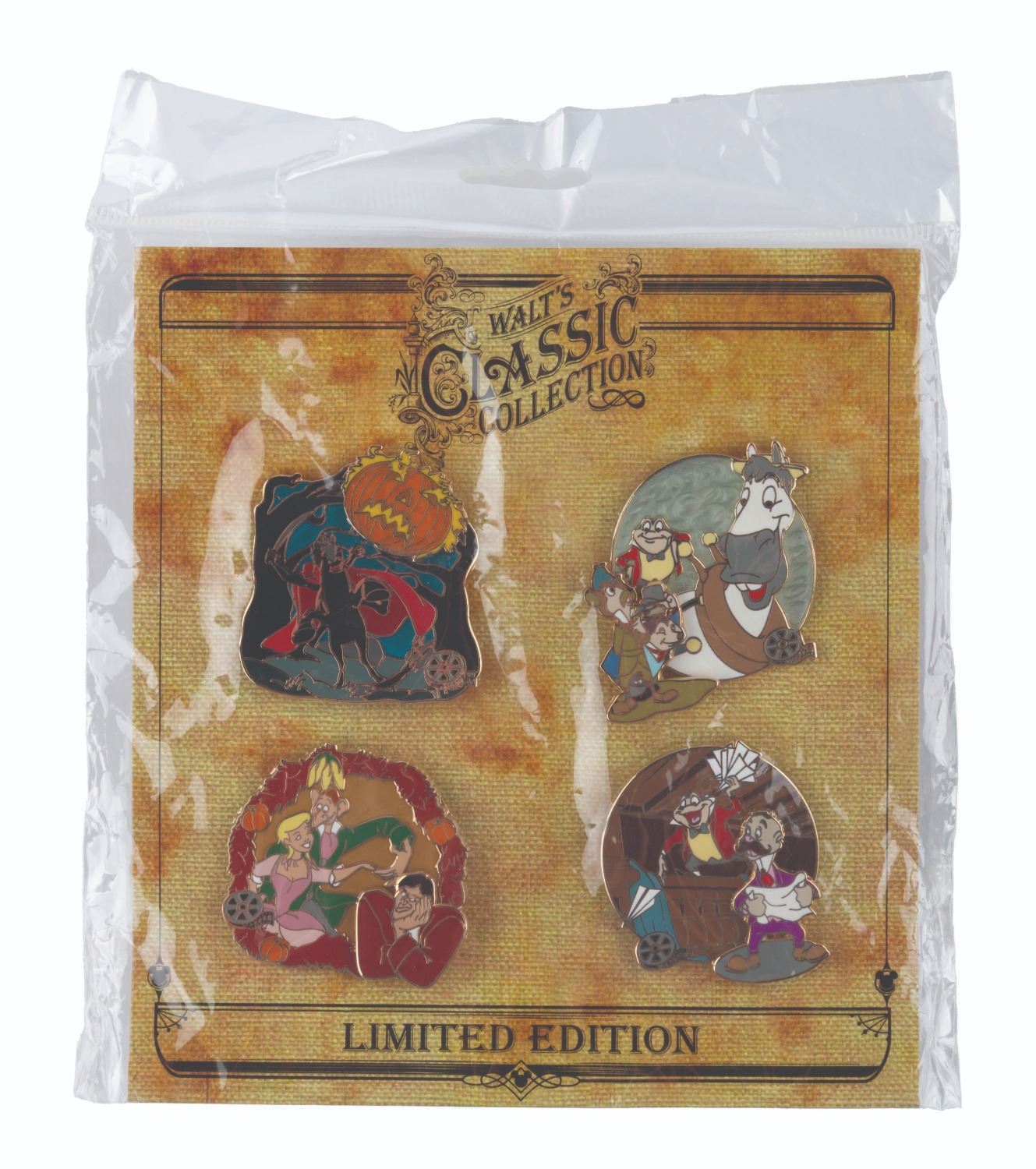 (Disney Parks, 2010) A set of four"The Adventures of Ichabod and Mr. Toad" pins. Limited to an edition of 2000, this set was the August release in the monthly"Walt's Classic Collection" series. The set is in fine condition on the original card.
