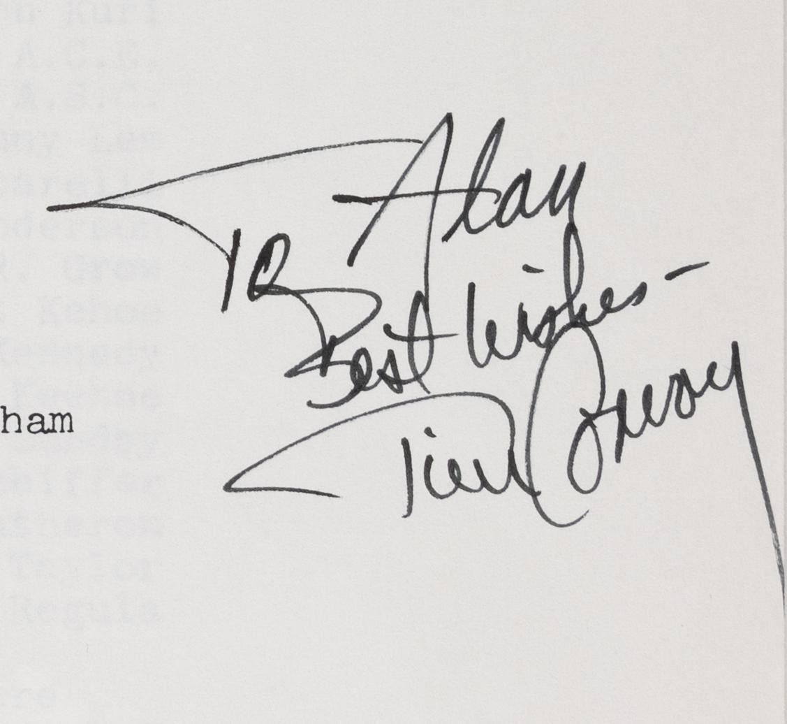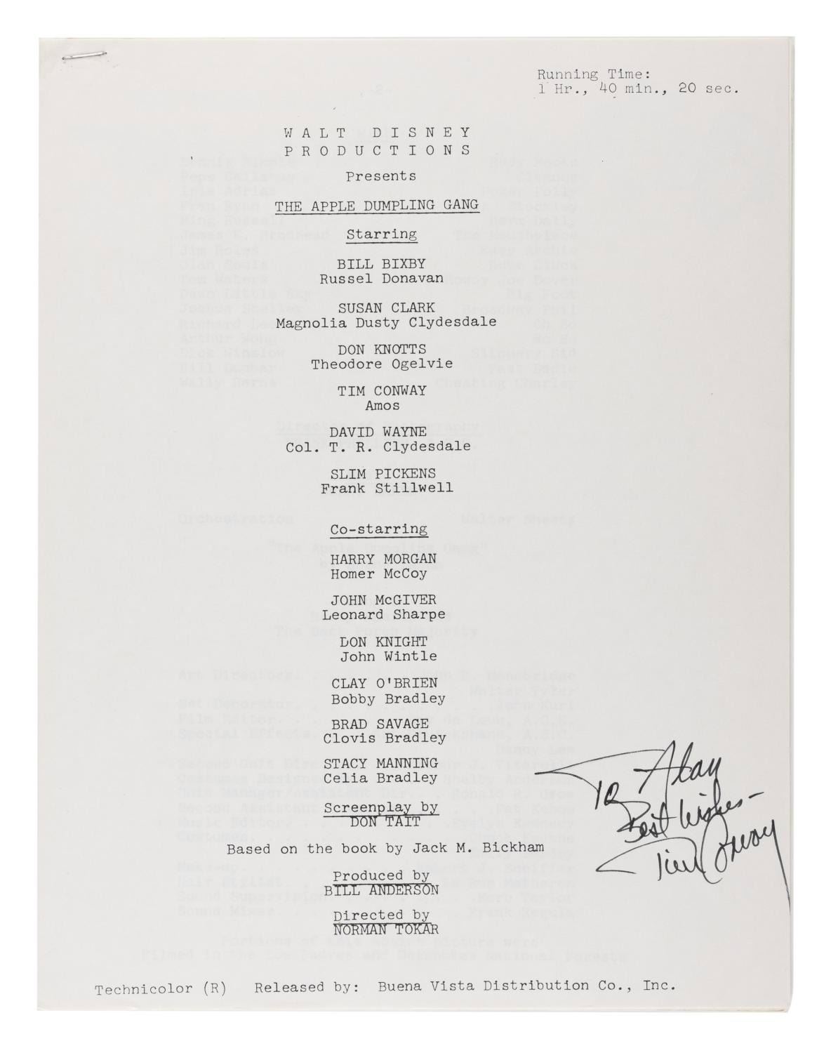 (Disney, 1975) A press packet for "The Apple Dumpling Gang" signed with dedication by the film's star Tim Conway. The nine-page packet includes credits, production information, cast biographies, and the story of the film. Measuring 8.5" x 11", the signed packet is in very good condition, with typical light wear from use.
