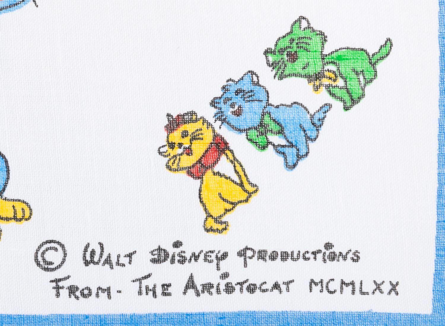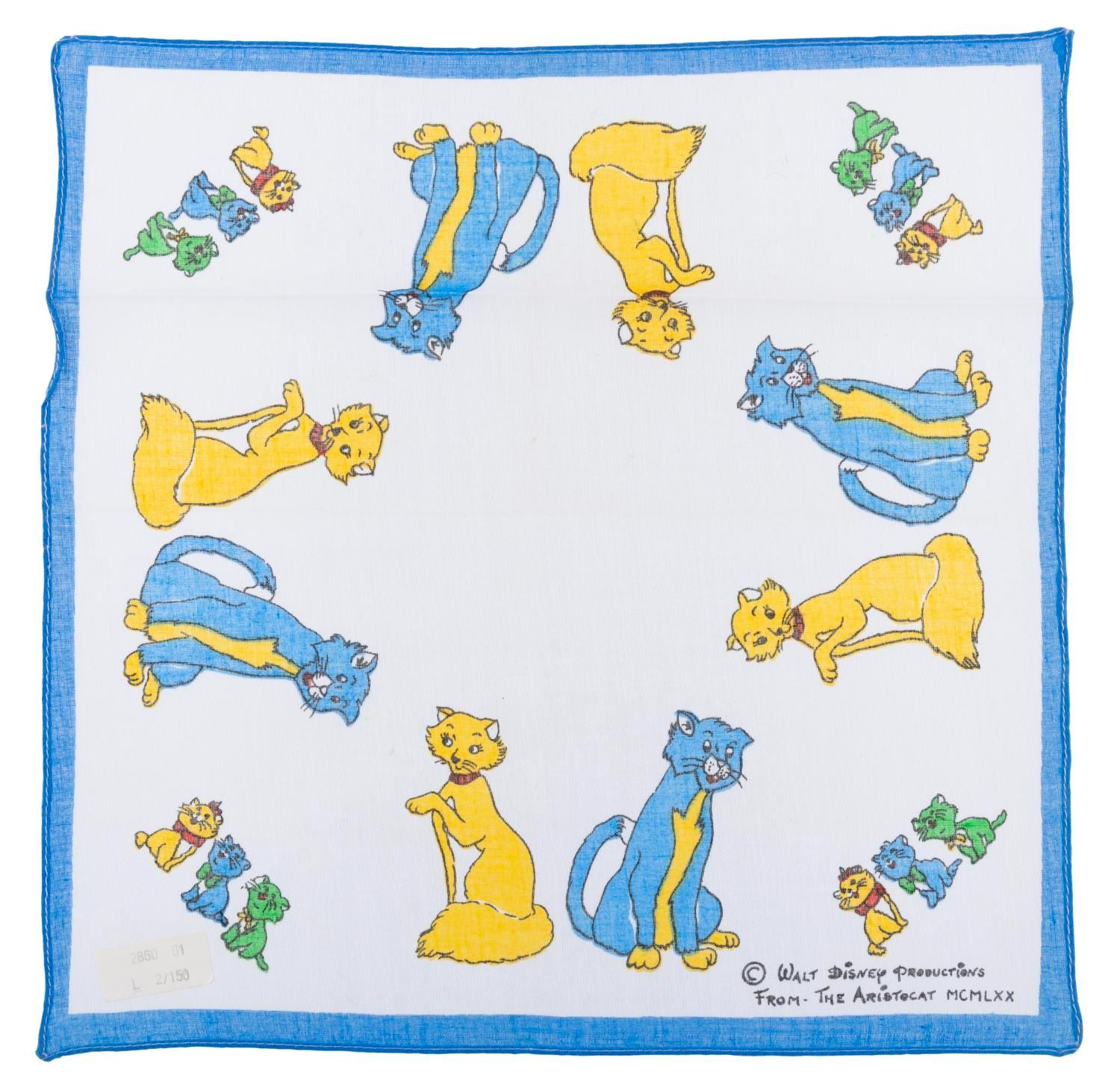 (Disney, 1970s) A handkerchief featuring the cast of "The Aristocats." Measuring 11" x 11", the handkerchief is in very good condition with light wear.