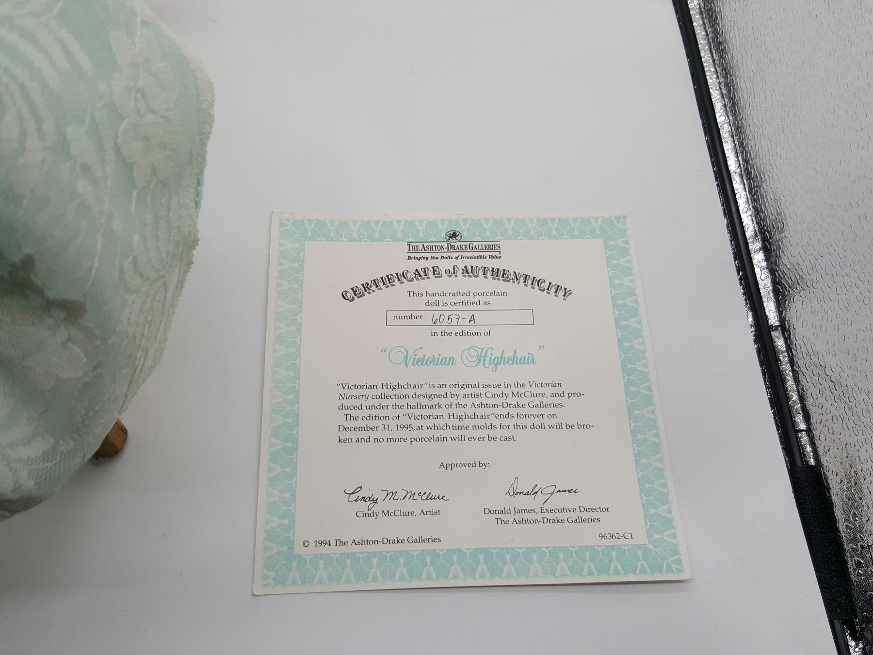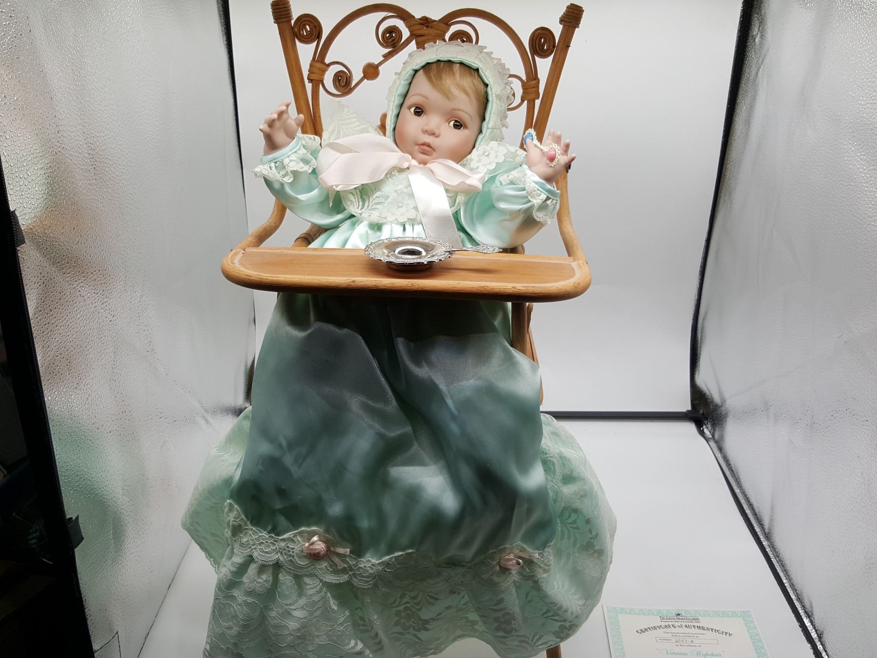 A The Ashton-Drake Galleries Porcelain Baby Doll: "Victorian Highchair" Edition.