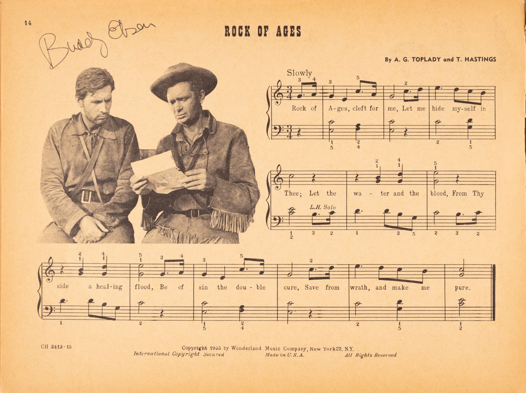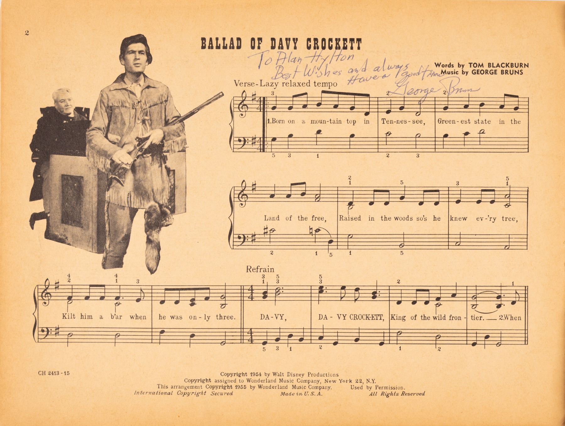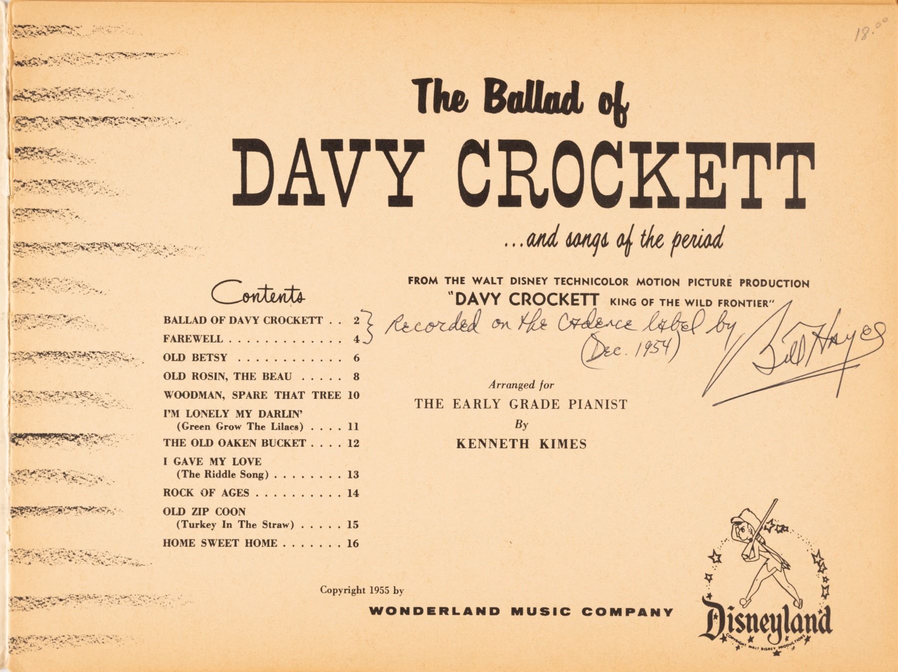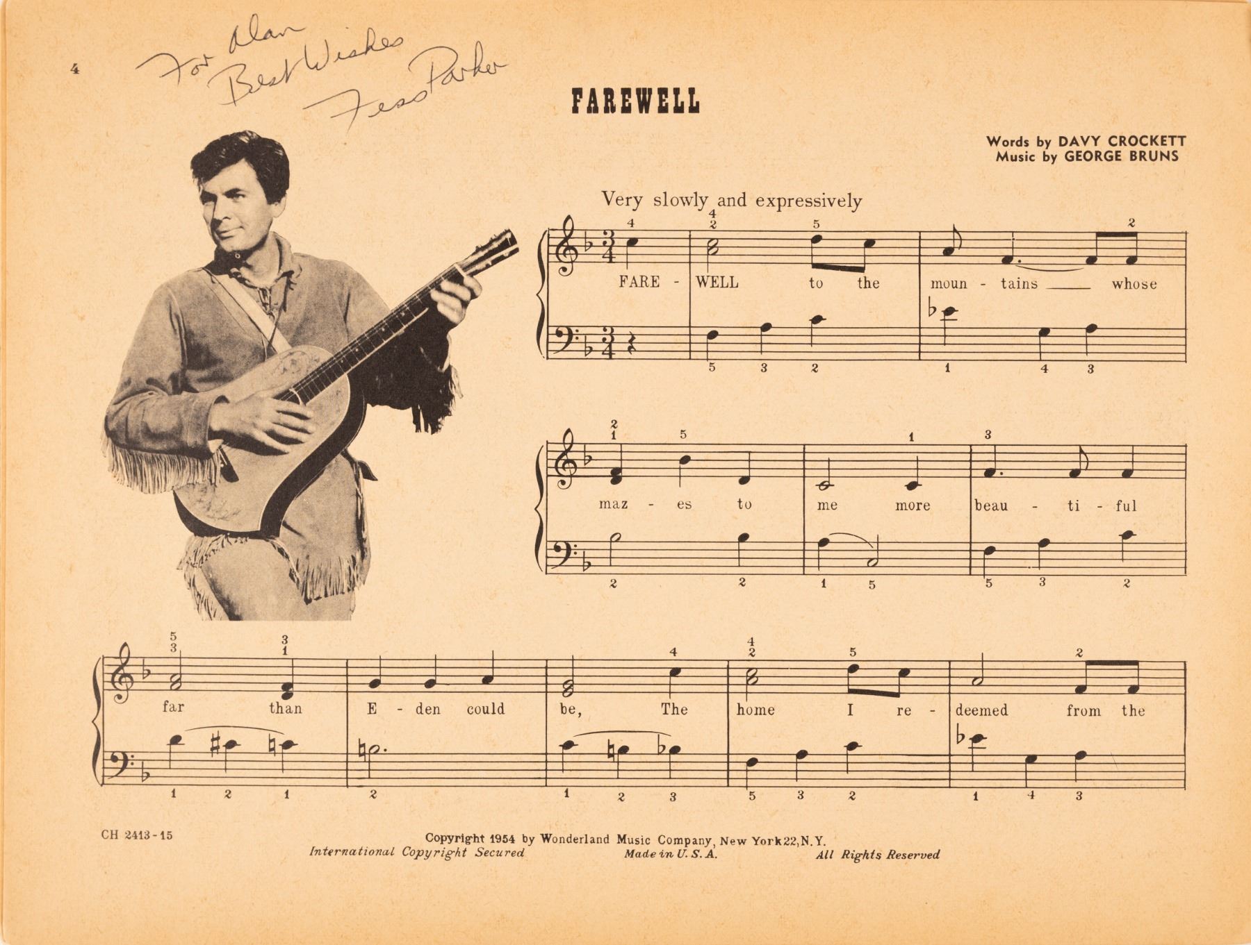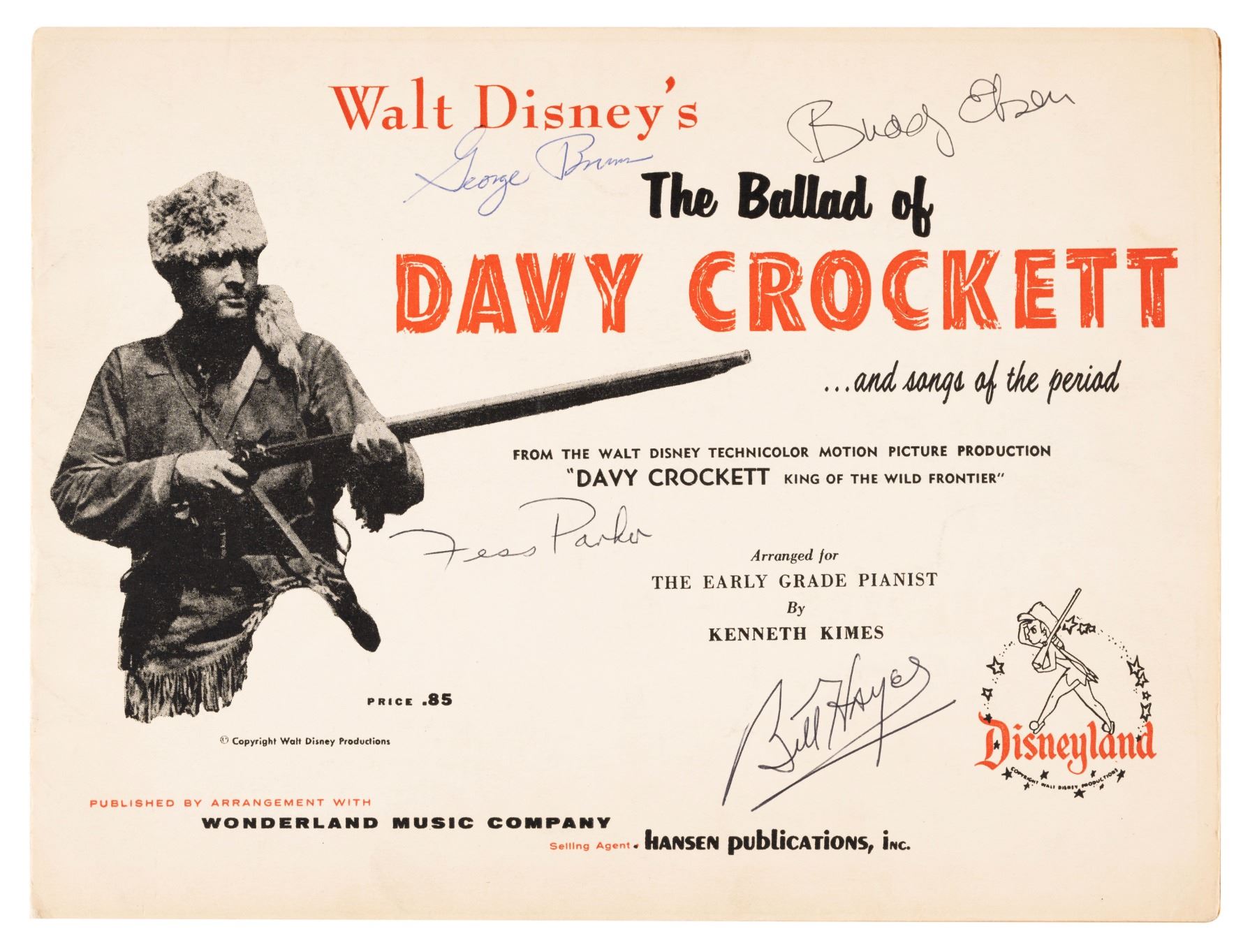 (Disney, 1955) A songbook for "The Ballad of Davy Crockett." The cover is signed by actors Fess Parker and Buddy Ebsen, who portrayed Crockett and Georgie Russell respectively, the song’s vocalist Bill Hayes, and composer George Bruns. In addition to the cover signatures, each individual signed an interior page with a dedication. Measuring 9" x 12", the 16-page songbook is in good condition with discoloration and edge-wear, particularly along the spine with tearing from age and use.