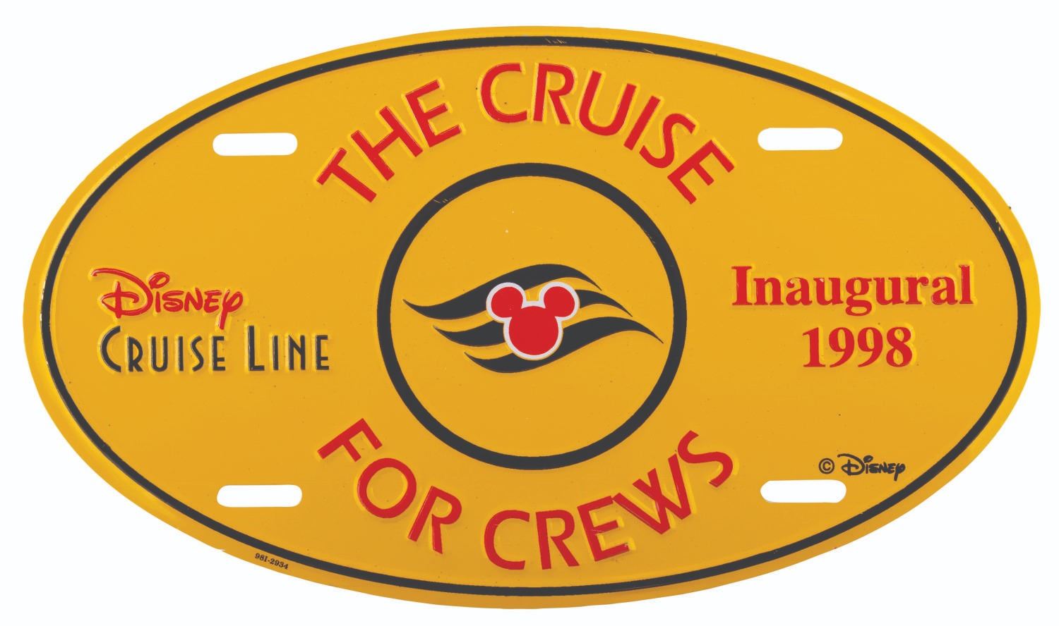 (Disney Cruise Line, 1998) A Cast Member-exclusive “The Cruise for Crews” license plate commemorating the inaugural sailing of the line’s first ship, the Disney Magic. Measuring 7” x 12”, the aluminum license plate is in very good condition with light scratches and wear from use.