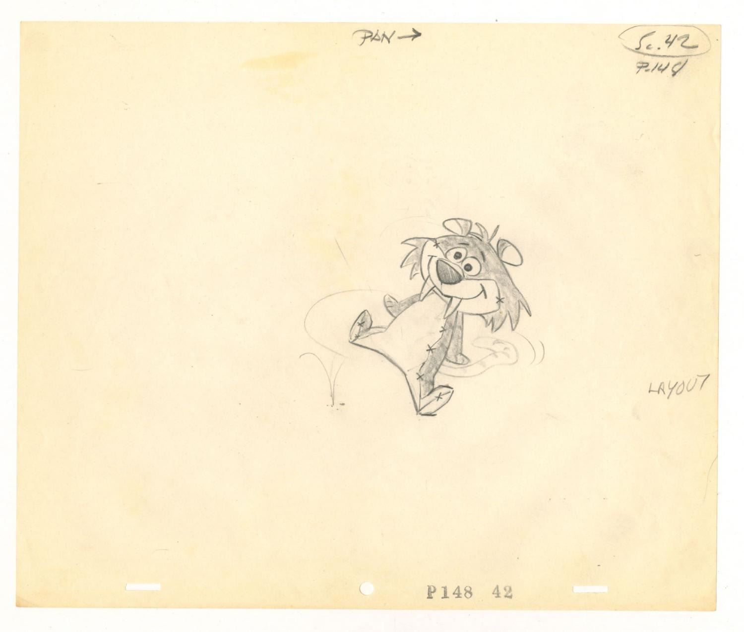 (Hanna-Barbera, 1965) An original layout drawing of Pebbles’ stuffed animal from “The Flintstones” episode “Samantha.” In this “Bewitched” crossover episode, Elizabeth Montgomery guest stars, voicing Samantha as a prehistoric witch. The doll has an image size of 3.5” x 3.25” on 10.5” x 12.5” animation paper. The graphite drawing is in very good production-used condition with light edge wear and creasing and light discoloration from age.