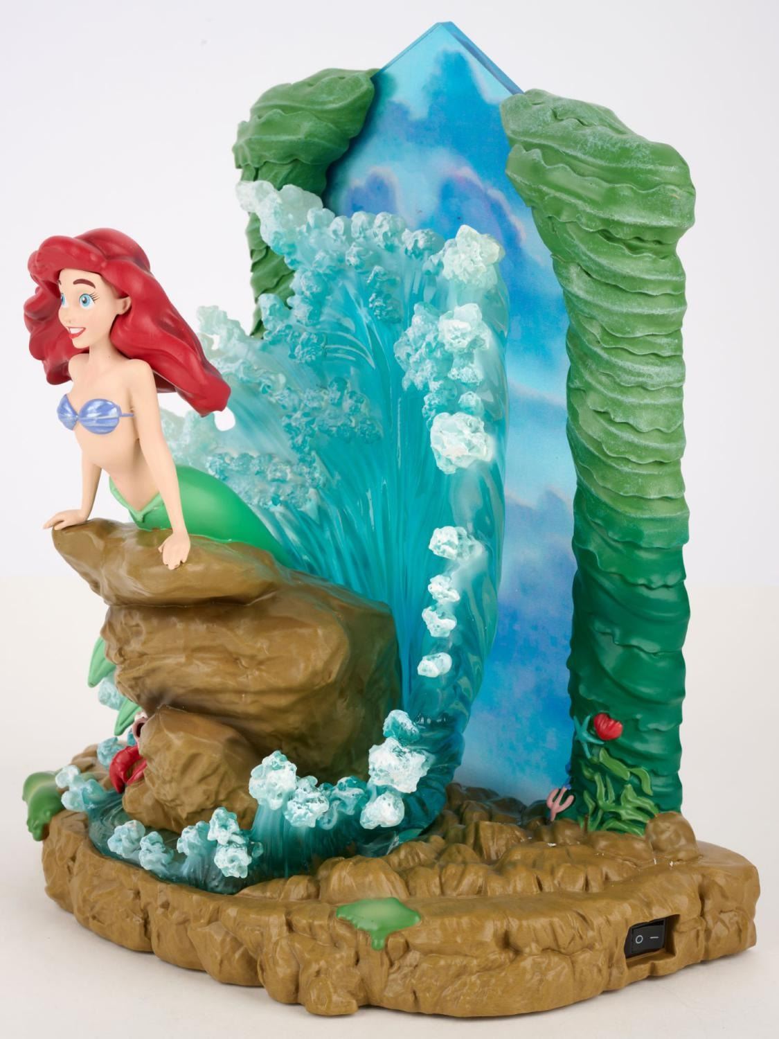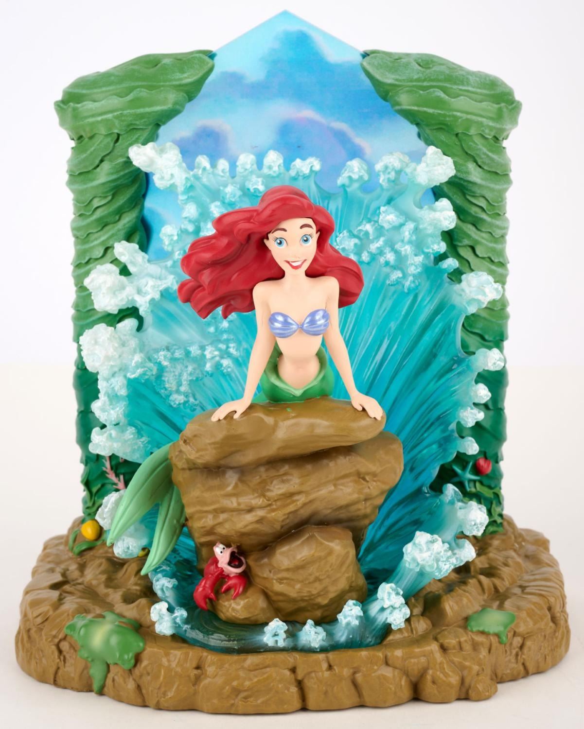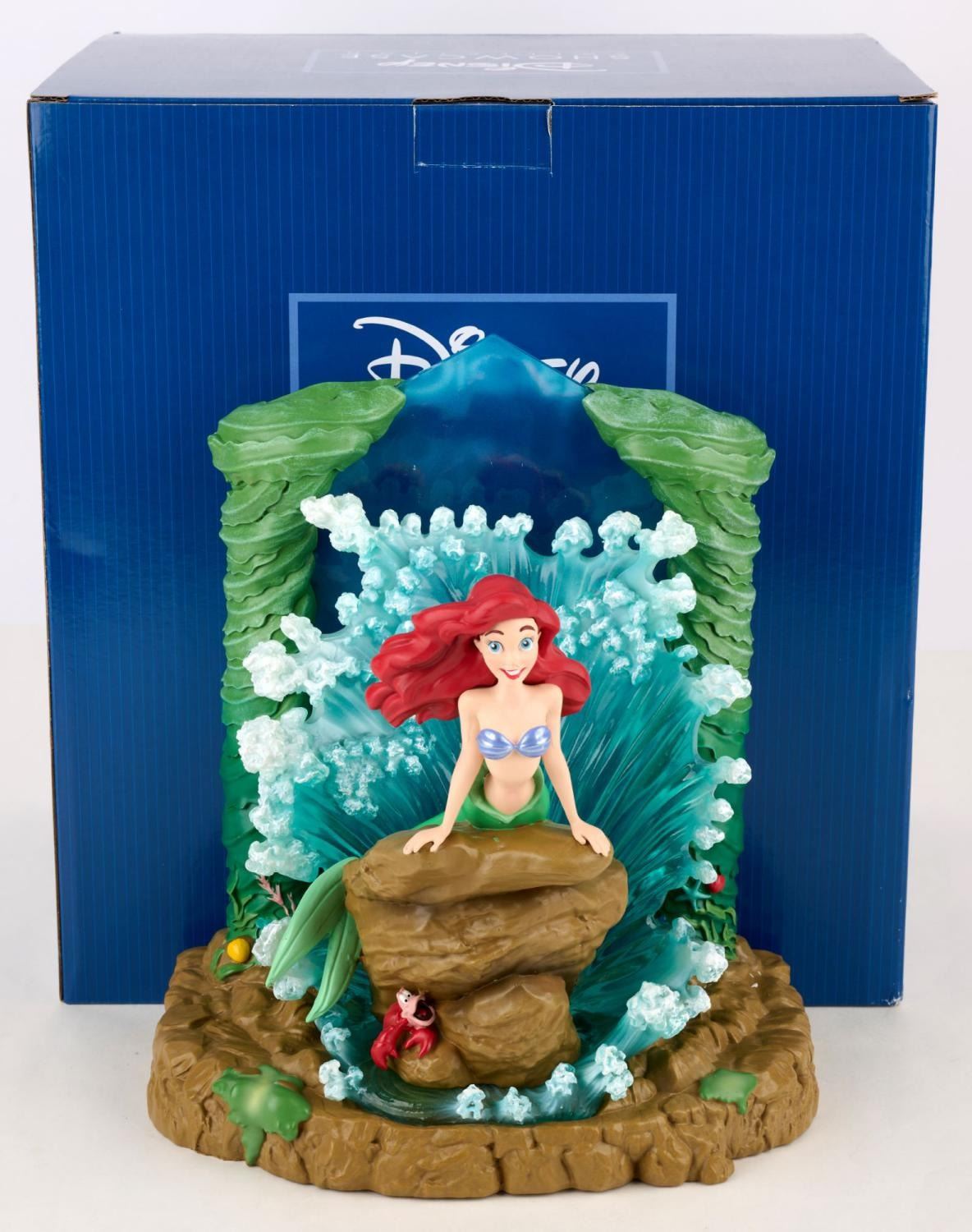 (Enesco, 2022) A Disney Showcase Collection light-up figurine of Ariel from Disney’s “The Little Mermaid.” With 3-AAA batteries (not included), the water surrounding Ariel glows as if lit by the sun. Measuring 8" x 5.25" and 9.25" tall, the figurine is in presumed fine as-new condition and comes with the original 11.25" x 8" x 12" box.
