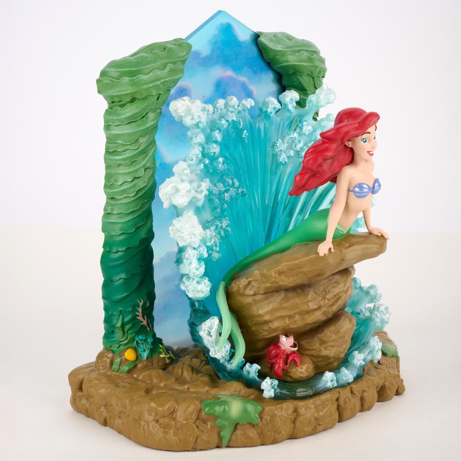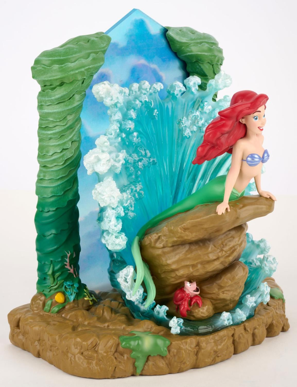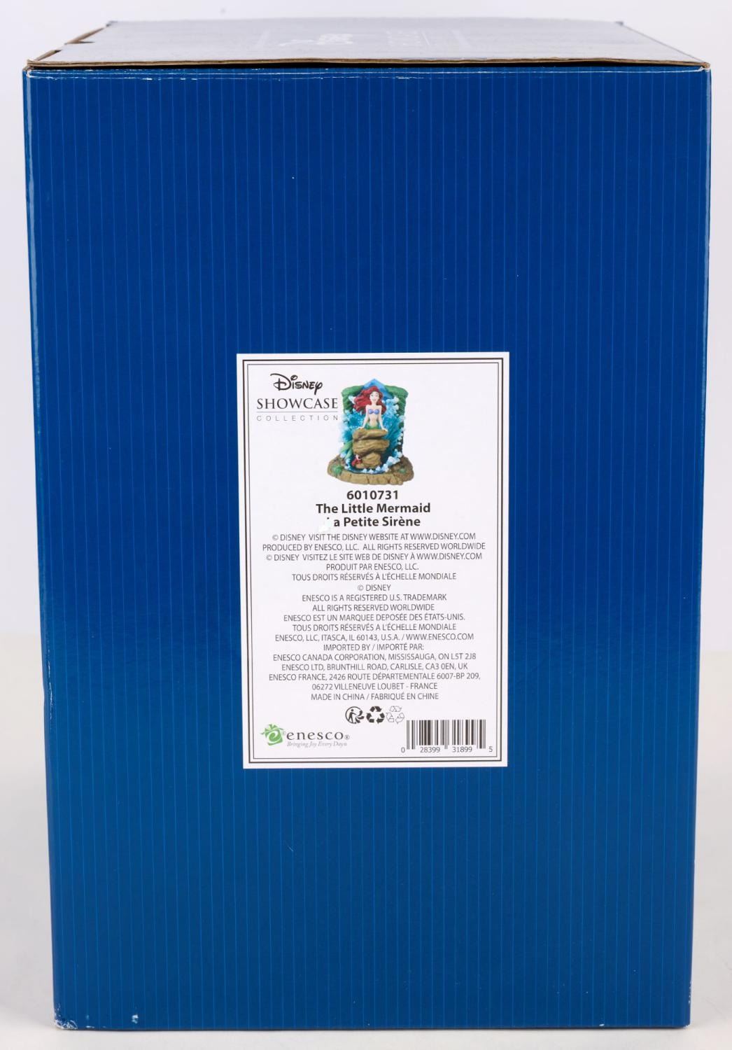 (Enesco, 2022) A Disney Showcase Collection light-up figurine of Ariel from Disney’s “The Little Mermaid.” With 3-AAA batteries (not included), the water surrounding Ariel glows as if lit by the sun. Measuring 8" x 5.25" and 9.25" tall, the figurine is in presumed fine as-new condition and comes with the original 11.25" x 8" x 12" box.