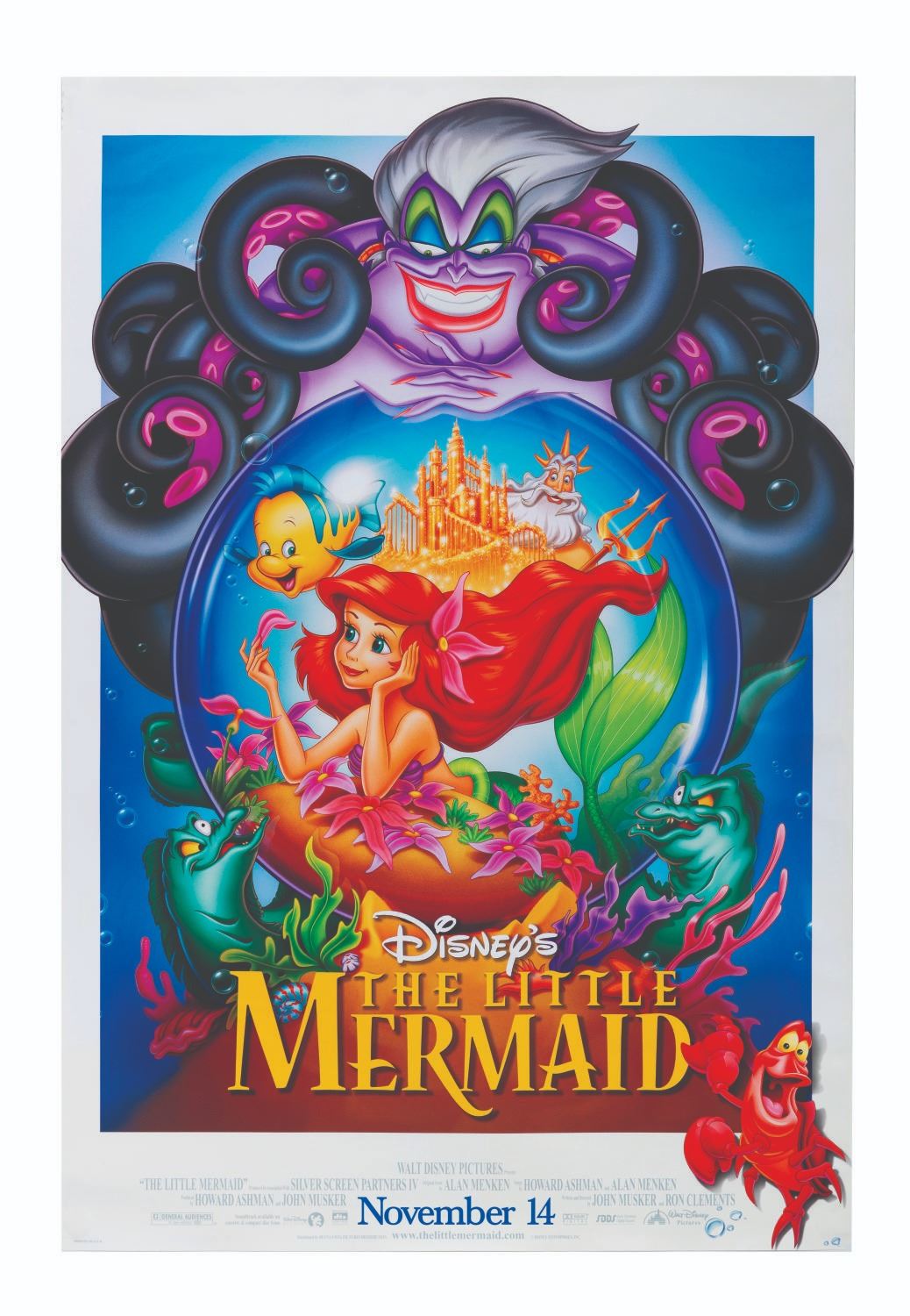 (Disney, 1997) An original one-sheet for the 1997 theatrical re-release of "The Little Mermaid." Measuring 26.75" x 39.5", the poster displays in very good condition with edge wear and warping.