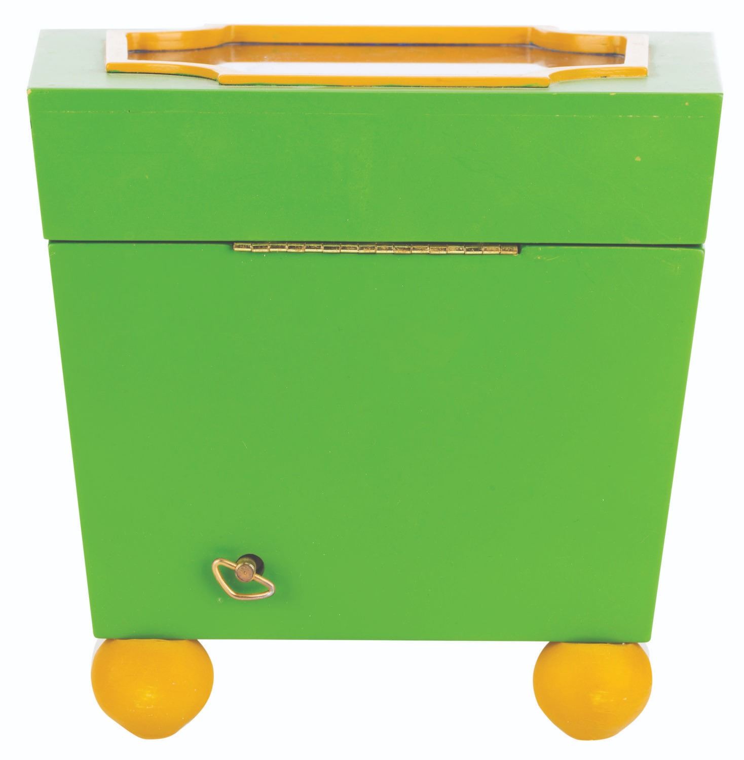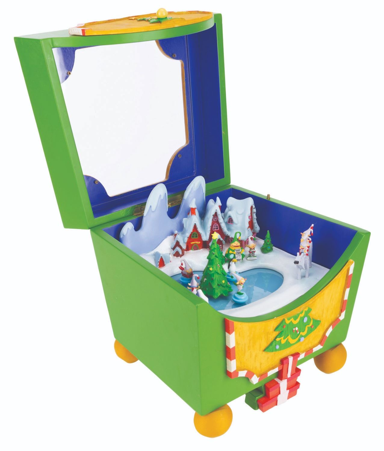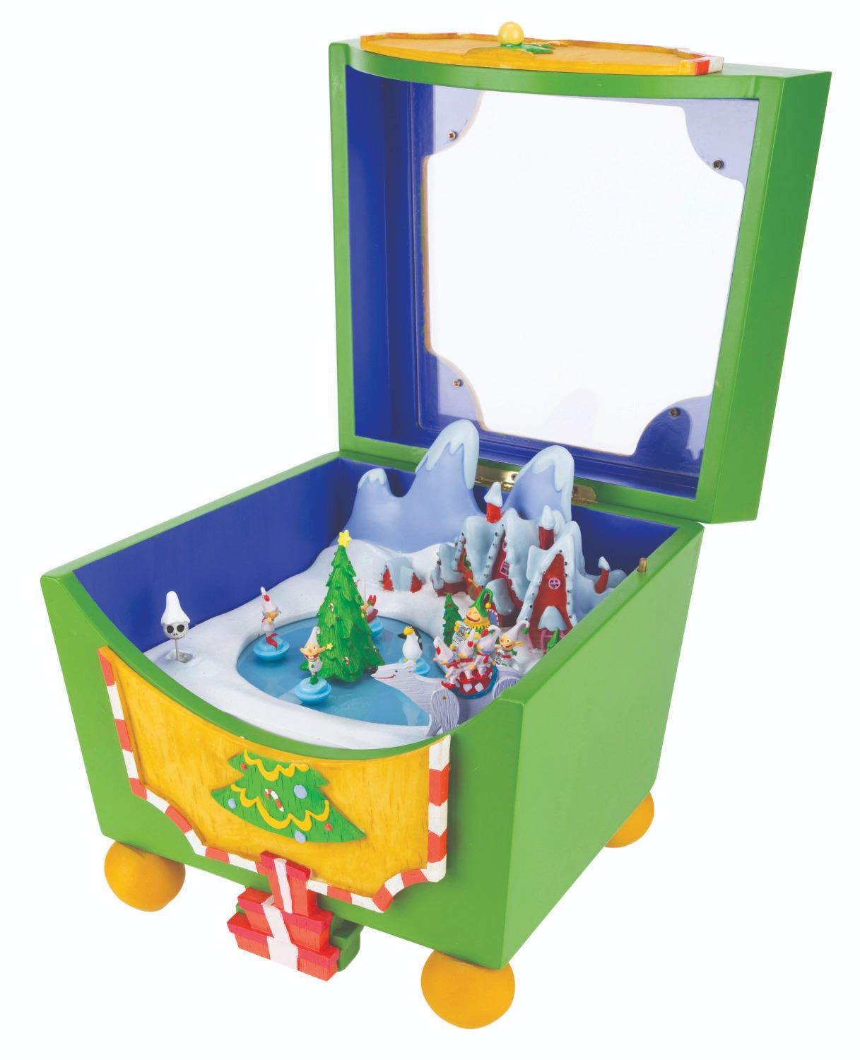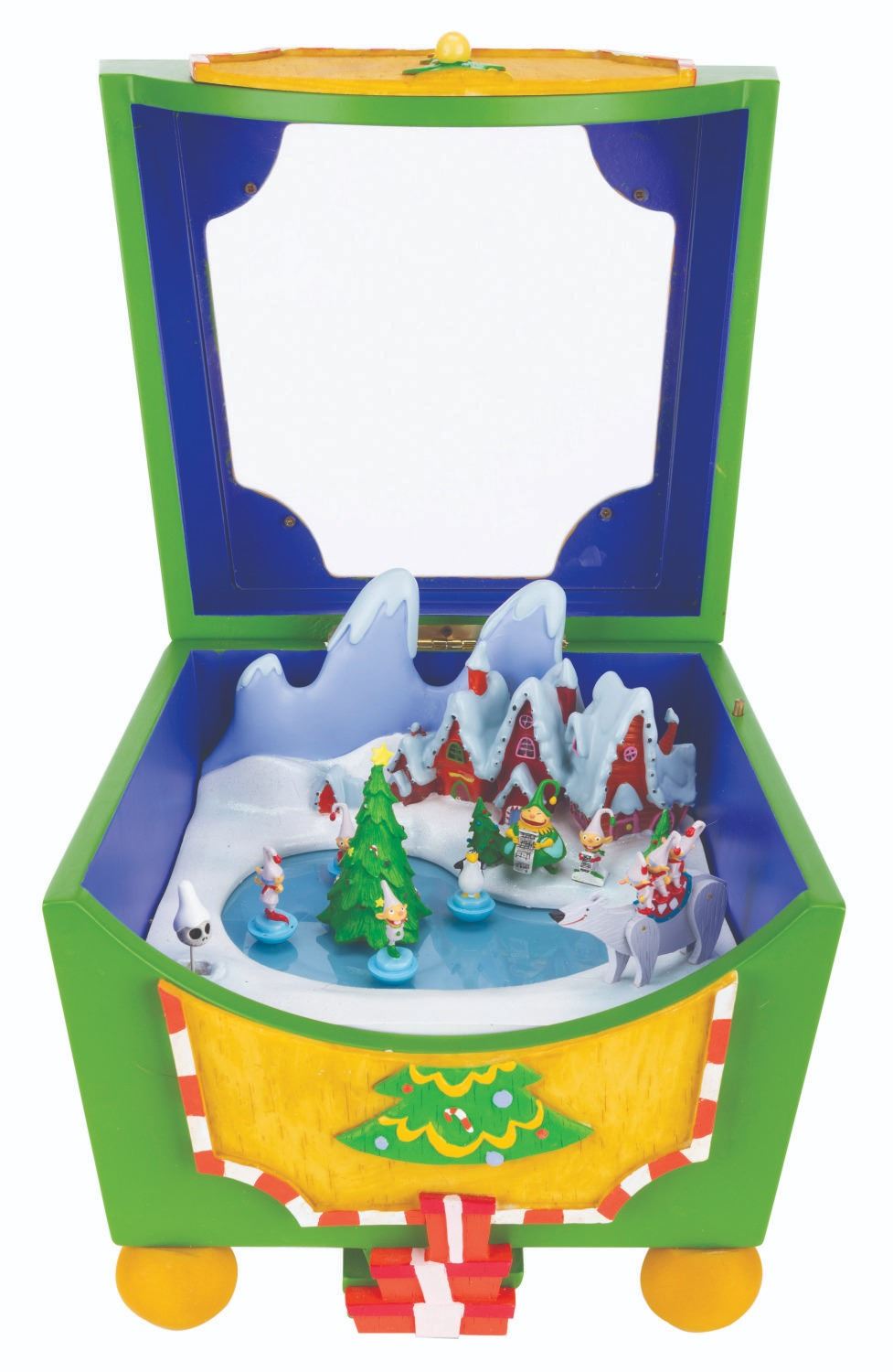(Disney, 2005) A “Tim Burton’s The Nightmare Before Christmas” Christmas Town animated music box designed by Kevin Kidney and Jody Daily. When wound “What’s This?” by Danny Elfman plays while the elves and penguin skate and Jack Skellington’s head out pops out from a snowbank. The music box requires two AA batteries (included) and functioned properly when tested. Measuring 8.75” x 6.5” x 7.5” tall, the music box is in very good condition with light scuffs and wear from display.