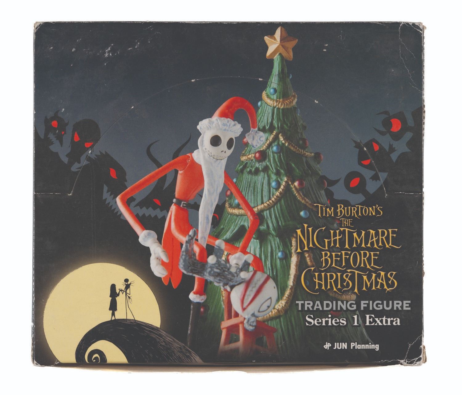 (JUN Planning, 2000s) A complete retail display case of “Nightmare Before Christmas” Series 1 Extra trading figures. The case includes 12 individual boxes marked for retail sale containing one of four different figures equalling three complete sets. The boxes containing the 1.5” to 3” tall figures measure 3.5” x 2.75” x 1.75” deep and are in fine, unopened condition. The display box measures 3.5” x 7.5” x 8.5” deep and is in good condition with shelf wear to the edges and corners.