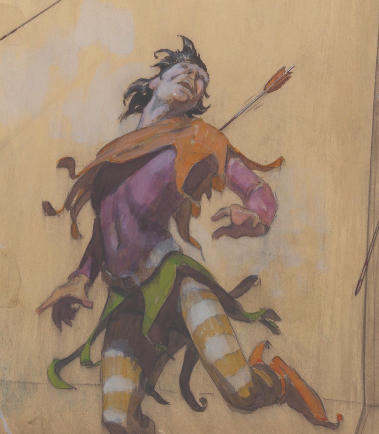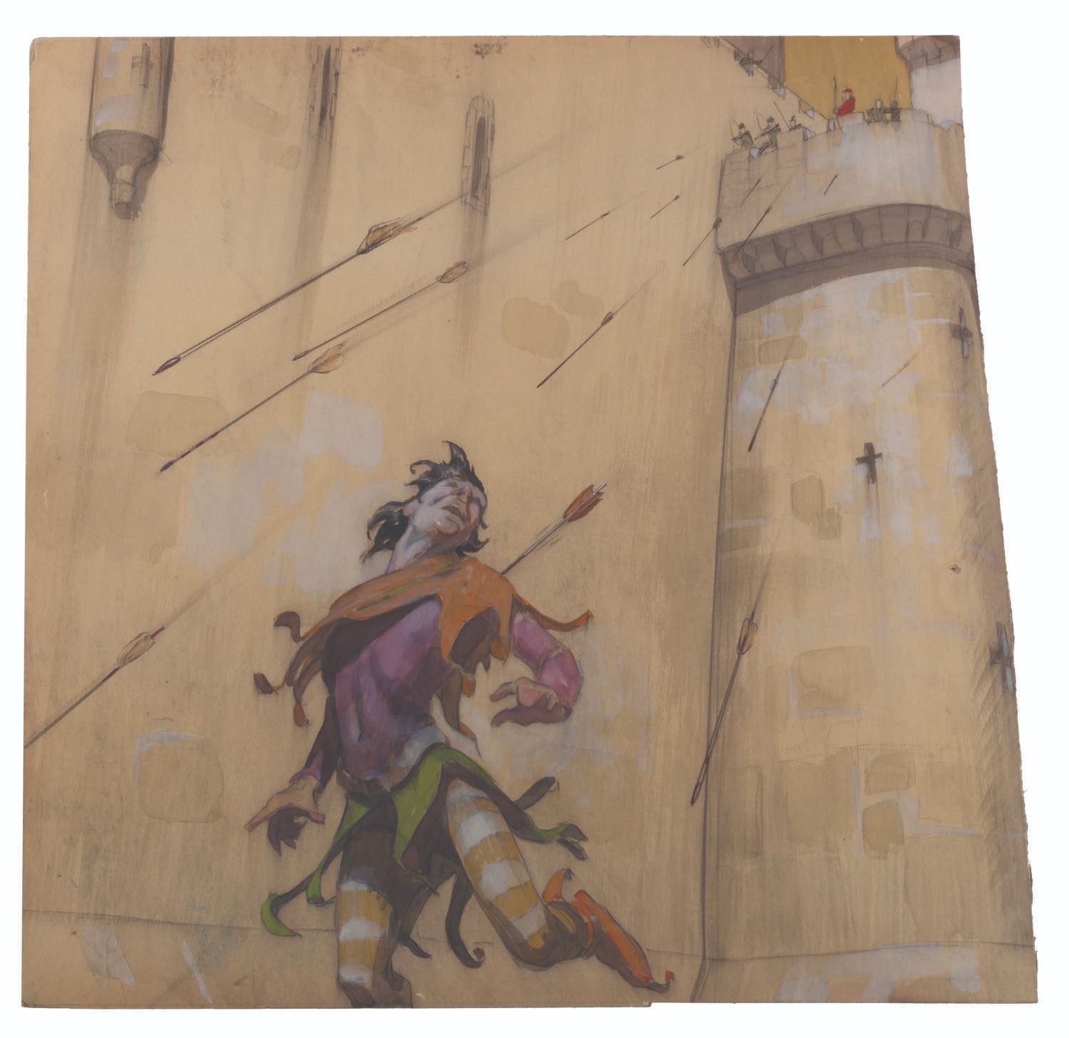 (Disney, 1953) A dramatic piece of original concept art from the 1953 adventure film “The Sword and the Rose,” produced by Walt Disney. The film, starring Glynis Johns and James Robertson, tells the story of Mary Tudor and King Henry VIII. Accomplished in pencil and watercolor on illustration board, the 19” x 19.5” concept art displays in very good condition with edge wear and a small scuff on the man’s chin.