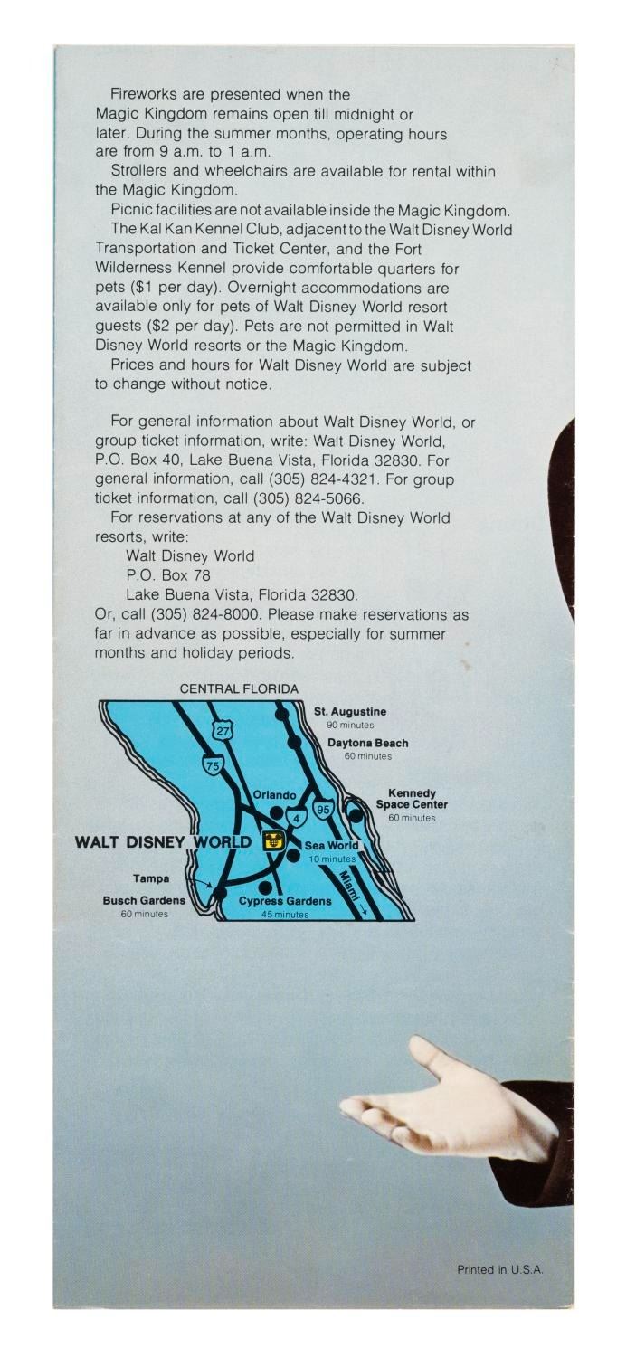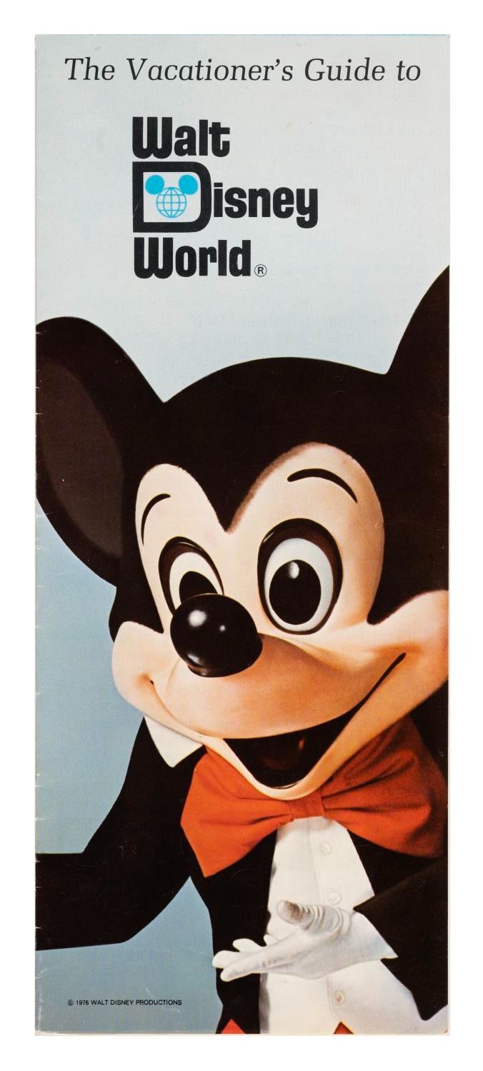 (Walt Disney World, 1976) A "The Vacationer's Guide to Walt Disney World" brochure featuring attraction highlights, ticket and Guided Tour information, and a colorful map. Measuring 3.75" x 9" when closed, the brochure is in good condition, exhibiting creases and wear from handling and age.