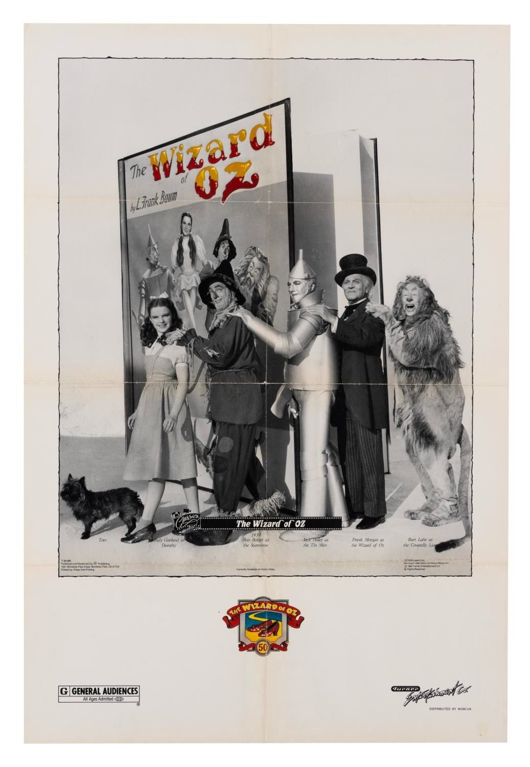 (MGM, 1989) A one-sheet poster for the home video release and 50th anniversary of "The Wizard of Oz." Measuring 27" x 41", the poster displays in good condition with typical wear and creases along the folds, a circular 0.25" area of discoloration from a sticker, heavy creasing along the upper left edge, and light discoloration from age.