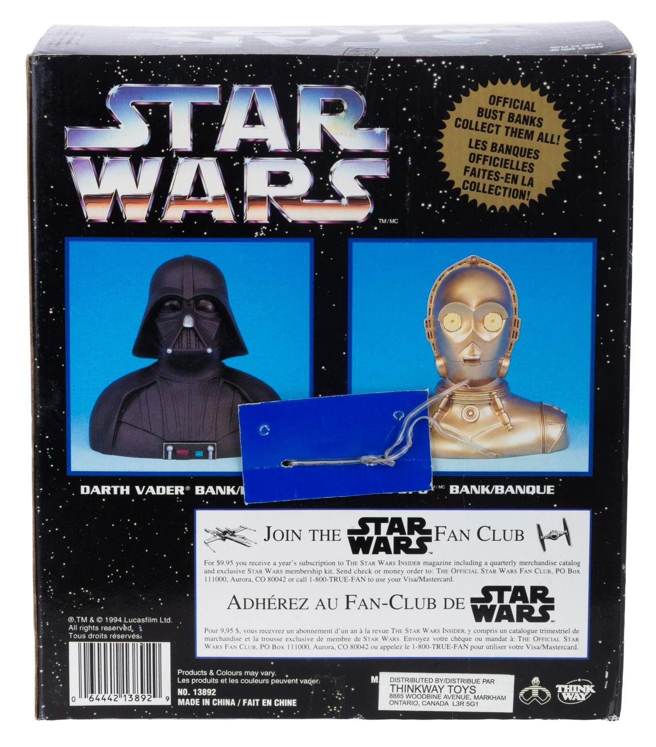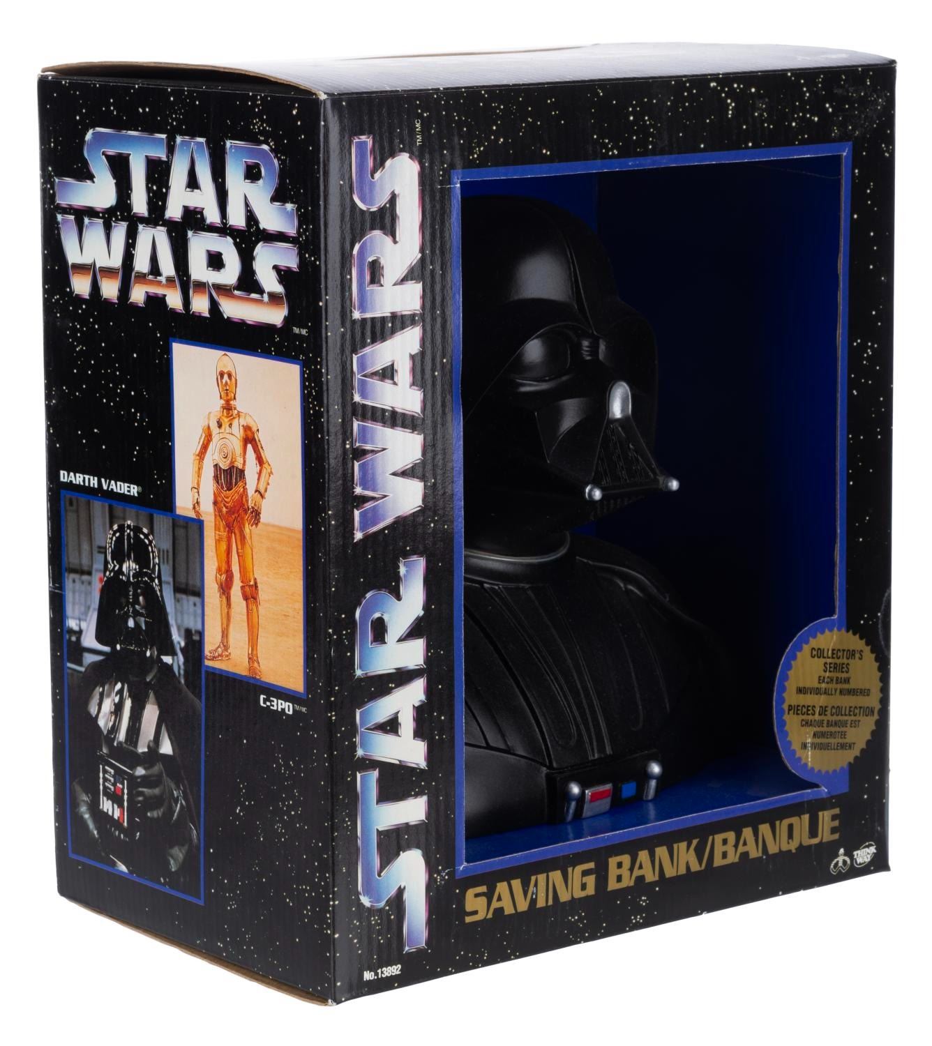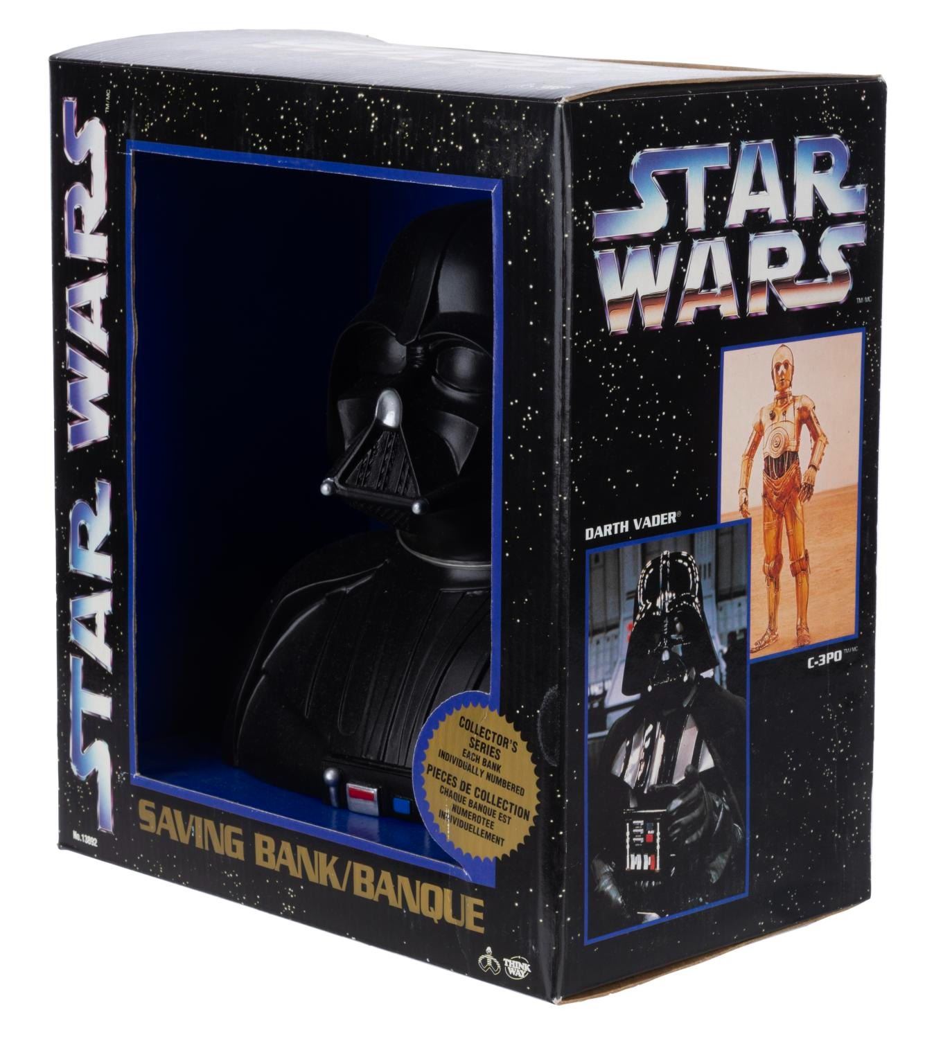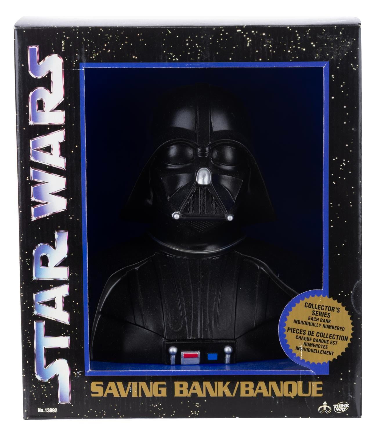 (Think Way, 1994) A plastic bank bust of the Dark Lord of the Sith. Measuring 7.25” tall, the bank is in fine condition in the original package.