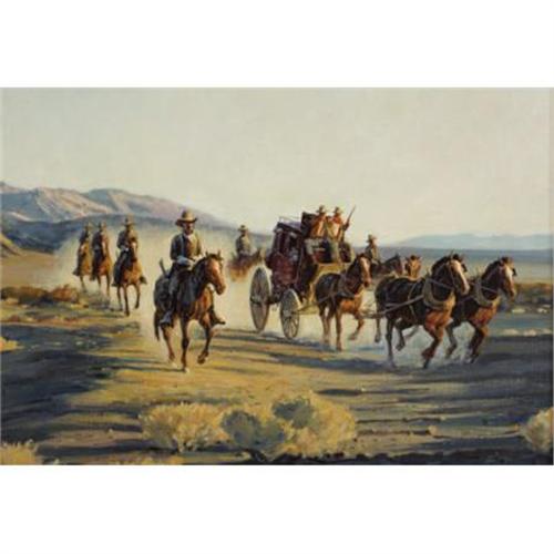 <B>A THOMAS LORIMER OIL ON CANVAS - 'ESCORTING THE BUTTERFIELD'</B></I> - Thomas W. Lorimer (1941-) is an Arizona artist specializing in scenes of the Old West, the excitement captured in such works as this 'Escorting the Butterfield' "Concord" stagecoach and more tranquil scenes of cowboy life. In this 15" x 30" picture Lorimer does some of his best work in using heavy paint and brushwork in depicting the coach, riders and the desolate landscape through which the commercial vehicles of the West travelled, sometimes through dangerous territory as the armed guards that are escorting this coach could attest.<BR><BR>John Butterfield's Overland Stage Company connected St. Louis and Memphis with San Francisco by way of his "Concord" stagecoaches like the one pictured here in Lorimer's work - and in this auction catalog as where an actual surviving example is included. Lorimer's excellent composition and realist style have made him a favored artist of the Old West. The painting is in excellent condition and is framed in a beautiful 6" barnboard frame with a small dedication plaque at the bottom center.<BR><BR><b>Shipping:</b> Framed - with Glass, Large (<a target="_blank" href="http://www.heritageauctions.com/common/shipping.php">view shipping information</a>)