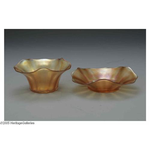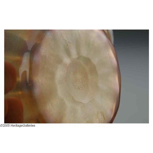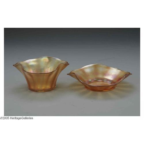 <B>An English Glass Bowl And Underplate</B></I><BR>Thomas Webb & Sons, Last Quarter Nineteenth Century<BR><BR>The 'Iris' pattern iridescent amber bowl and underplate, marked underside <I>WEBB GLASS IRIS</B></I><BR>The bowl: 2.6in. high x 4.6in. diameter; the plate: 1.7in. high x 5.7in. diameter
