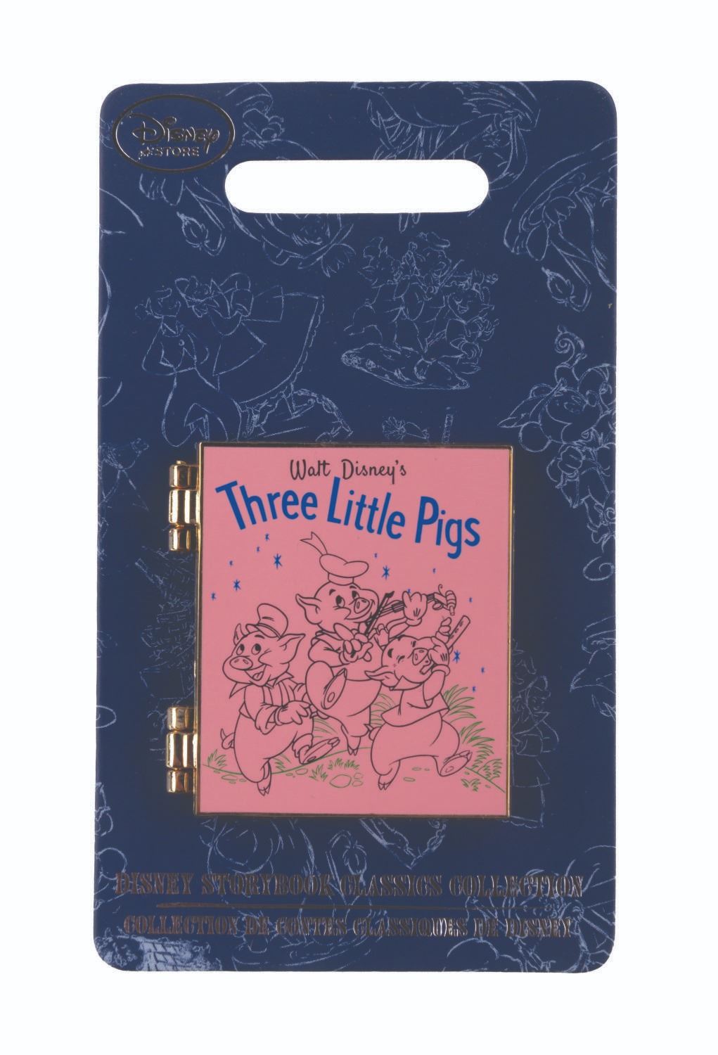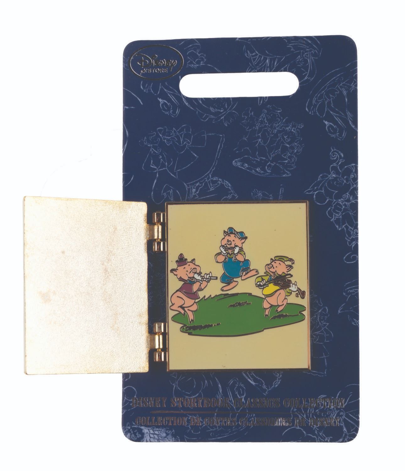 (Disney, 2017) A “Three Little Pigs” hinged book pin, released in the Disney Storybook Pin Collection in April 2017. Measuring 1.5” x 1.75” the LE 1100 pin is in fine condition on the original card.