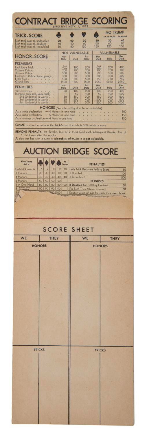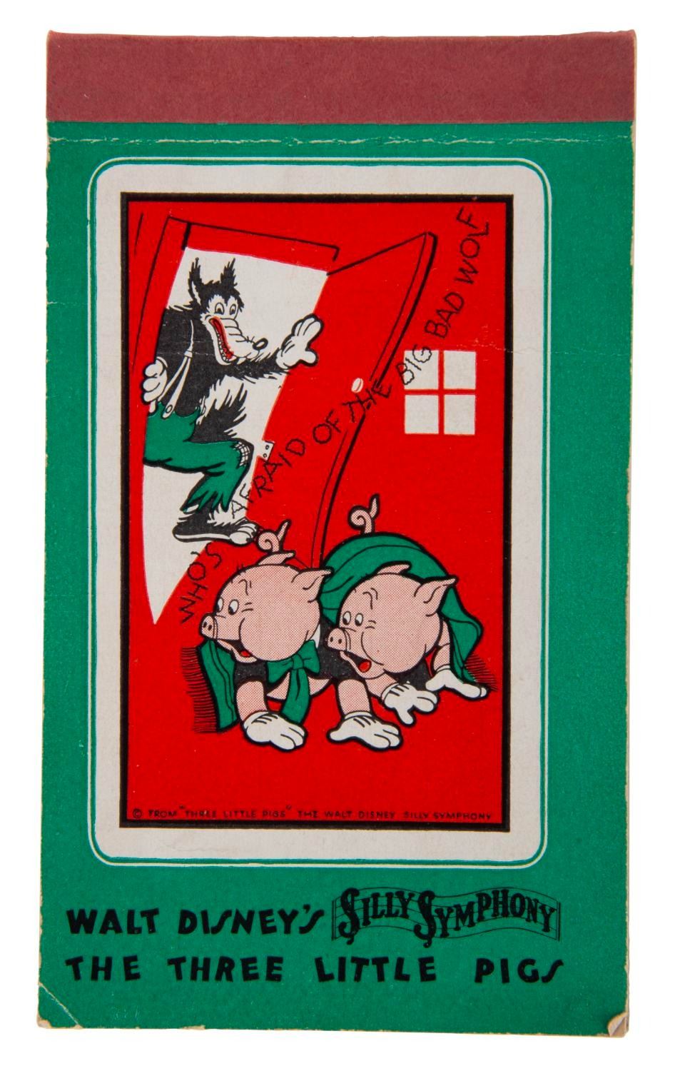 (Disney, 1930s) A notepad for scoring bridge card games, featuring The Three Little Pigs on the cover. Measuring 3"x5", the pad is in very good condition, with one score sheet removed, and pencil marks on the back of the last sheet.