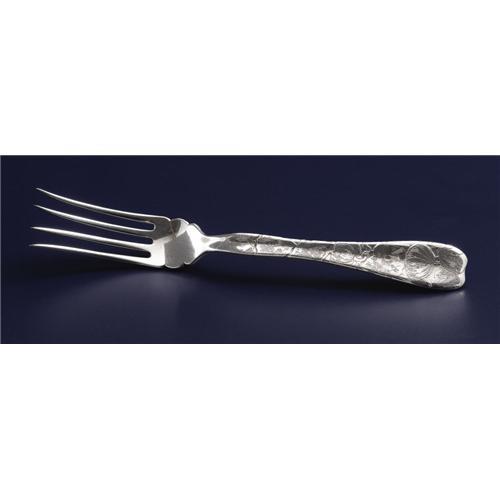 <B>An American Silver Pickle Fork</B></I><BR><BR>Tiffany & Co., New York, New York<BR>Circa 1880<BR>Silver<BR>Marks: <I>C TIFFANY & CO STERLING PAT 1880</B></I><BR>7 inches long<BR>2.01 Troy ounces<BR><BR>In the <I>Lap-over-Edge</B></I> pattern with engraved pumpkin and vine decoration. <B>Condition Report:</B> Normal signs of wear as appropriate with age. Minor surface scratching.<BR><BR><b>Shipping:</b> Requires 3rd Party Shipping (<a target="_blank" href="http://www.heritageauctions.com/common/shipping.php">view shipping information</a>)