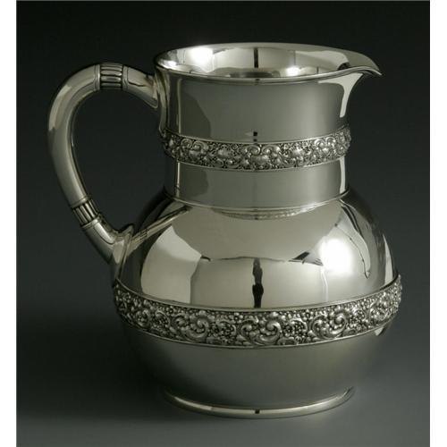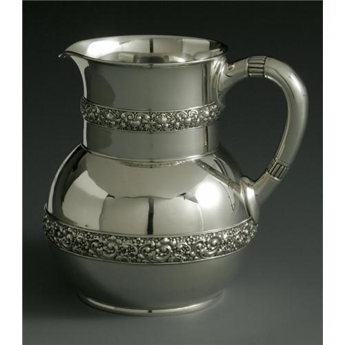 <B>An American Silver Pitcher</B></I><BR>Tiffany & Co., New York, NY, 1877<BR><BR>The pitcher with two decorative bands, commemoration to the front, marked underside <I>TIFFANY & CO./4706 MAKERS 224/STERLING-SILVER/925-1000/M,</B></I> total weight 30.5 Troy ounces<BR>7.5in. high