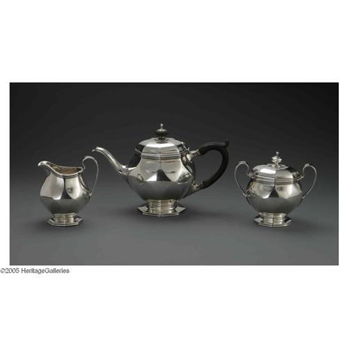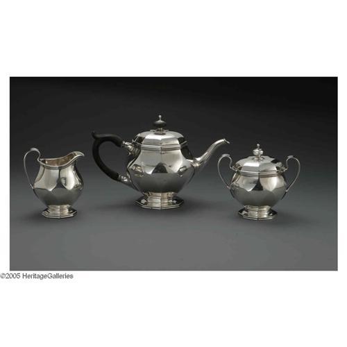 <B>An American Silver Tea Service</B></I><BR>Mark of Tiffany & Co., New York, NY, 1911<BR><BR>The bachelor tea service of a teapot, creamer and lidded sugar, the teapot with ebony handle and finial, all marked underside <I>TIFFANY & CO./18105 MAKERS 3555/STERLING SILVER/925-1000/m,</B></I> total weight 46.7 Troy ounces<BR>The teapot: 7in. high3 Items <BR><BR><B>Condition Report:</B> Normal signs of wear as appropriate with age; very minor scratches to one panel of the sugar bowl; the creamer has a very slight dent to the side.