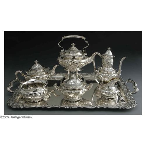 <B>An American Silver Tea Set</B></I><BR>Mark of Tiffany & Co., New York, NY, Early Twentieth Century<BR><BR>The set includes a hot water kettle and stand, coffee pot, teapot, creamer, lidded sugar, waste bowl, and tray, designed by Charles C. Cook, marked underside <I>TIFFANY & CO./10500 MAKERS 6106/STERLING SILVER/925-1000/C,</B></I> total weight 410 Troy ounces<BR>The tray: 30.5in. long x 19.7in. wide <BR><BR><B>Important not