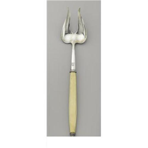 <B>An American Silver and Ivory Chafing Dish Fork</B></I><BR><BR> Tiffany & Company, New York, New York<BR>Circa 1907-1947<BR> Silver and ivory<BR> Marks: <I>TIFFANY & CO. MAKERS STERLING, M</B></I><BR>
