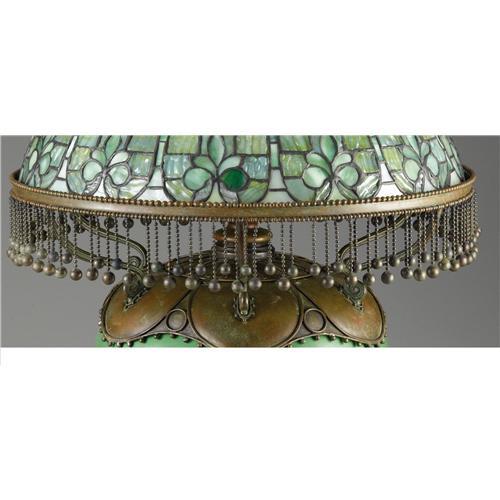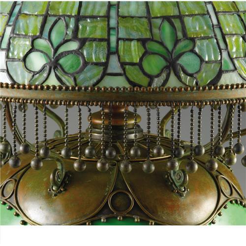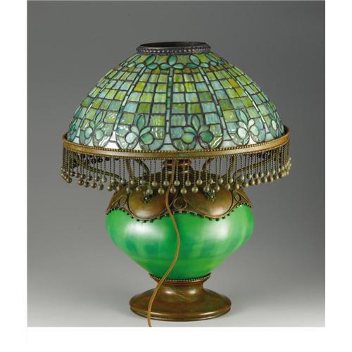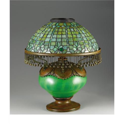 <B>An American Leaded Glass Blown-Out Table Lamp</B></I><BR><BR>Tiffany Studios, New York, New York<BR>Circa 1890-1900<BR>Leaded glass, glass, patinated bronze<BR>Marks: <I>S1290</B></I><BR>20 in. high, 16 in. diameter shade<BR><BR>In the Fleur de Lys pattern, with blue/green, green, amber and green to amber glass, the shade sitting within an armature with bronze staggered pendants; the base of green blow-out glass within shaped red/brown patinated bronze mounts; with oil cannister.