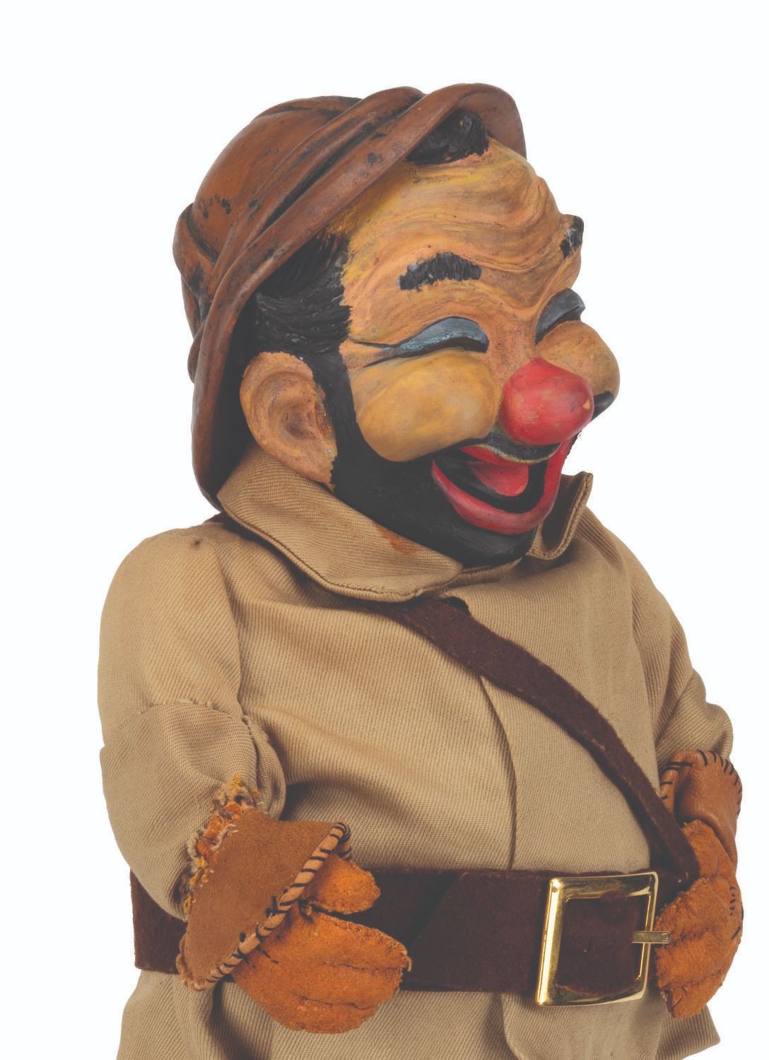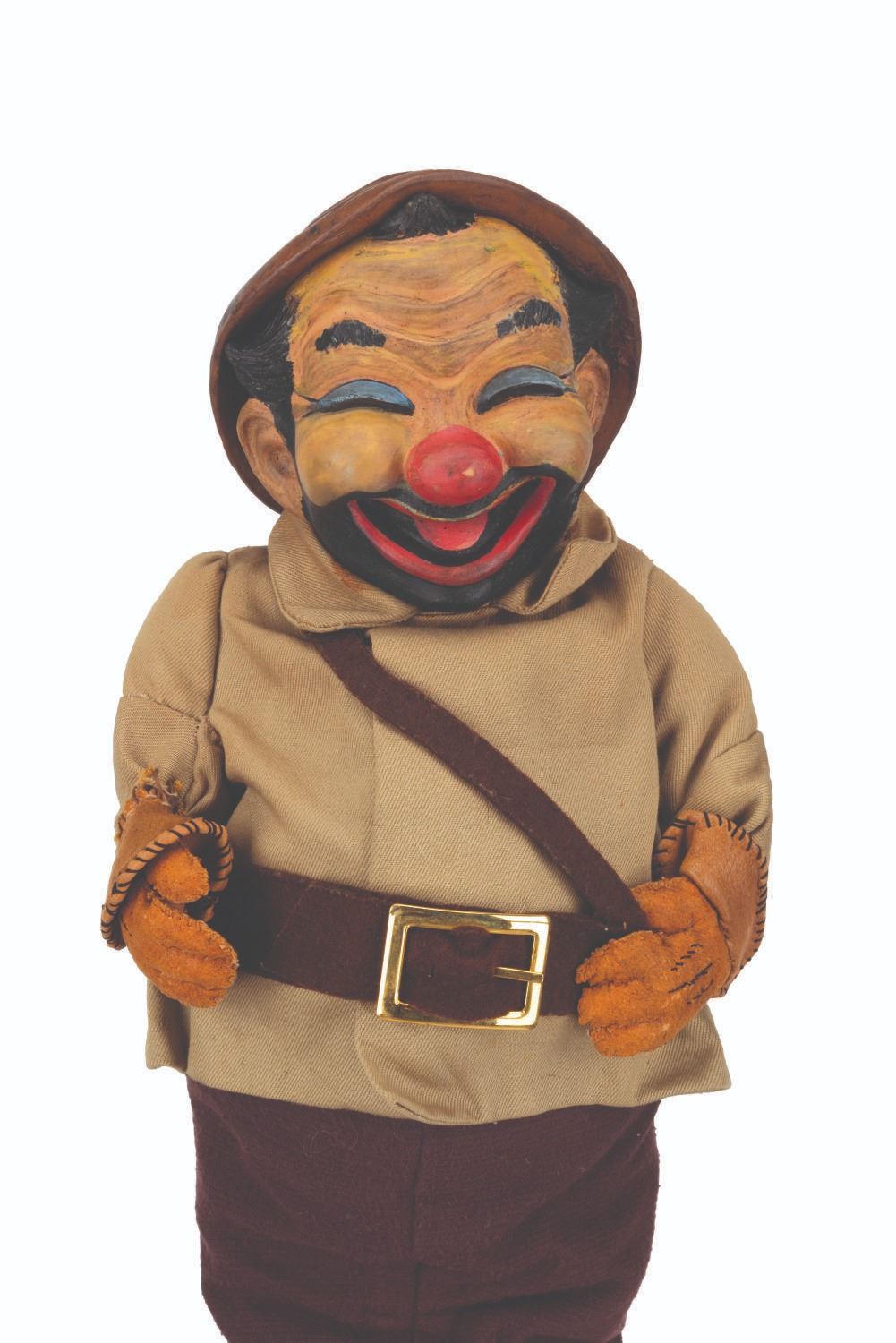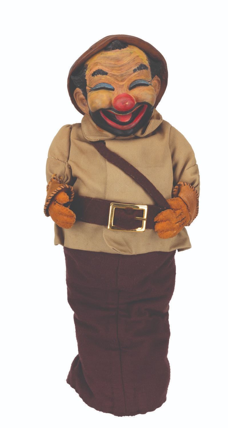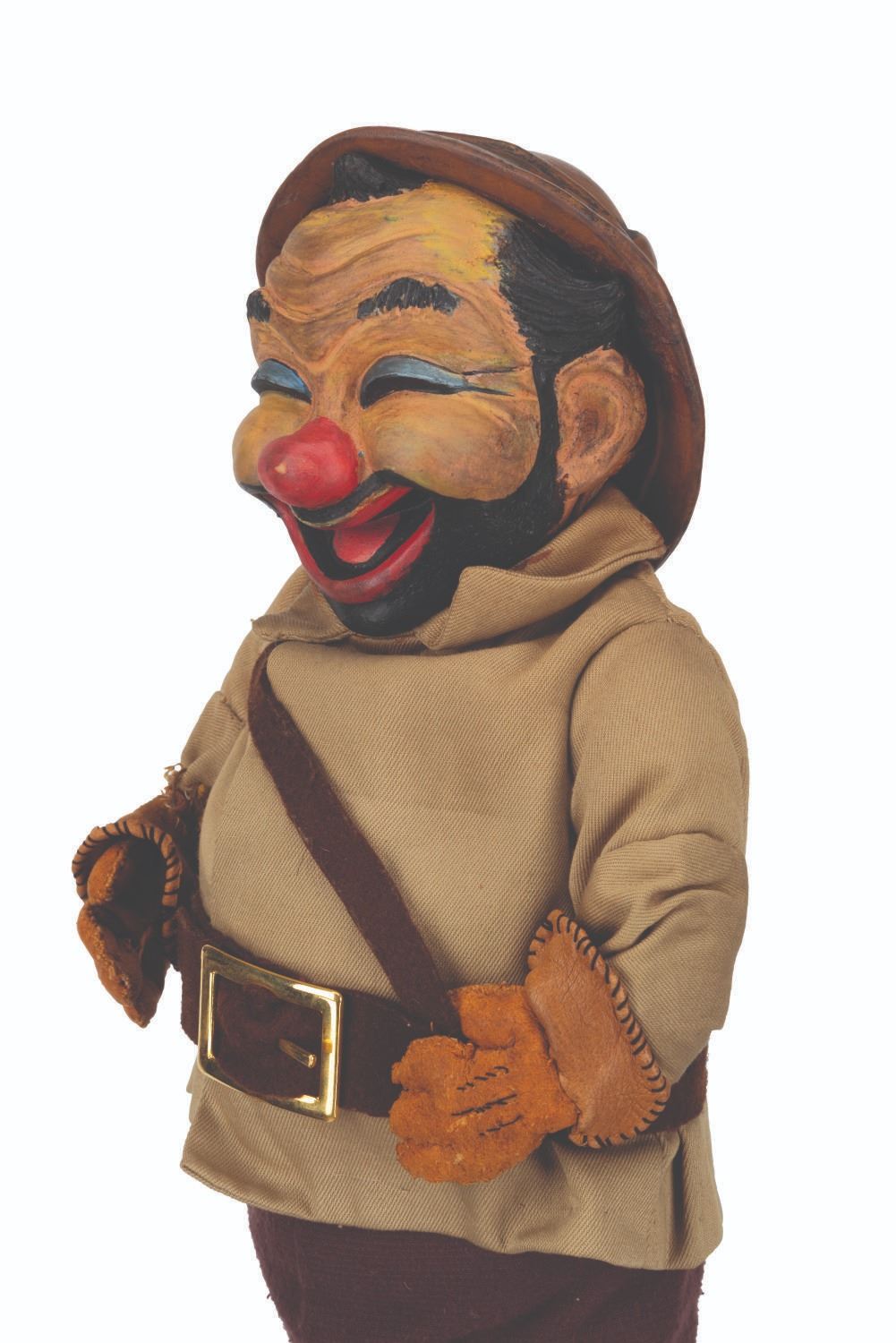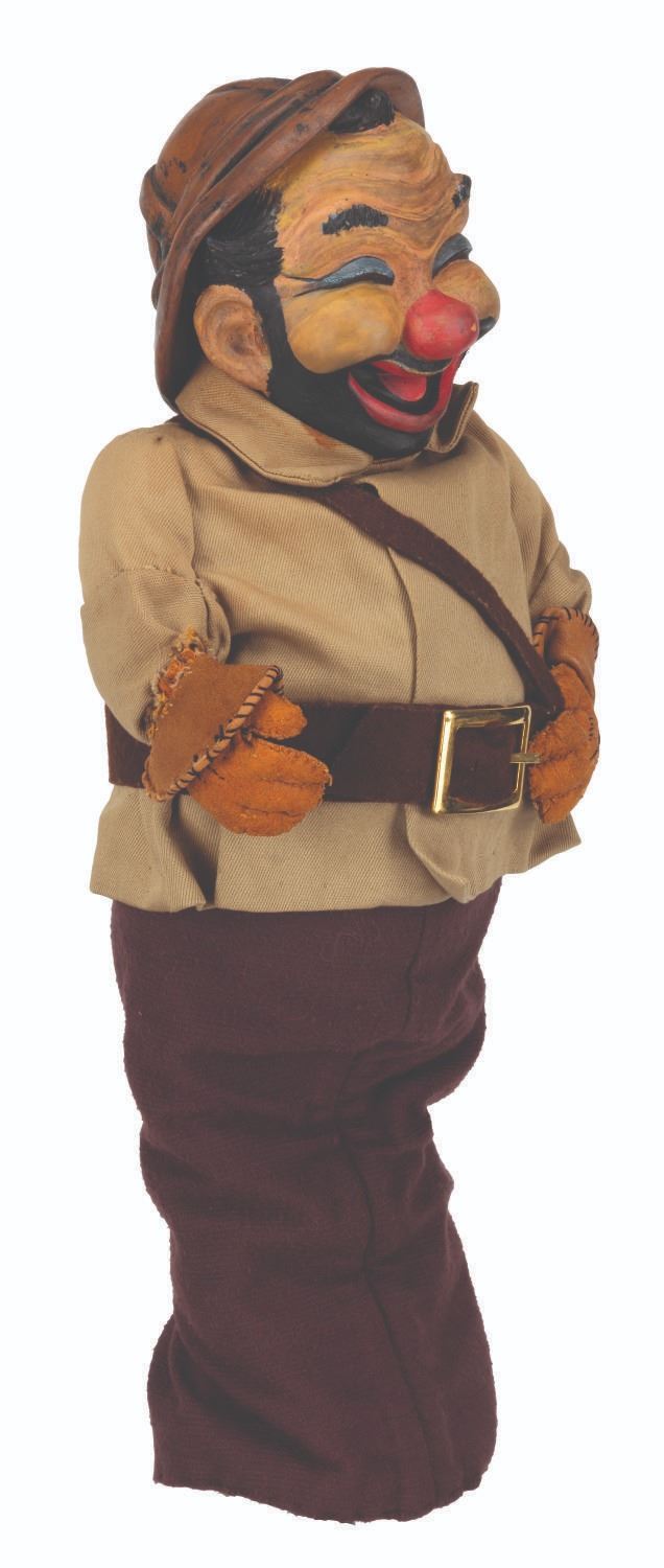 (Clampett, 1949-55) A screen-used Captain Huffenpuff puppet from “Time for Beany.” Huffenpuff, Captain of “The Leakin’ Lena” and Beany’s bumbling, but good-hearted uncle, was performed by voice acting legend, Daws Butler. Constructed of Rubber, cloth, leather, suede, metal, cotton, and felt and measuring 6.5” x 4” and 16” tall, Huffenpuff displays in very good condition with two light paint stains on the top fold of the collar from the character’s beard, a spot of paint loss on the nose, light wear on the suede hands, light soiling and plasticization to the head.
