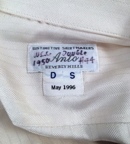 Direct from the set of the film production, A Time to Kill (1996) -is Lucien Wilbanks' (Donald Sutherland) off white with self stripe long sleeve button up the front 'Anto' shirt. His initials "DS May 1996" are inscribed on the tag on the collar of the shirt)