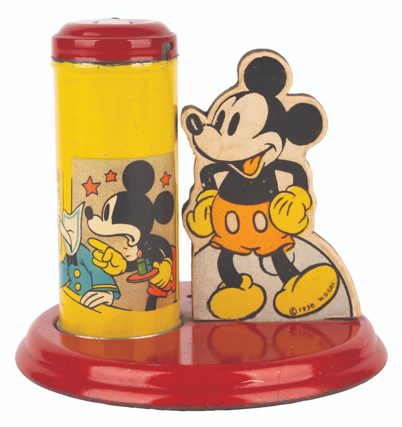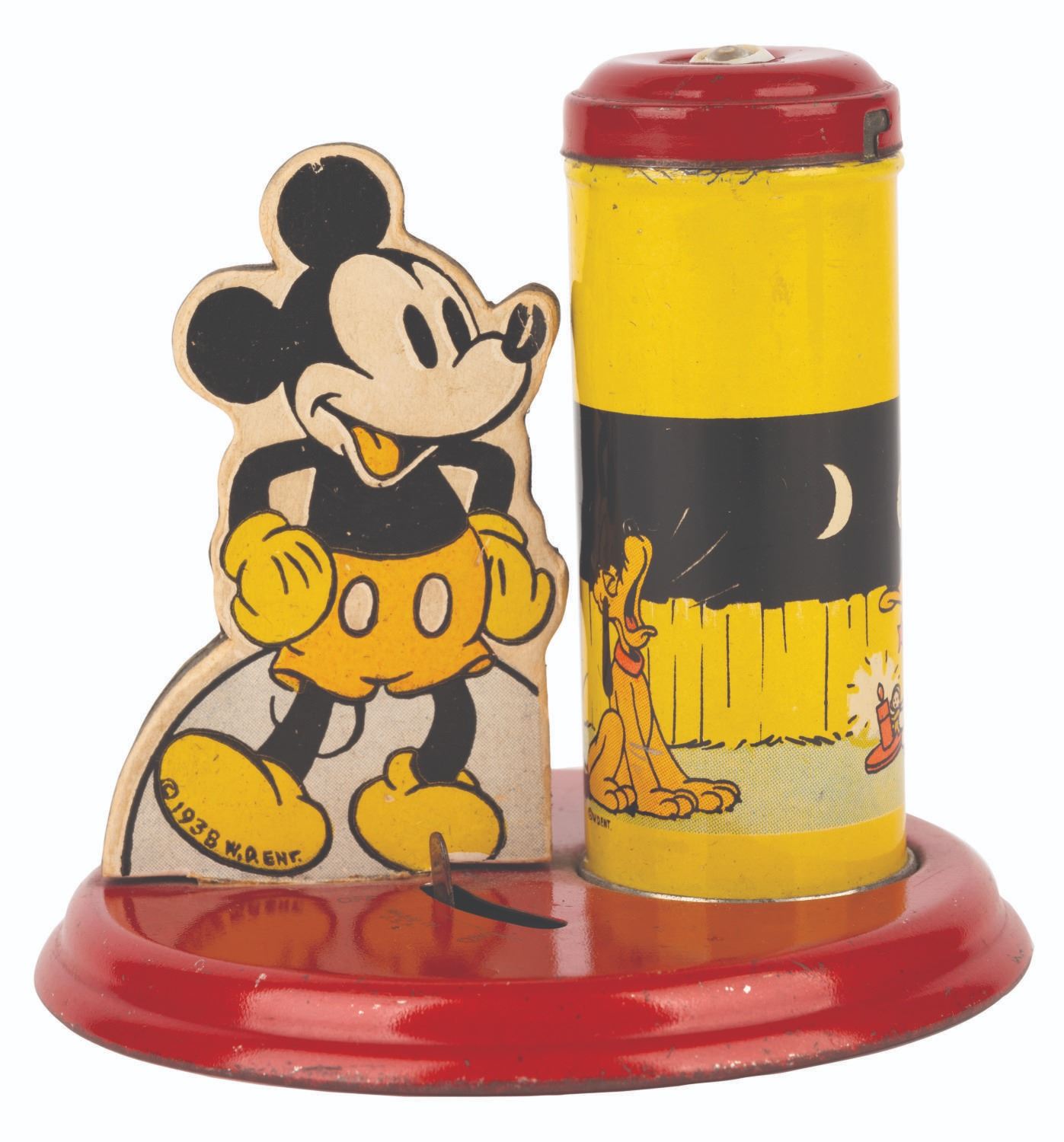 (Micro-Lite Co. Inc., 1938) A battery-operated Mickey Mouse night light manufactured by Micro-Lite Co., Inc. as part of their "Kiddy-Lites" series. The lamp is untested and will likely require service to function, as the required battery type is unknown. Measuring 3.5" tall, Mickey is in good condition with light spots of paint loss, scuffing, oxidation to the underside, and is missing the light-up portion of the fixture. The unit comes with a non-functioning, 1930s pocket flashlight that was used as a replacement for the original light.