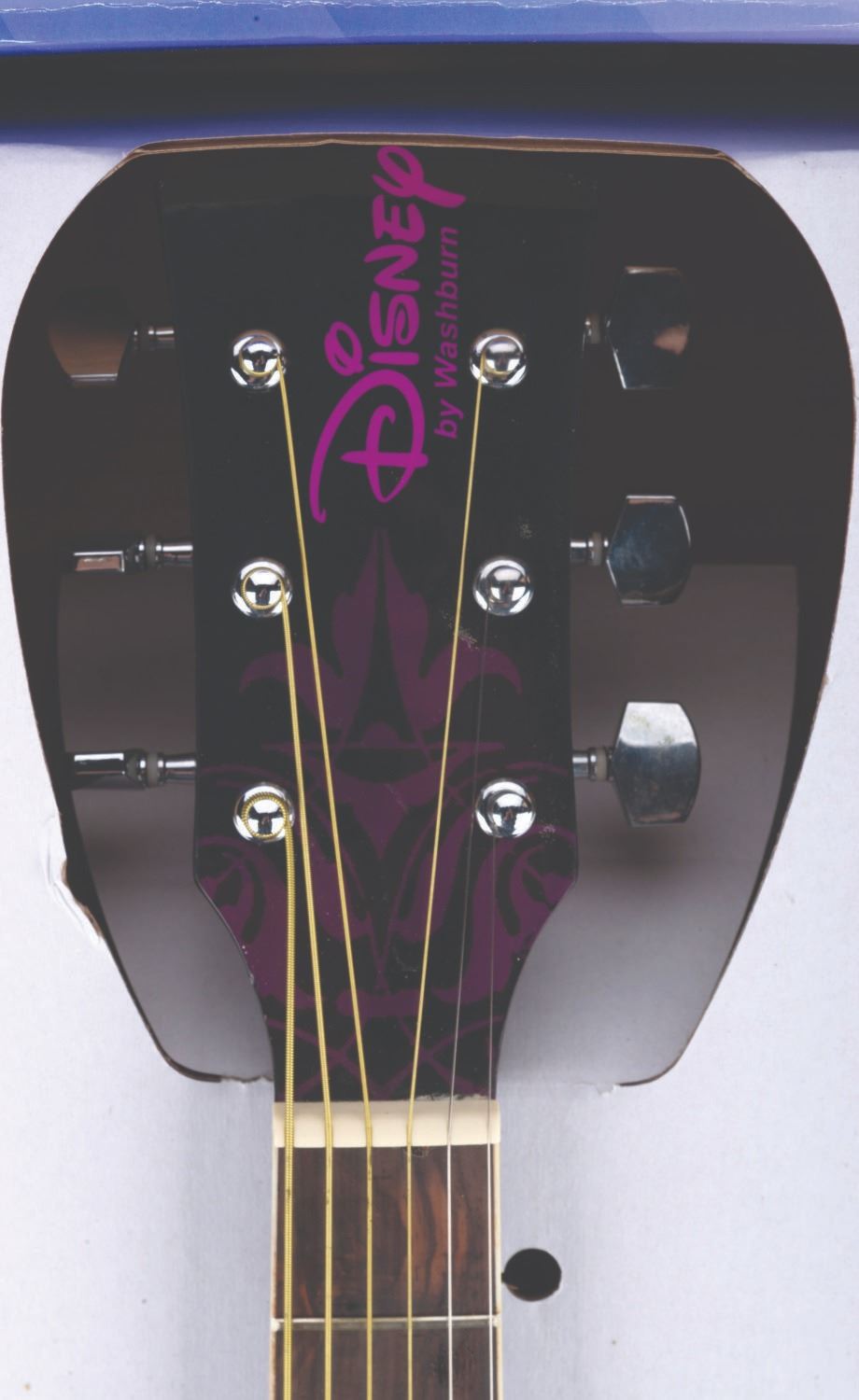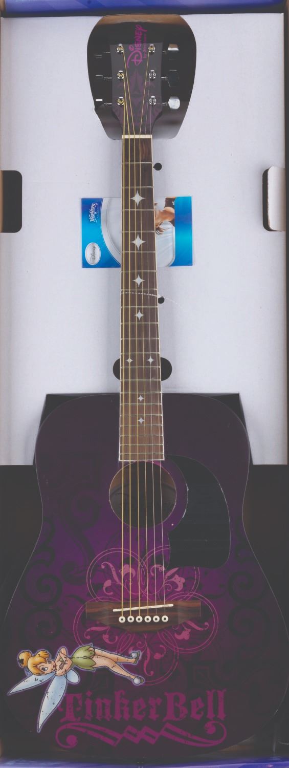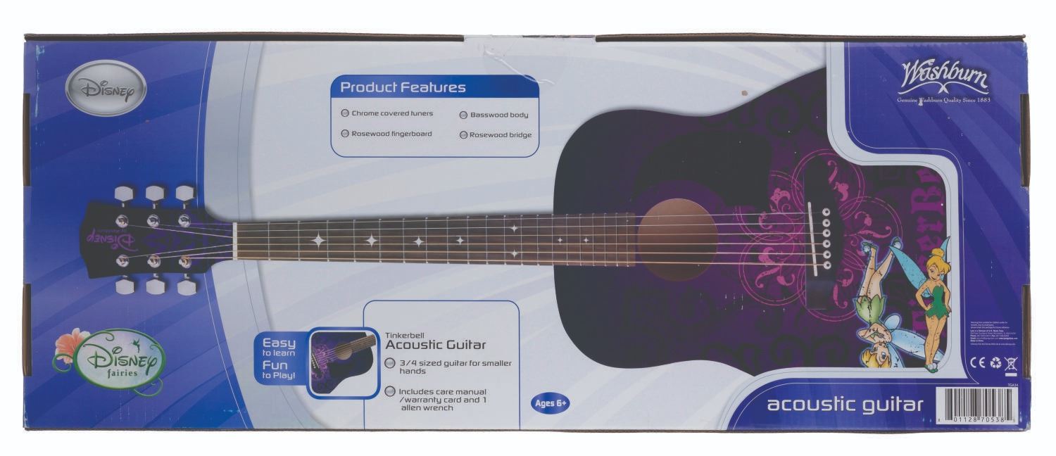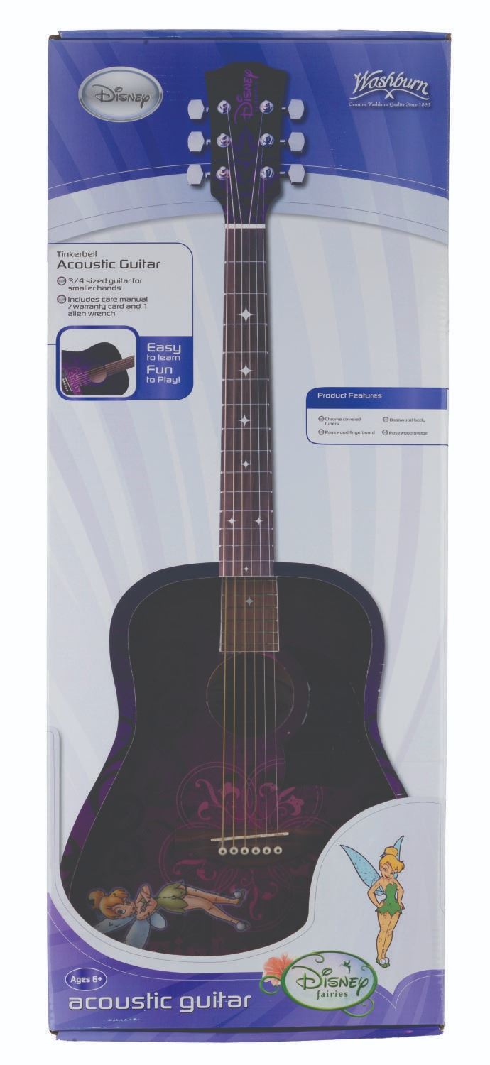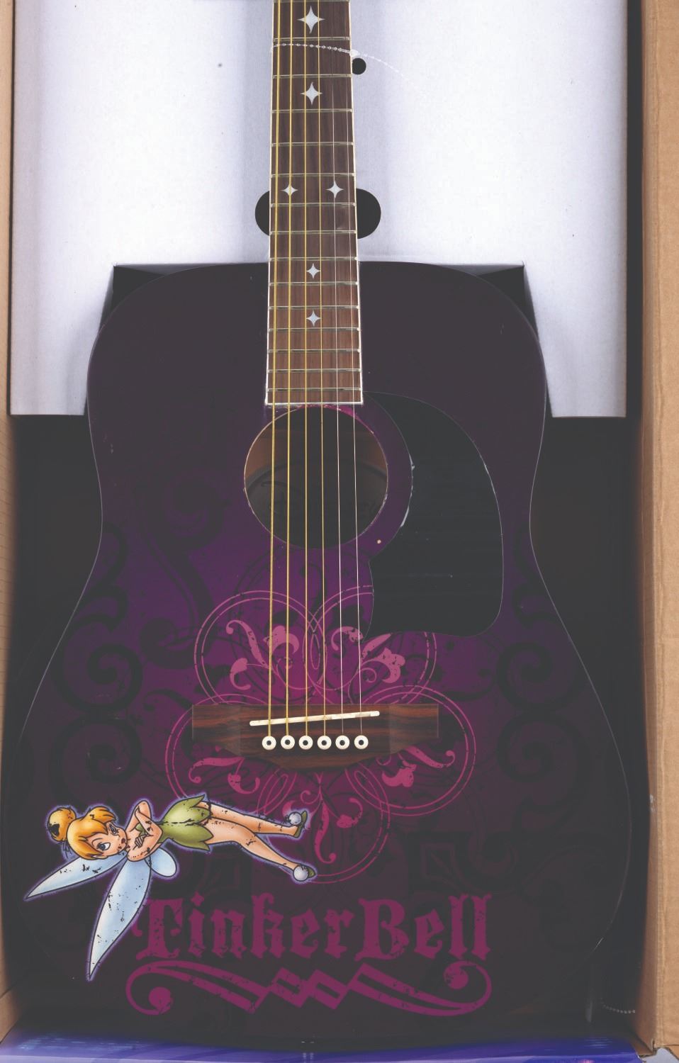 (Washburn, 2000s) A Disney Fairies"Tinkerbell" Acoustic Guitar manufactured by Washburn. Still in its original box, the three-quarter scale guitar is intended for smaller hands and features chrome-covered tuners, a basswood body, and a rosewood fingerboard and bridge. Measuring 24.25" x 4" x 36.5" tall in its original 14.75" x 5.25" x 38.25" deep box, the guitar is in very good condition with light surface scratches and intentional distress, while the box exhibits light wear.