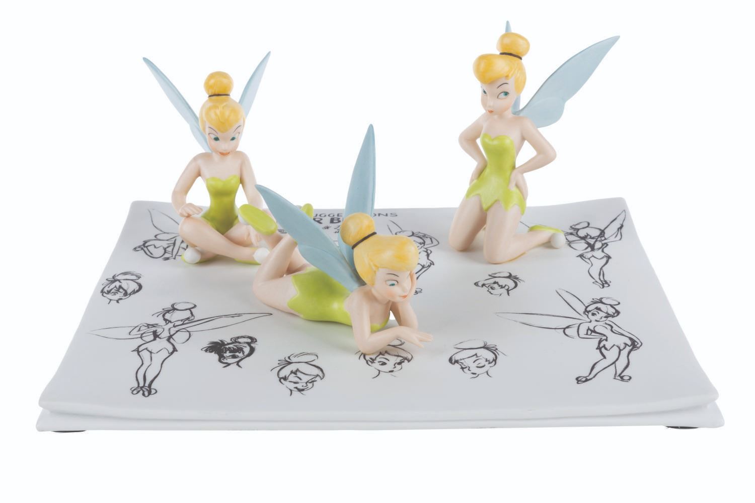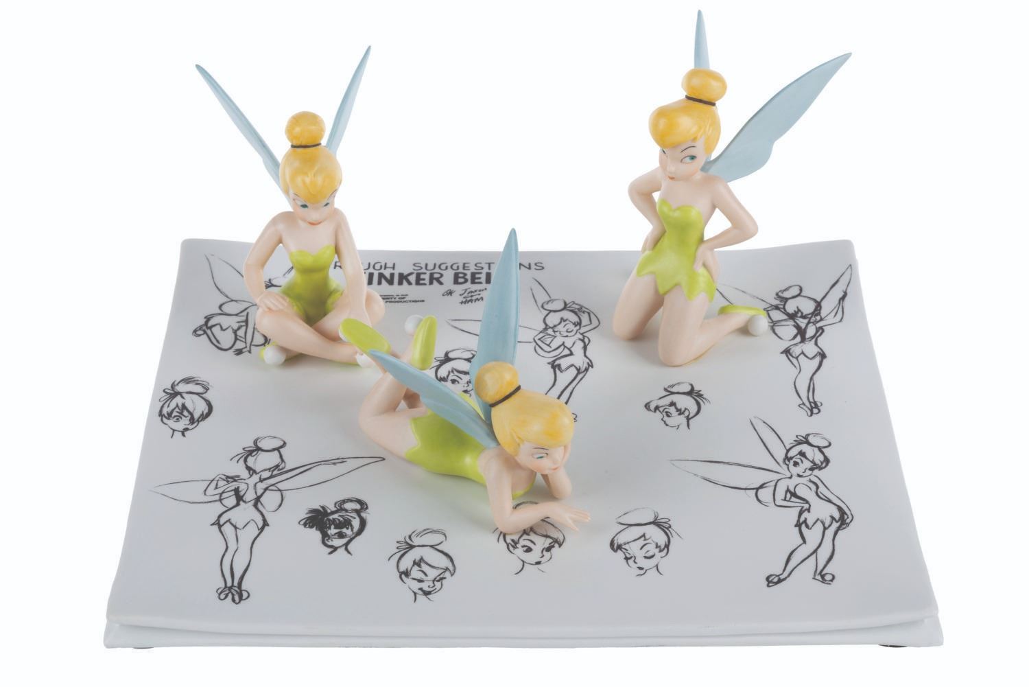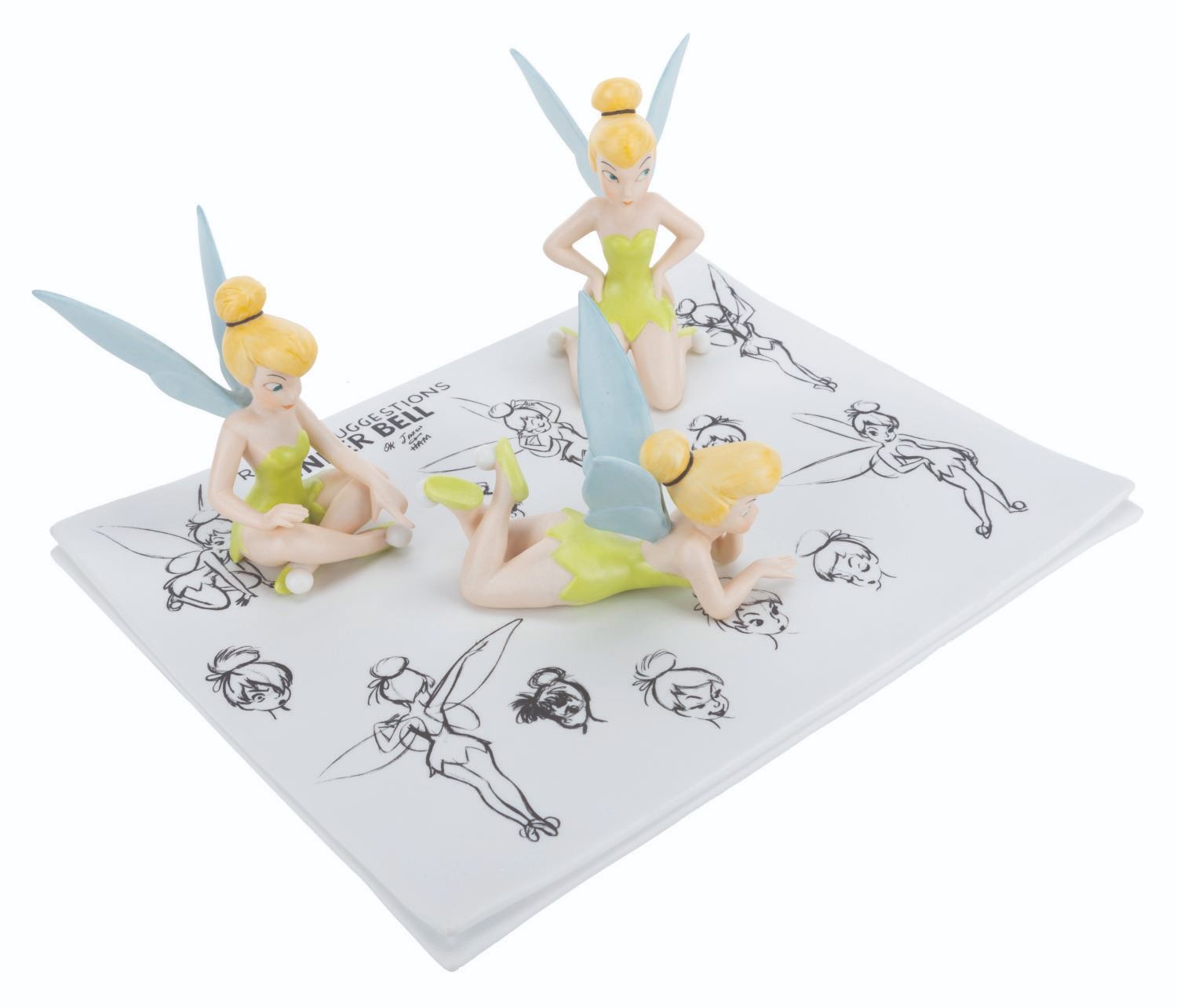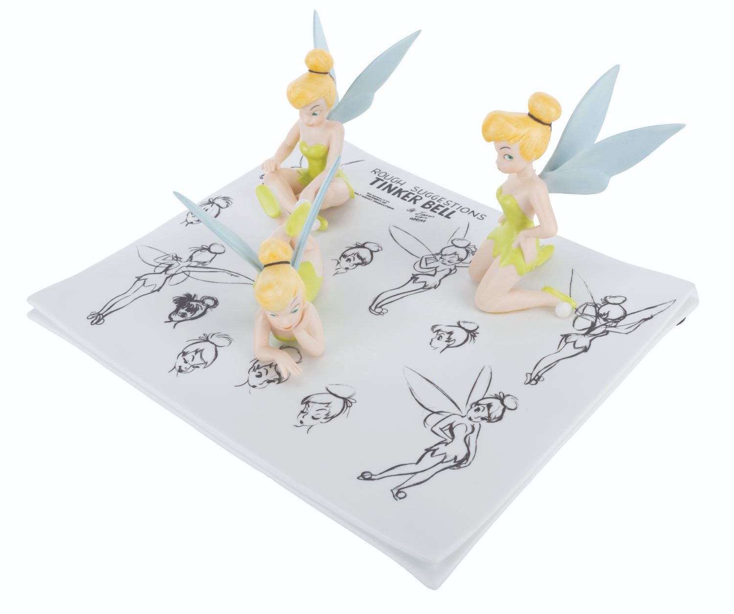 (Disney, 1990s) A ceramic figurine of Tinker Bell from "Peter Pan" depicting three poses of the pixie on the first rough model sheet for her appearance in "Peter Pan." This charming piece was produced exclusively for the Walt Disney Gallery, and is numbered 0641/3000. Measuring 8" x 10" x 4" high, the piece is in fine condition with the original box.