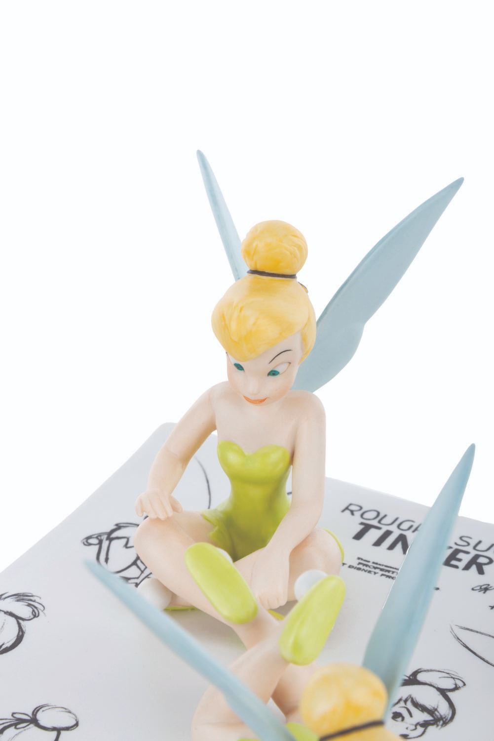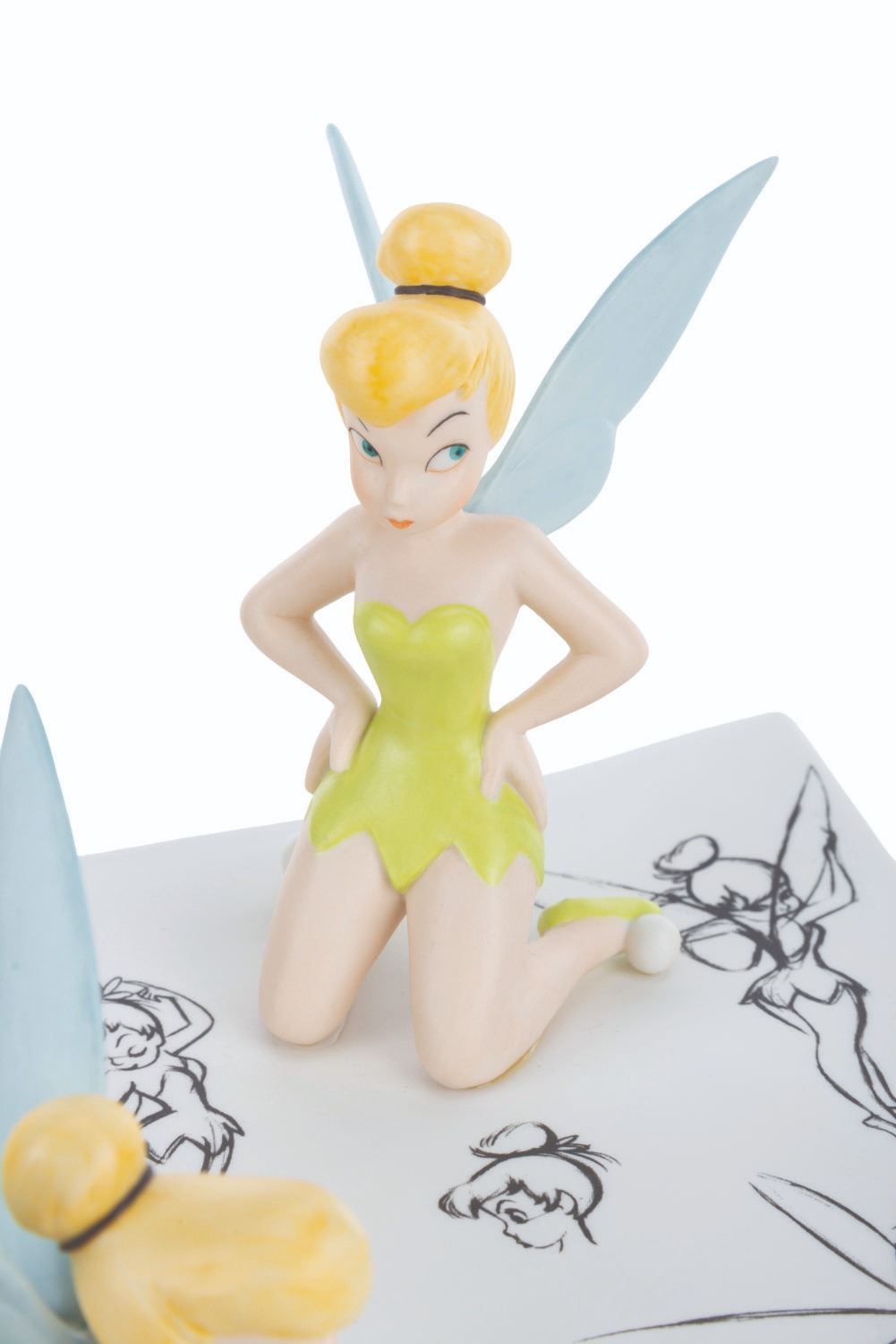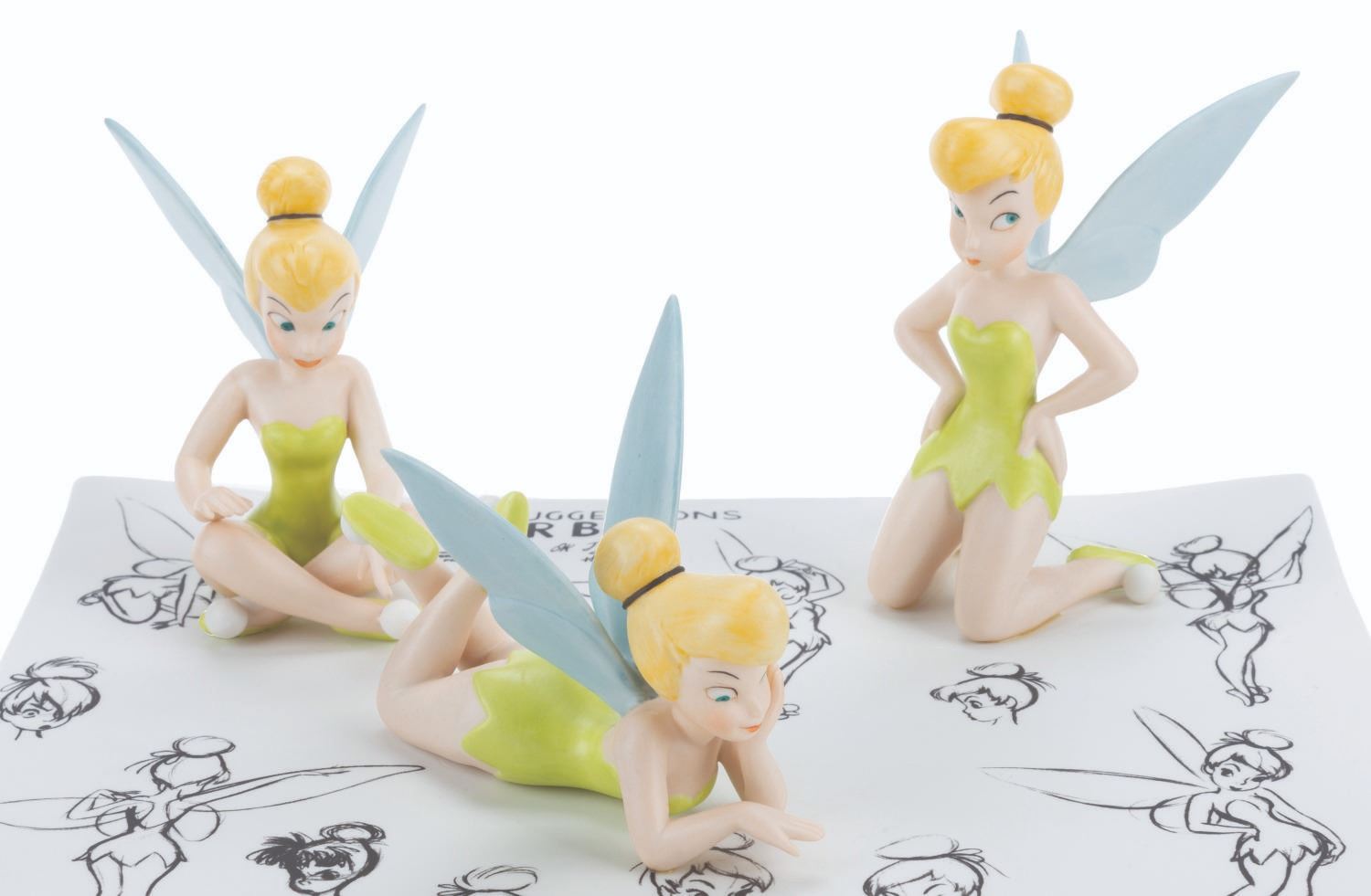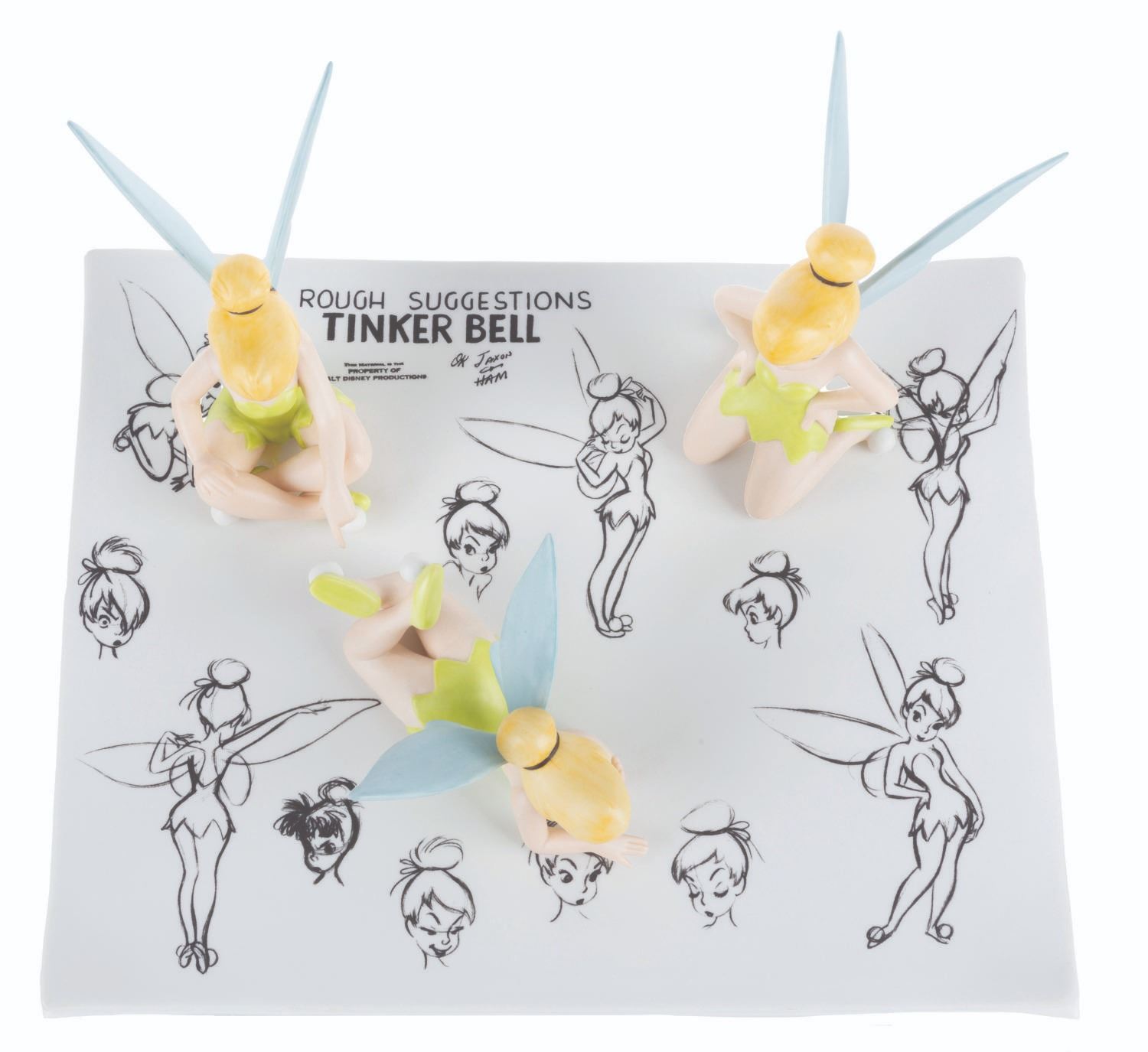 (Disney, 1990s) A ceramic figurine of Tinker Bell from "Peter Pan" depicting three poses of the pixie on the first rough model sheet for her appearance in "Peter Pan." This charming piece was produced exclusively for the Walt Disney Gallery, and is numbered 0641/3000. Measuring 8" x 10" x 4" high, the piece is in fine condition with the original box.