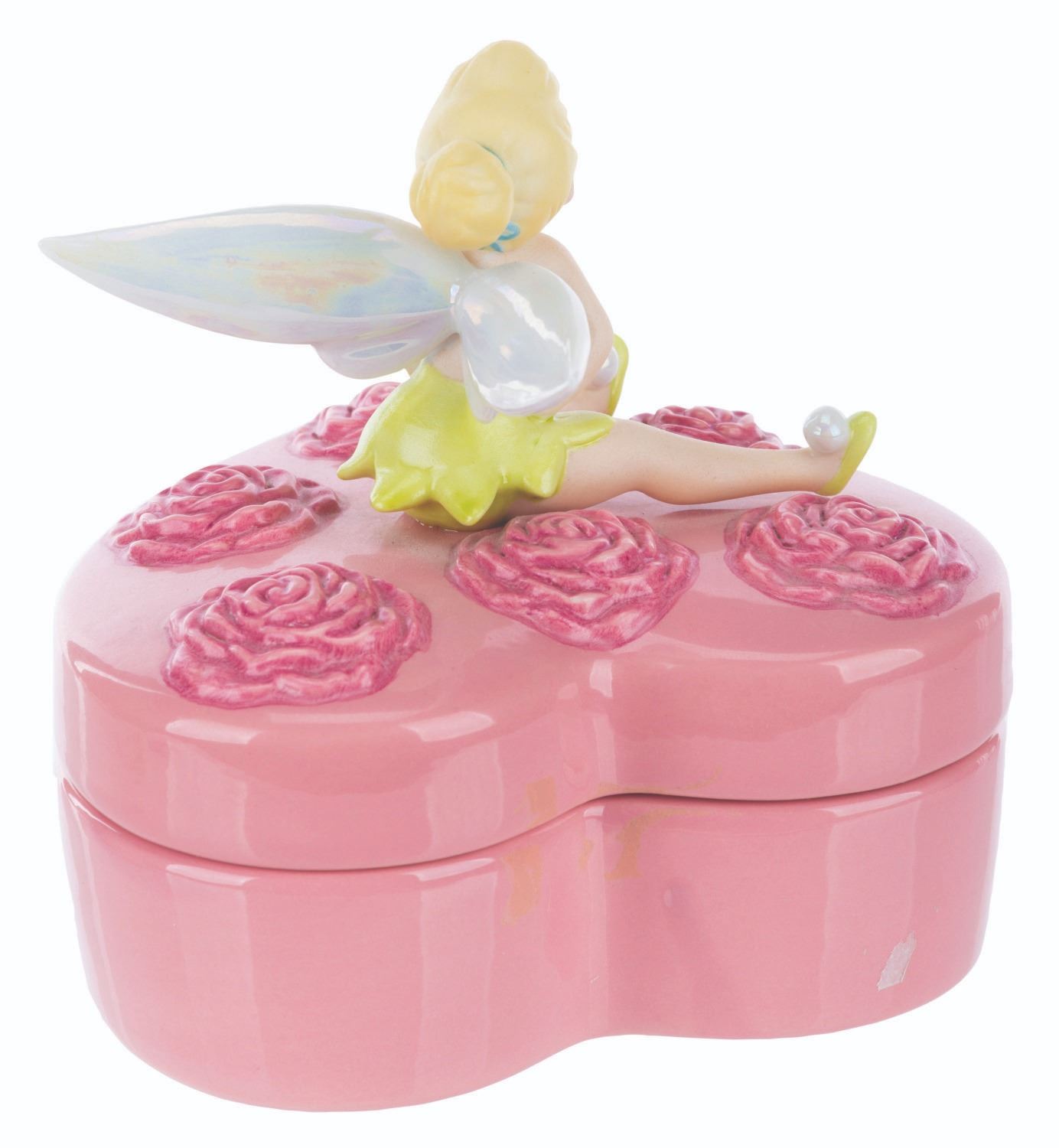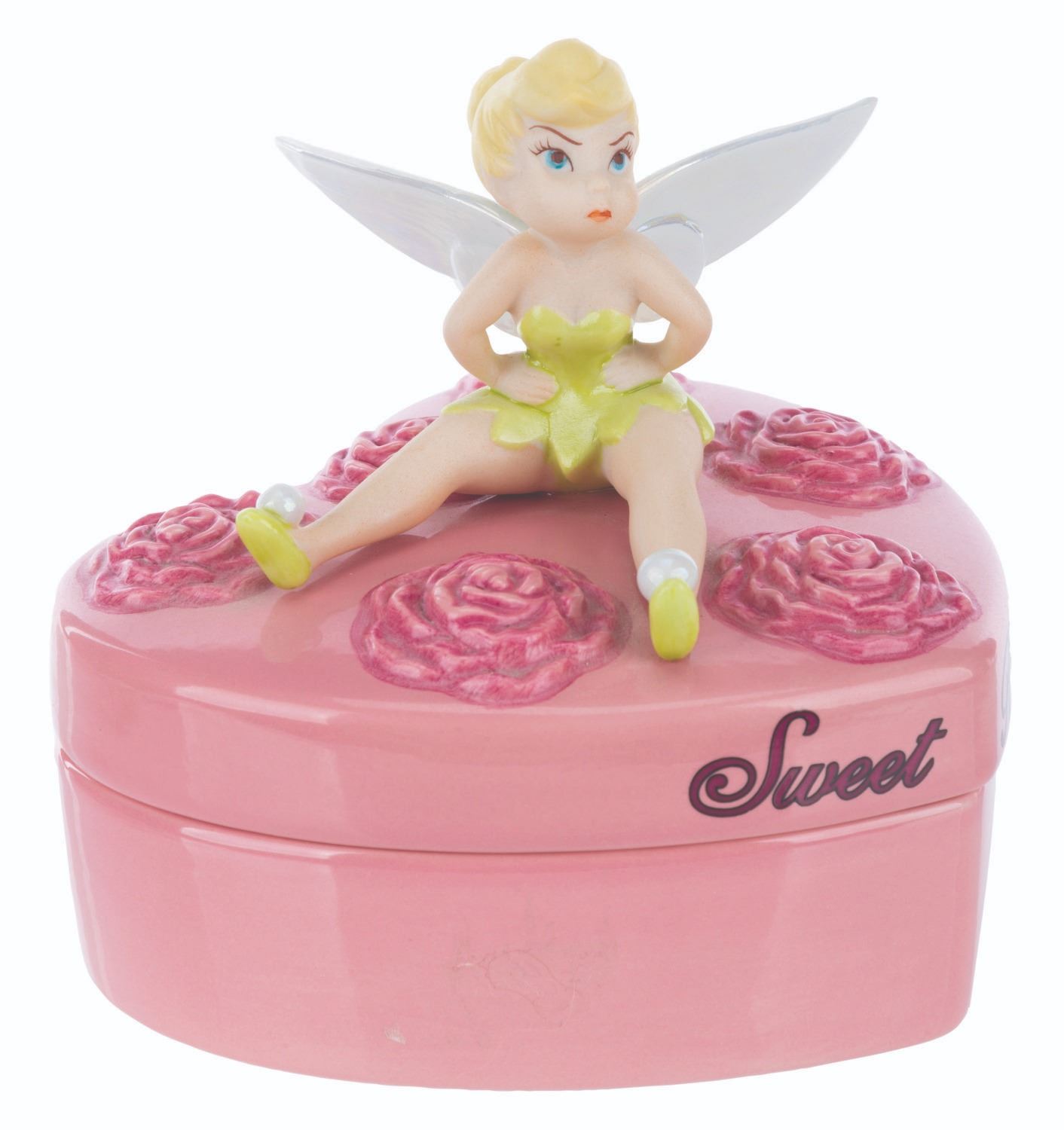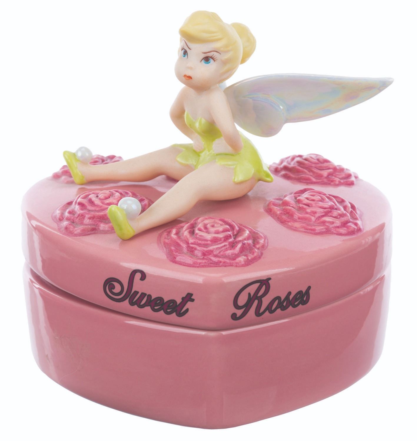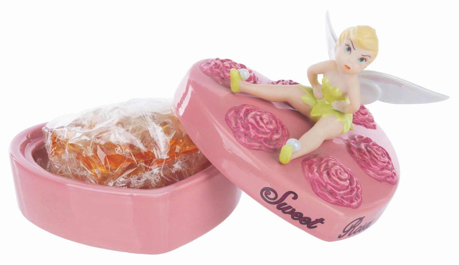 (Disney, 2021) A ceramic Tinker Bell Sweet Roses trinket box sold at the Disney Store in Japan. Inside the heart is an unopened set of Disney Store-branded sweets. The unopened sweets are for collecting purposes only and not for consumption. Measuring 4” tall and 4.25” in diameter with its original 5.75” x 6.5” x 4.5” tall packaging included, the trinket box displays in very good condition with light sticker residue around the base.
