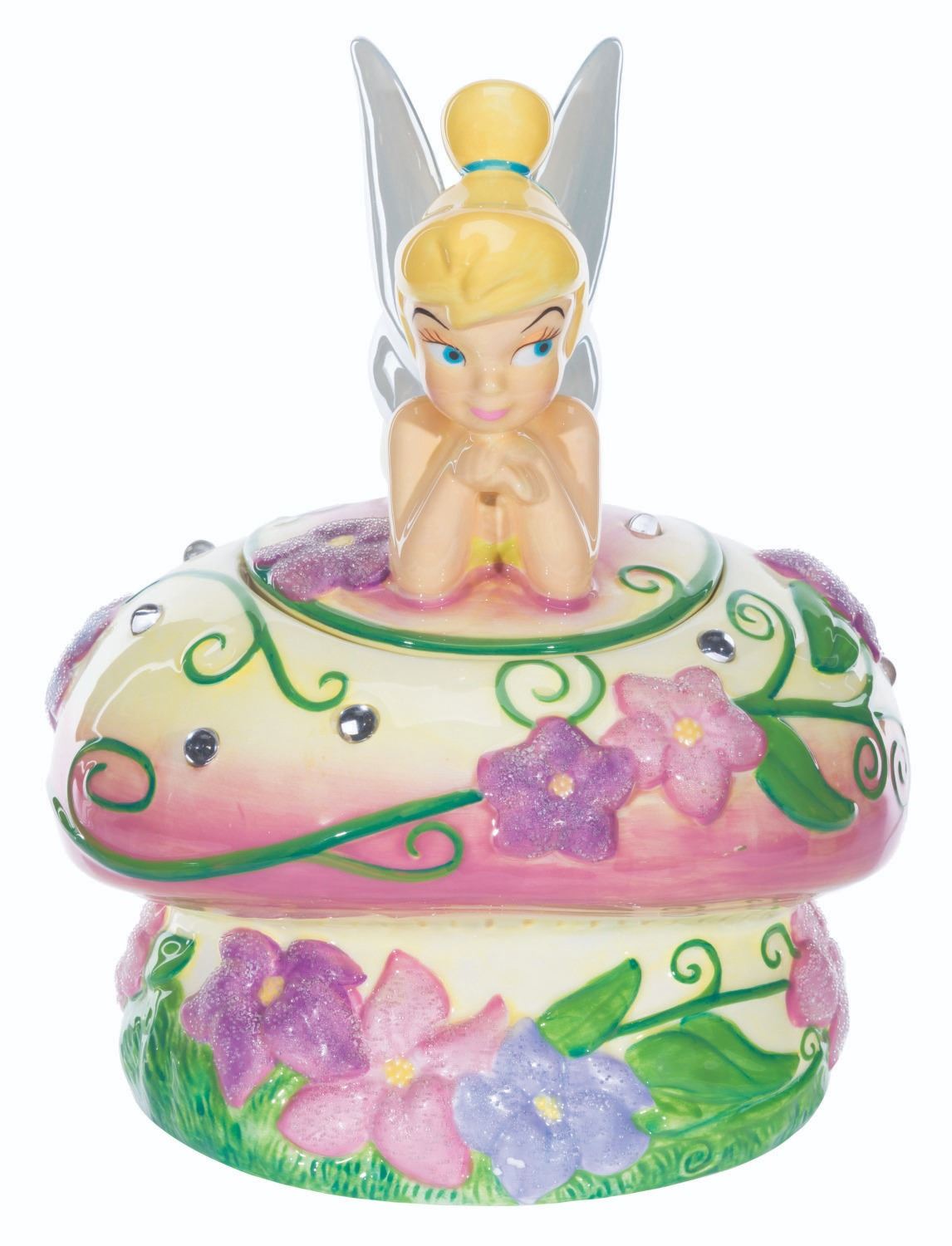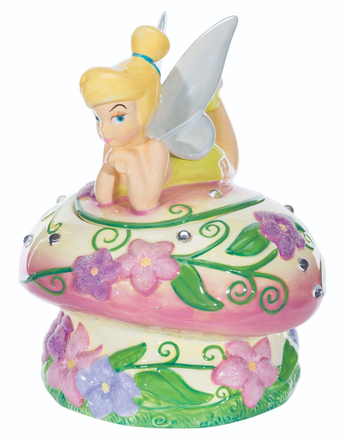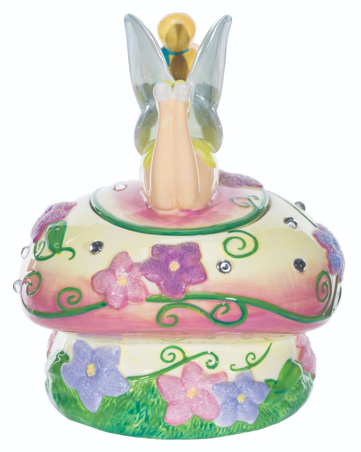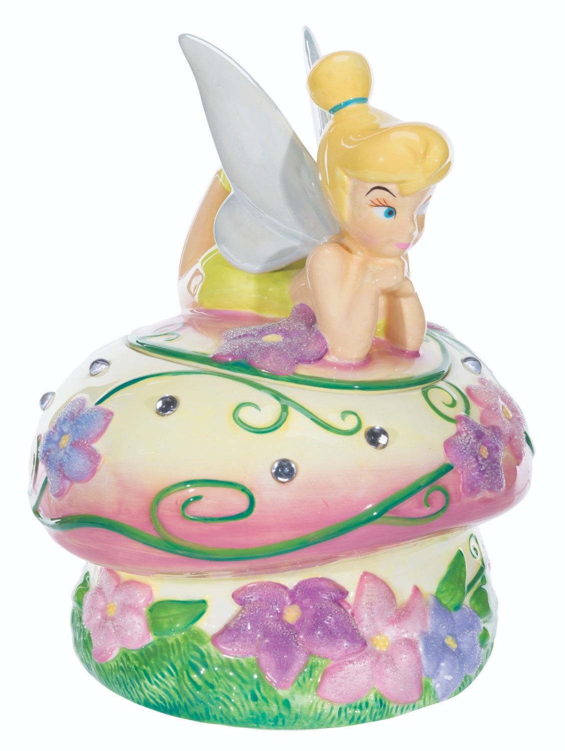(Disney, 1990s-2000s) A figural ceramic cookie jar of Tinker Bell on a mushroom. Measuring 9.5" x 9.5" x 11.5" tall, the cookie jar is in fine condition.