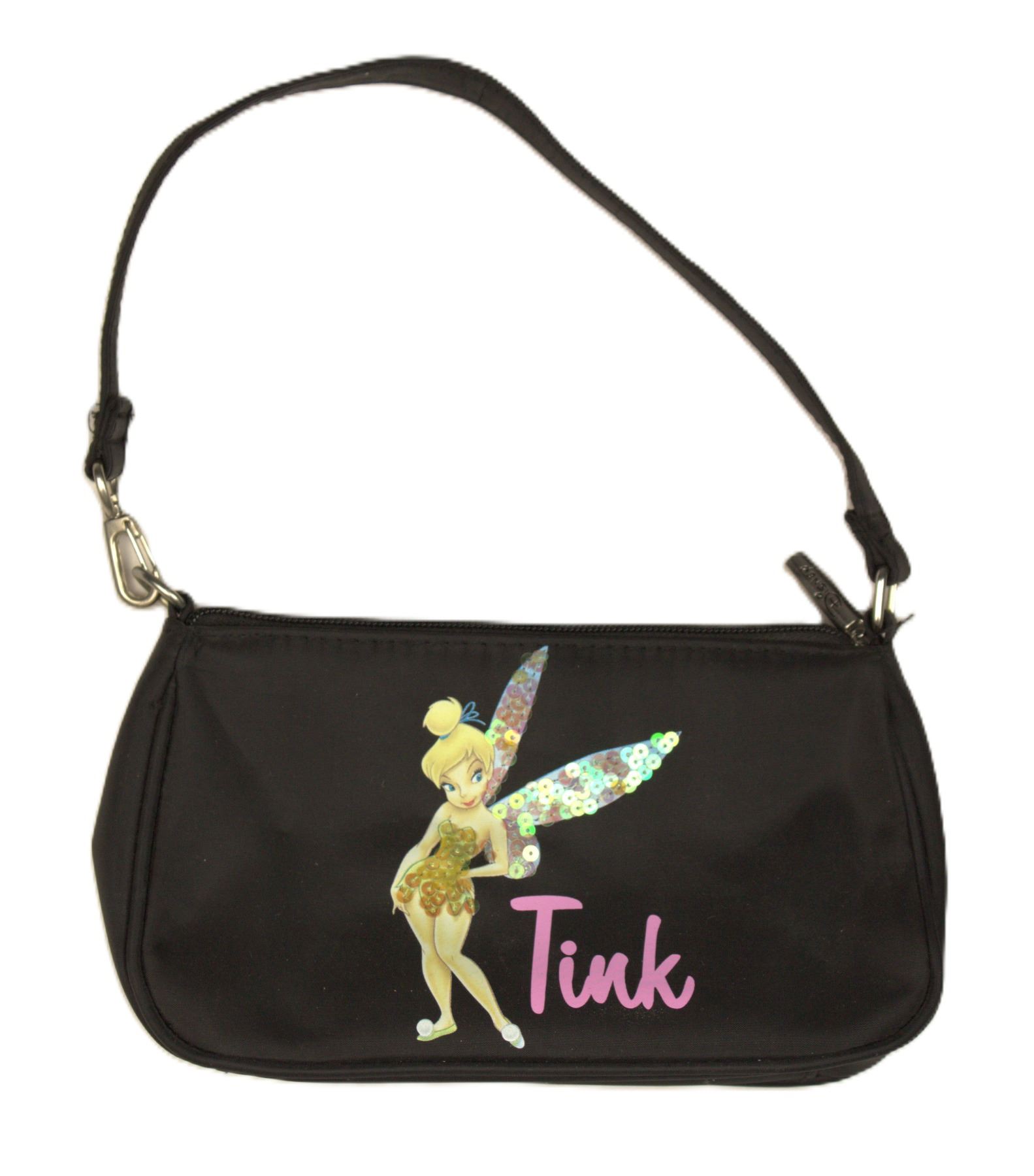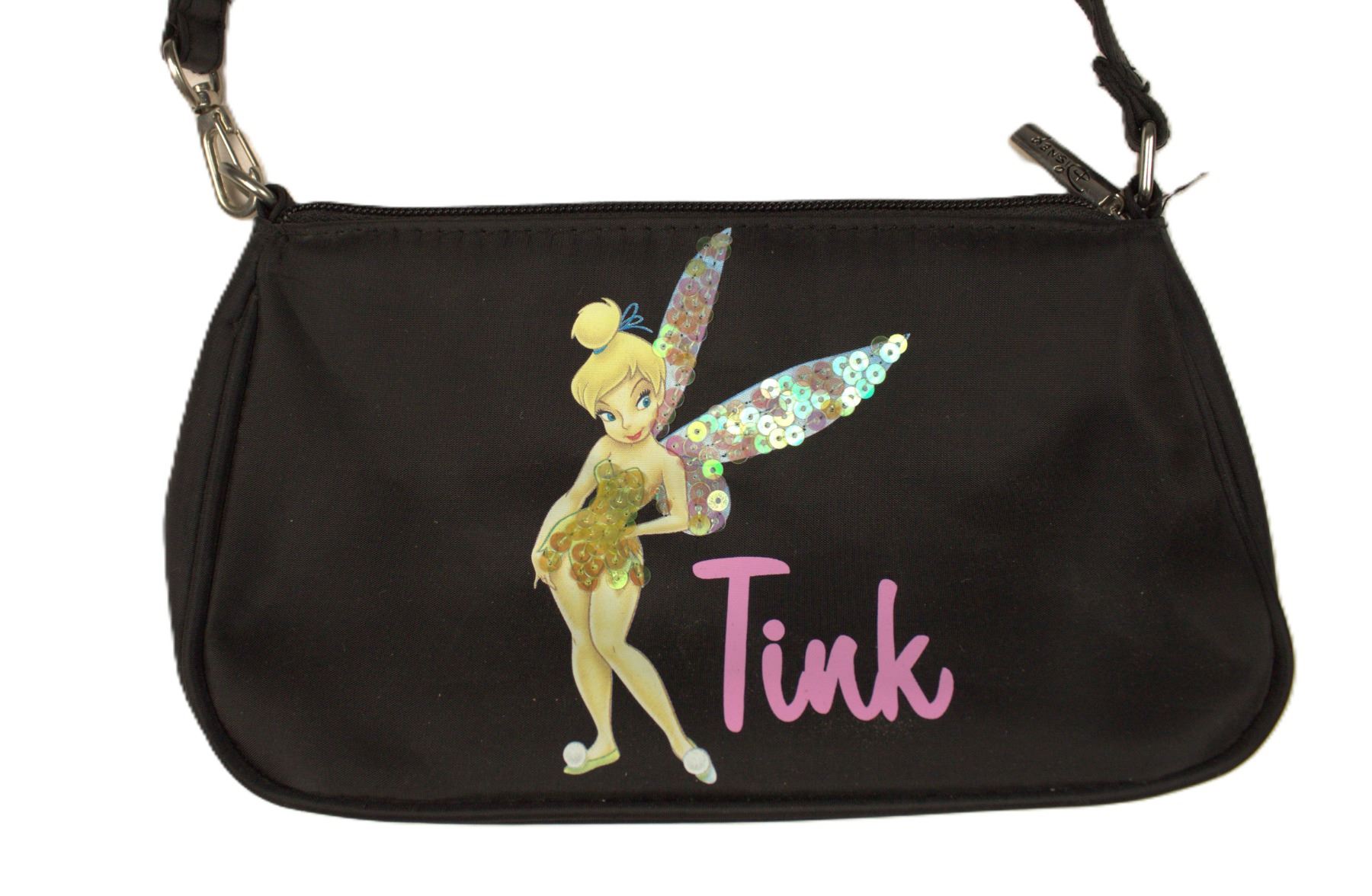 This black Tinker Bell handbag is in like new condition. It features and image of Tinker Bell with sequinned wings and outfit. The name Tink is written in pink cursive letters to her right. It bears a Disney tag on the inside along with a zippered pocket.