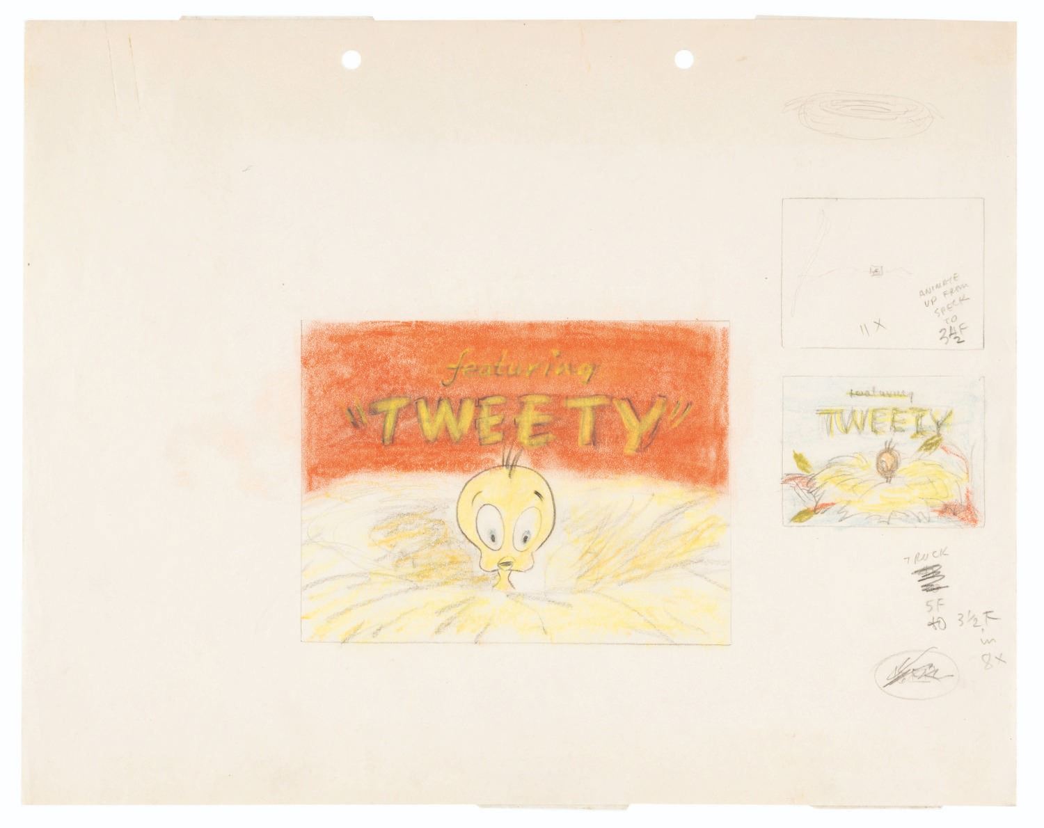 (Schlesinger, 1944) An original title card concept drawing for the Merrie Melodies short “Birdy and the Beast,” directed by Bob Clampett. Although it was his second short film, this cartoon is significant for giving the previously unnamed bird the name “Tweety.” Measuring 9.5” x 12” overall, with three thumbnail sketches ranging from 1.75” x 2.25” to 4” x 5” the graphite and colored pencil drawing is in good condition with light edge wear and creasing from production use, sections of tape along the edges of the reverse, and light discoloration from age.