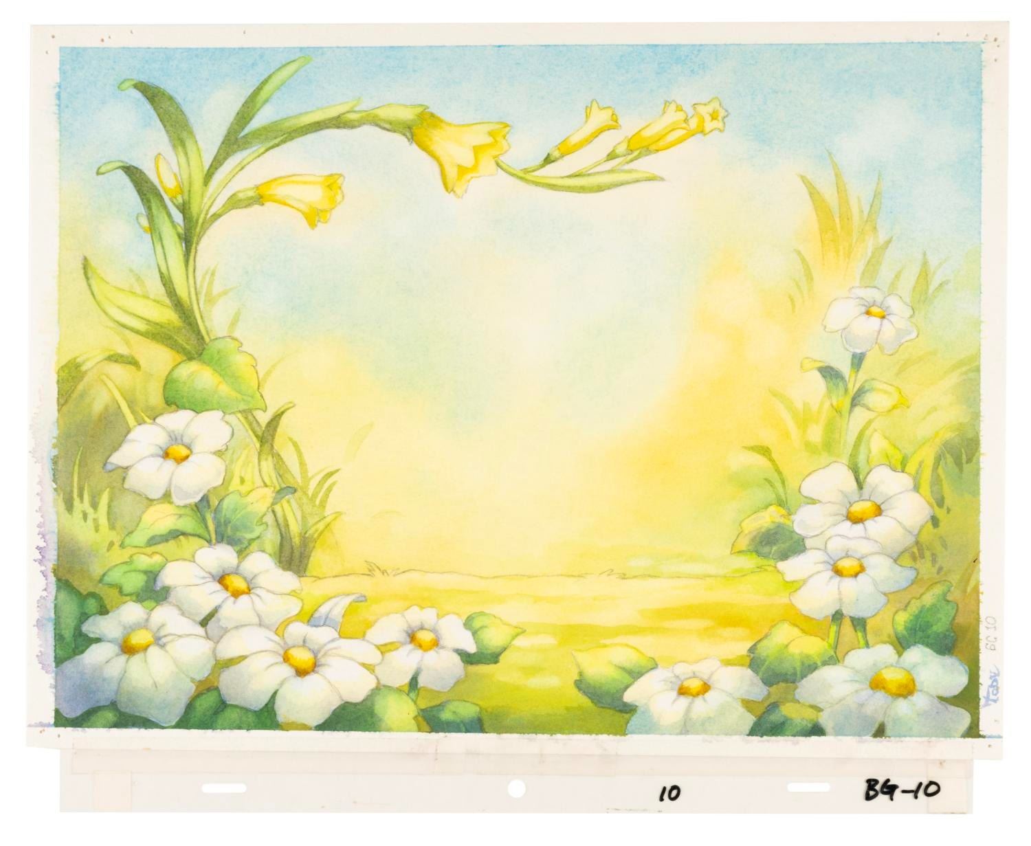 (Bluth, 1960s-80s) An original watercolor production background by artist Toby Bluth from an unknown animated production. With an image size of 9.5” x 12.5” on a 10” x 13.5” piece of cotton paper, the art is in very good condition with heavy pinholes at the corners and color bleeding into the border.