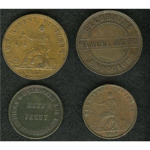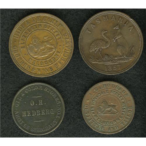 <B>A Token quartet including:</B></I> O.H. Hedberg Halfpenny ND, KM-Tn87, VF with a reverse rim nick; Samuel Henry Penny 1857, KM-Tn102, A-226, VF-XF with rim bumps; Hide & De Carle Penny 1857, KM-Tn104, A-230, VF; and an A.G. Hodgson Halfpenny 1860, KM-Tn107, A-256, VF details with rather large rim dings. <B>A sold as is, no return lot.</B></I>