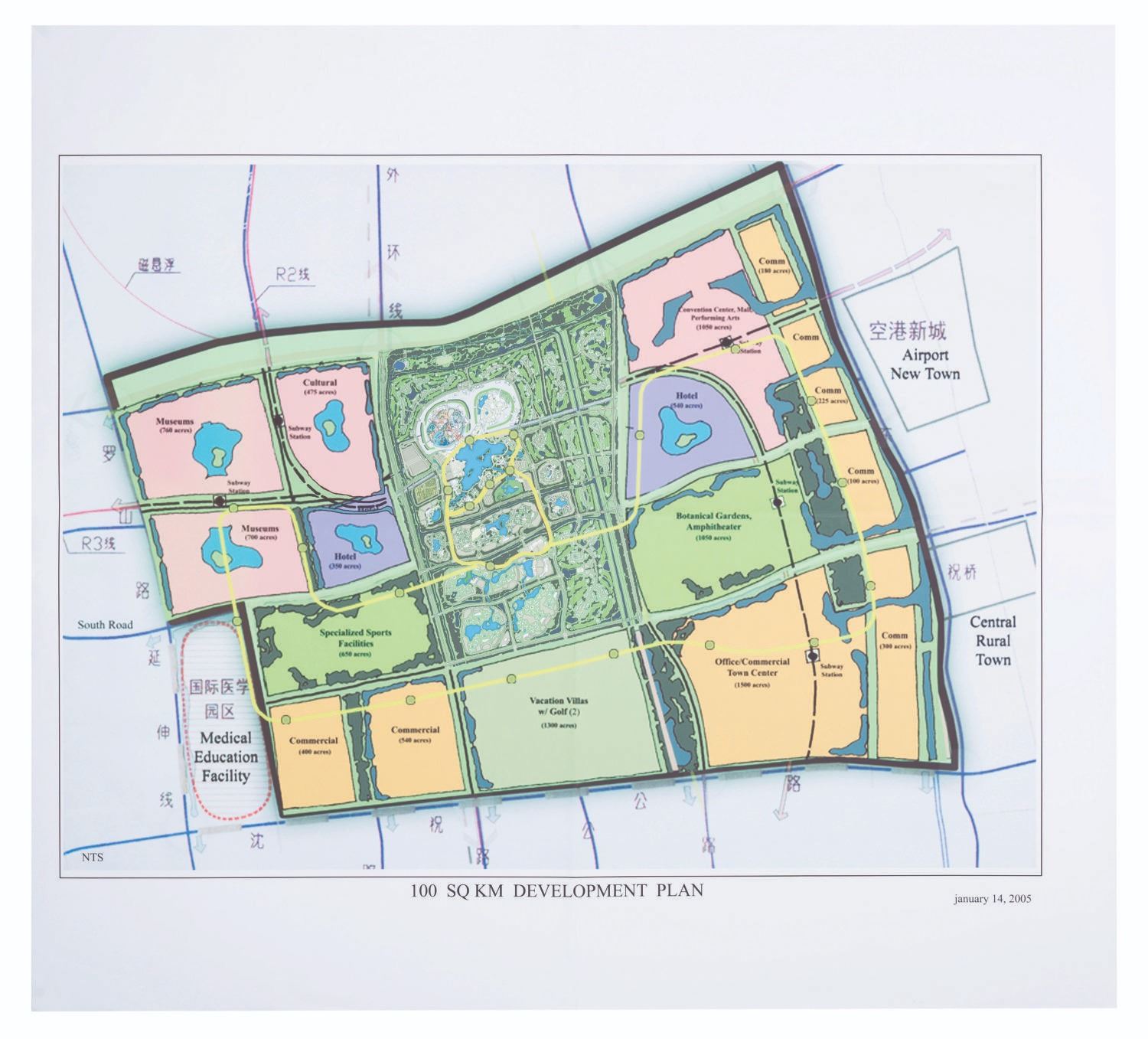 (WDI, 2005) A Walt Disney Imagineering development plan for 100 square kilometers in China, dated January 14, 2005. The plan, likely for Hong Kong Disneyland or Shanghai Disneyland, places the Park at the center of hotels, museums, public parks, and community centers. Measuring 36" x 39.5", the site plan is in good condition with light wear and creases along the edges and folds.