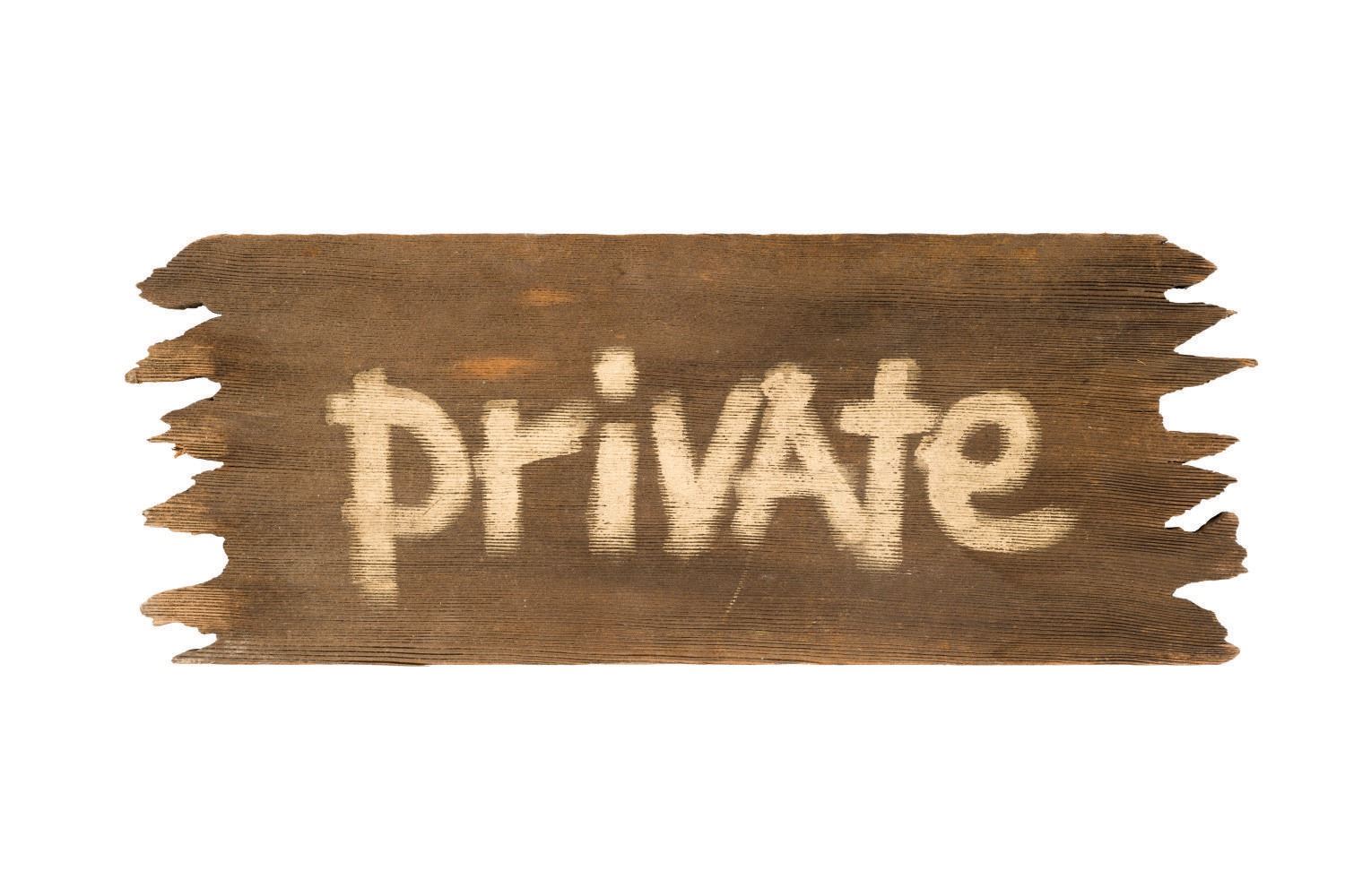 (Disneyland, 1980s-90s) A Tom Sawyer Island Area "Private" sign. The hand painted wooden sign was once posted on Tom sawyer Island in Frontierland. Measuring 29"x11.25", the sign is in very good condition with scuffs, scratches, and wear from exposure, display, and age.