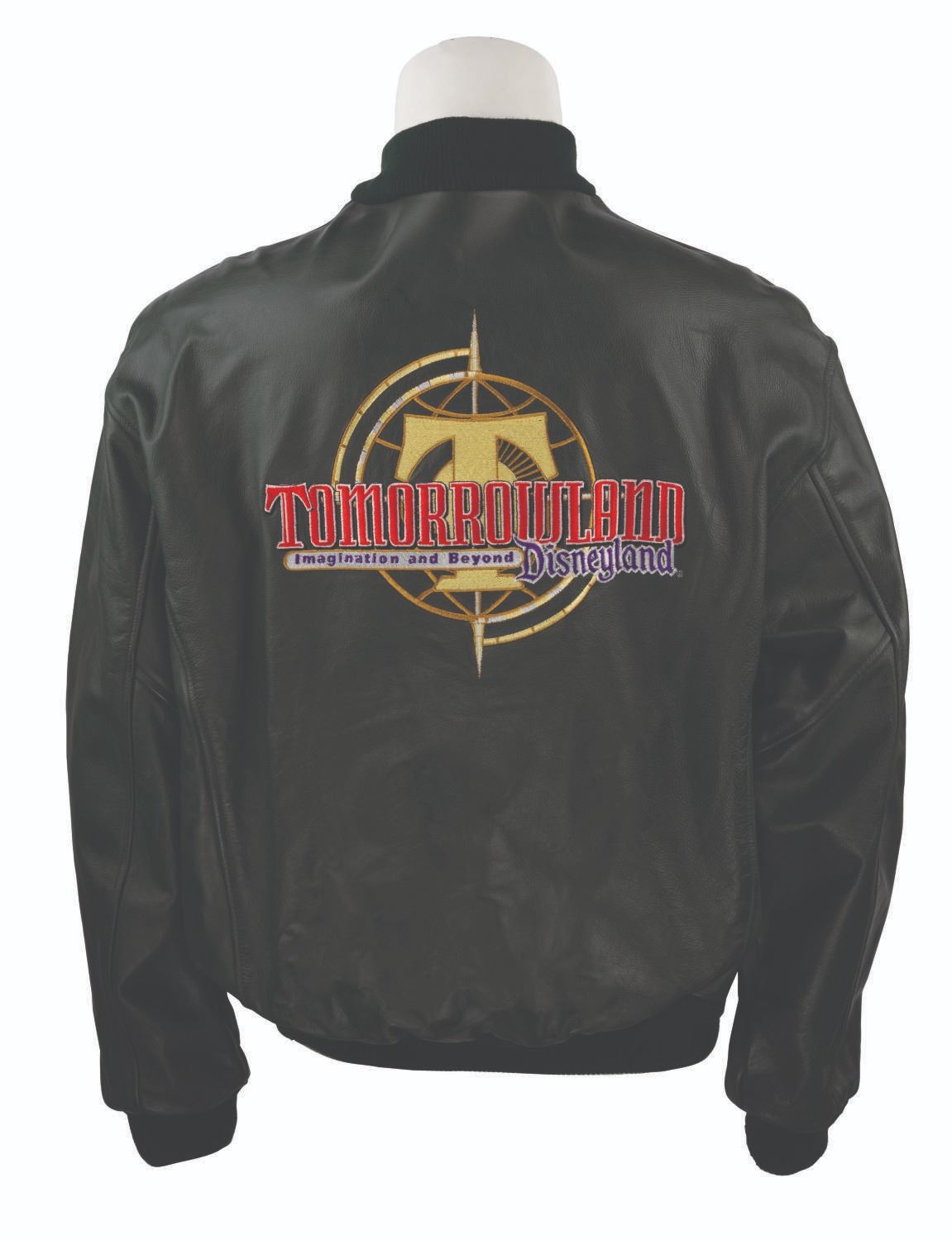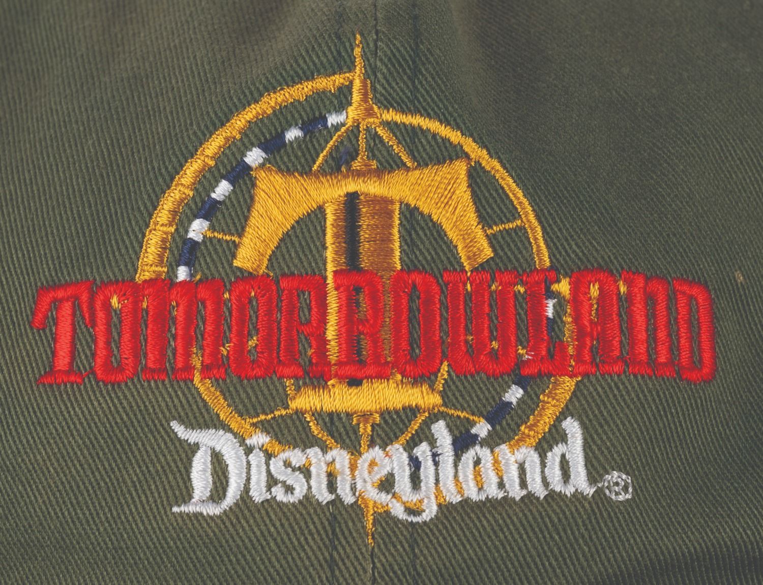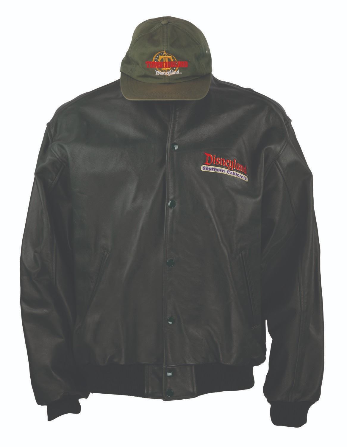 (Disneyland, 1998) A green souvenir jacket and hat commemorating the Tomorrowland relaunch at Disneyland. The jacket measures a size XL and the hat is adjustable. Each piece is in good condition, the hat exhibiting fading and staining to its sweatband, and the jacket exhibiting fading, pilling, scuffs, and light wear from handling and age.