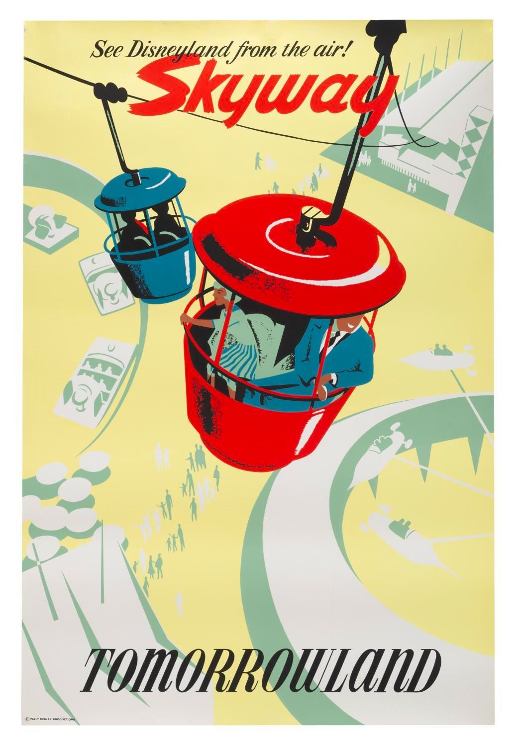 (Disneyland, 1956) An original hand-silkscreened poster for the Skyway over Tomorrowland. Designed by Bjorn Aronson, this poster features the Skyway overlooking several early landmarks like the Autopia, AstroJets, and unbuilt Airboats attraction. Measuring 36" x 54", the poster is in very good condition with light edge wear including faint scuffs at the top corners, and light tape residue and a faint water stain visible on the top back edge.