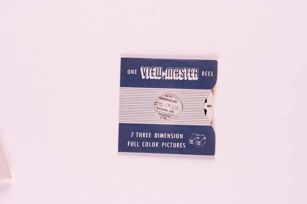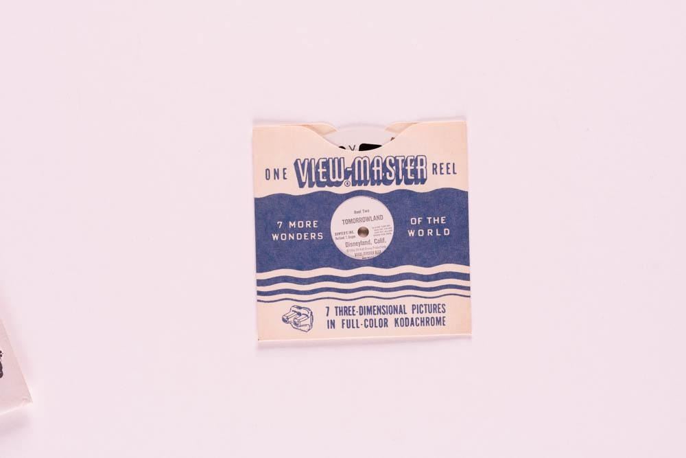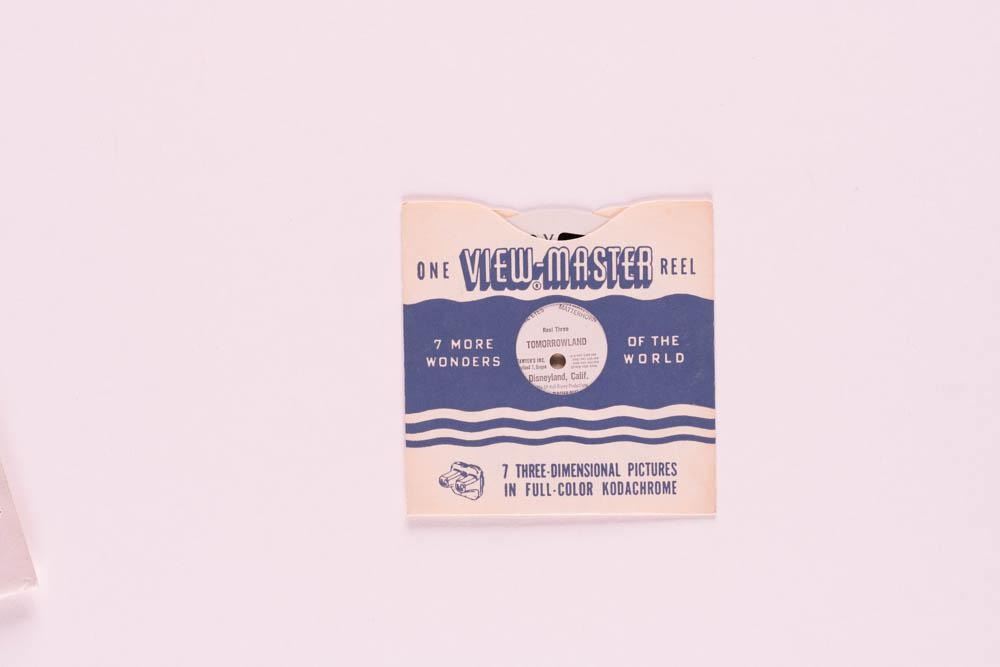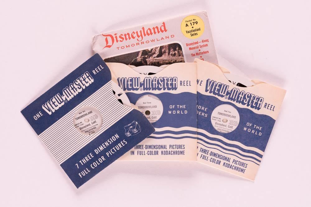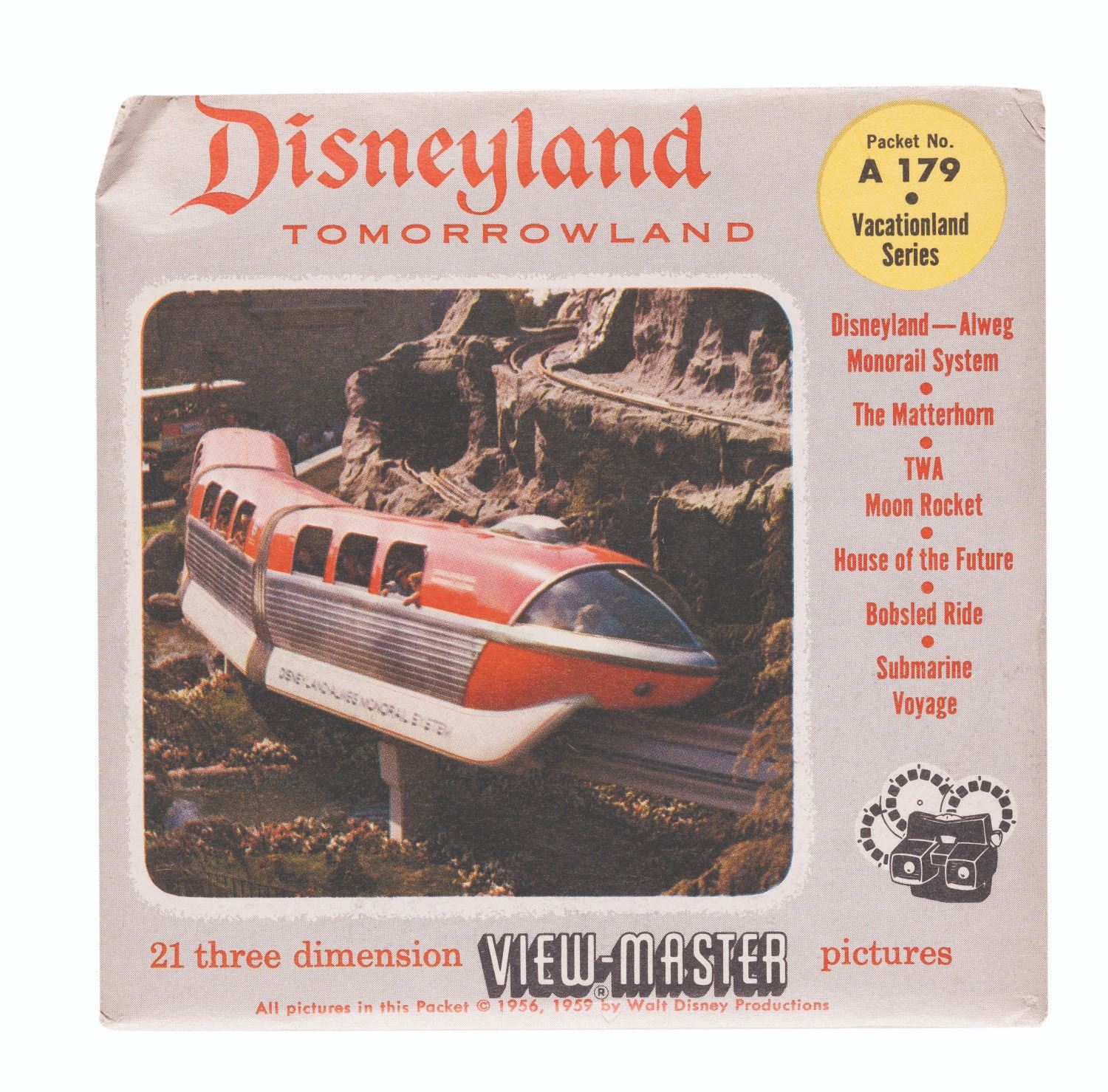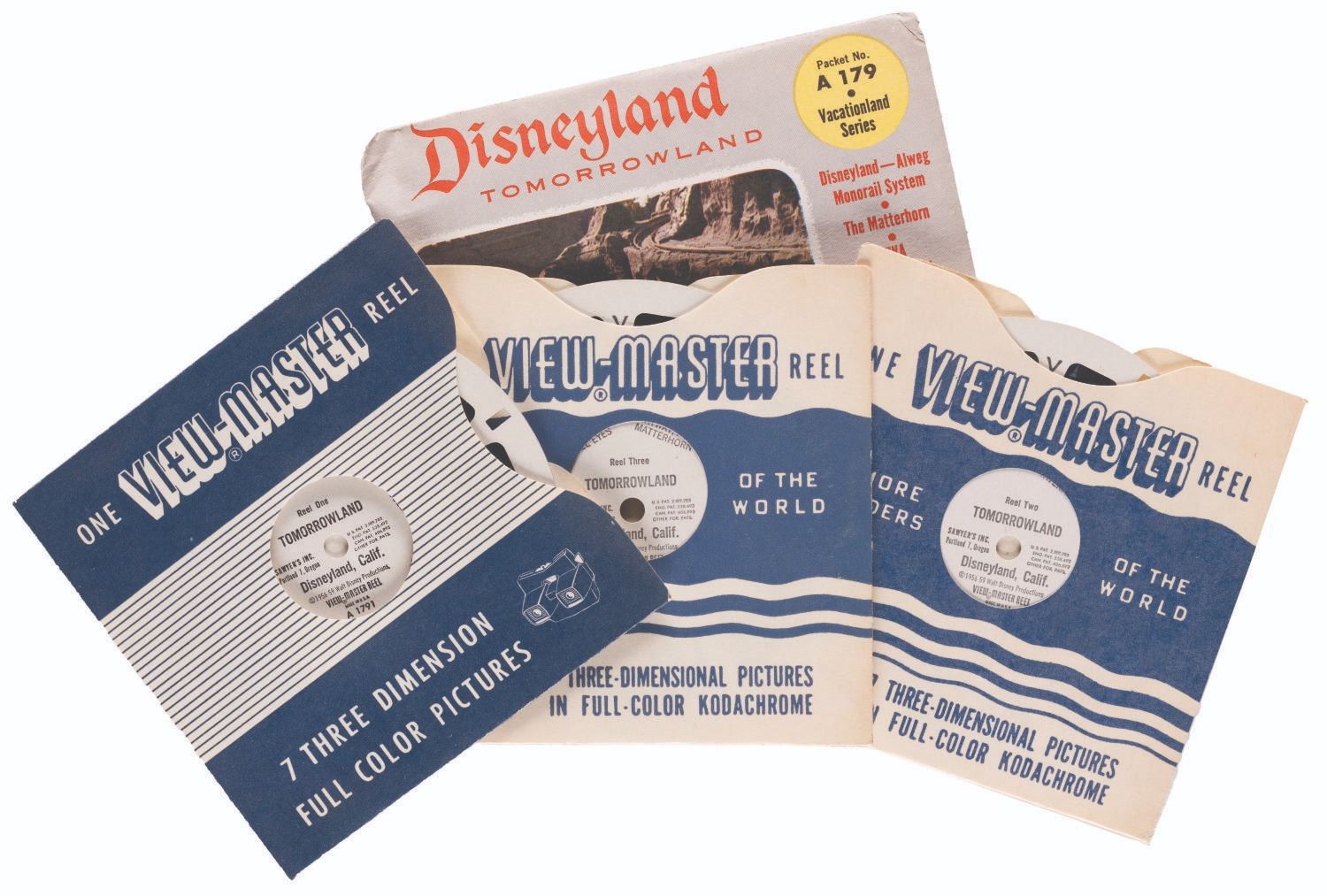 (Disneyland, 1956-59) A rare Disneyland Vacationland Series Tomorrowland View-Master 3-disc set. Among the 21 color stereo pictures are the brand new, three-car Monorail Red train, Monsanto House of the Future, and Motor Boat Cruise. Measuring 4.5" x 4.5", the package has been opened but all contents are accounted for and in very good overall condition, with minor creases and wear and slight fading to the package cover.