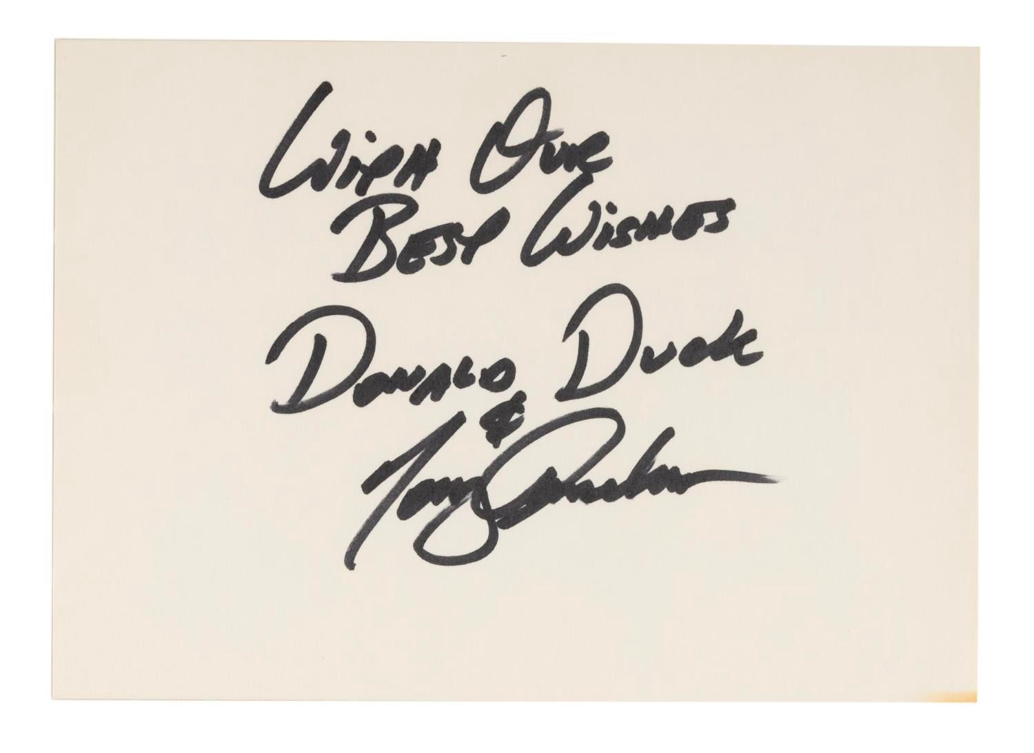 (Disney, 1995) A card signed by Tony Anselmo, the voice of Donald Duck, at the 1995 Disneyana Convention. Handpicked by the original Donald Duck voice artist Clarence Nash, Tony is still the official voice of Donald today. Measuring 5” x 7”, the signed card is in fine condition.